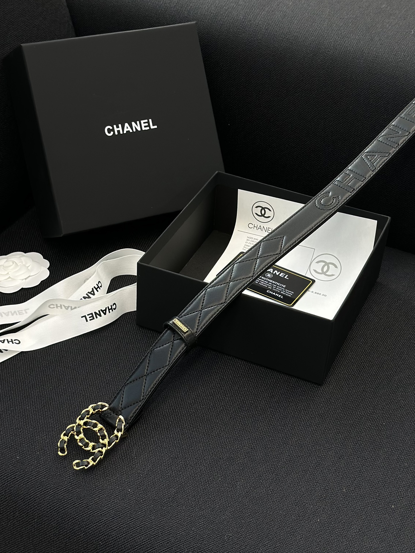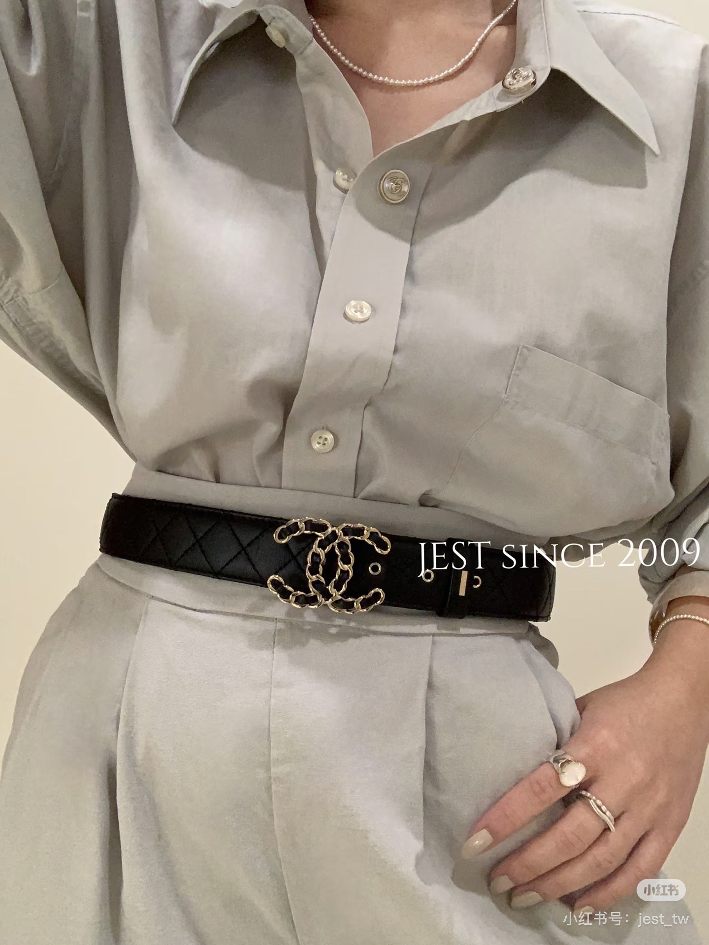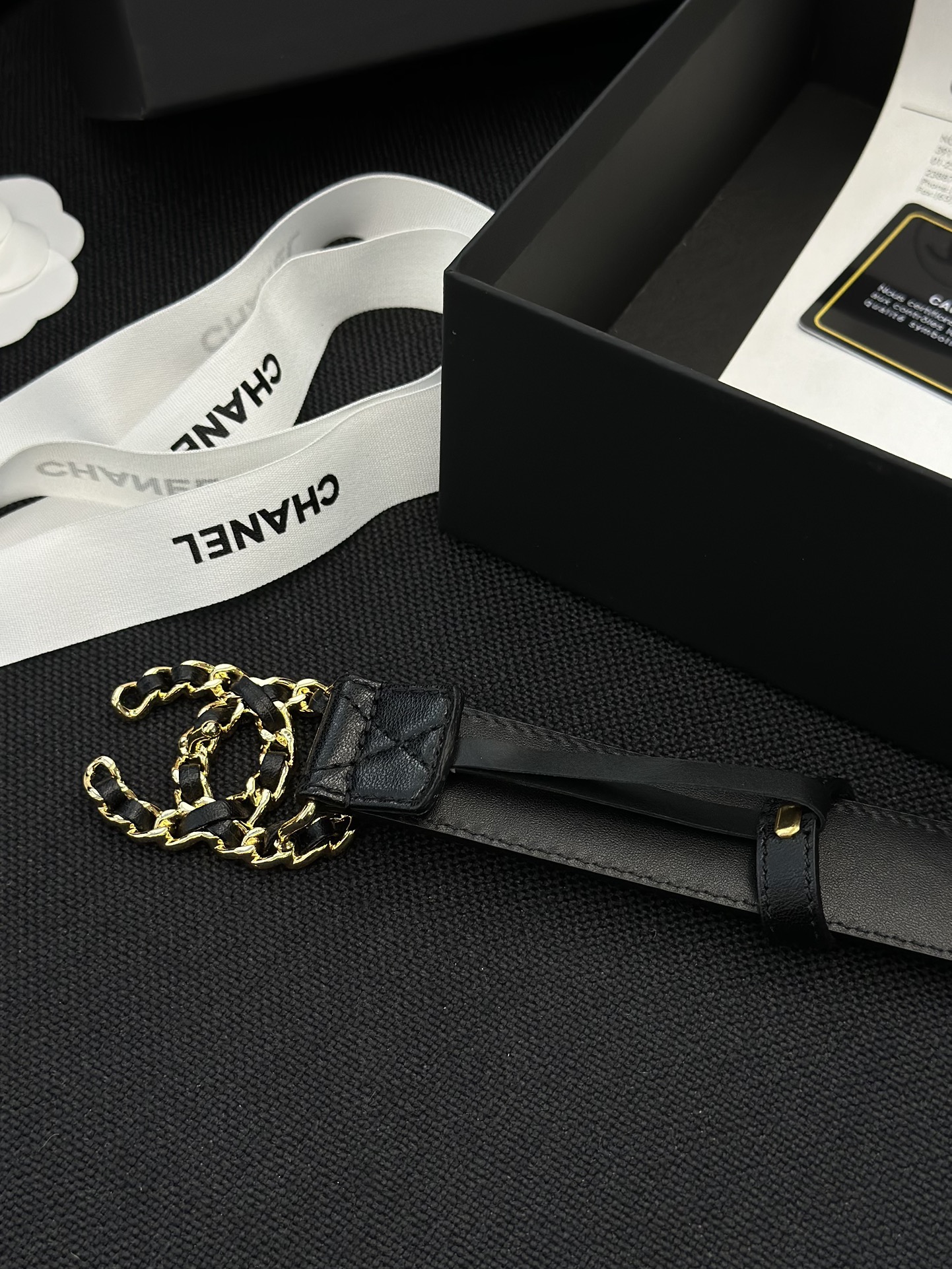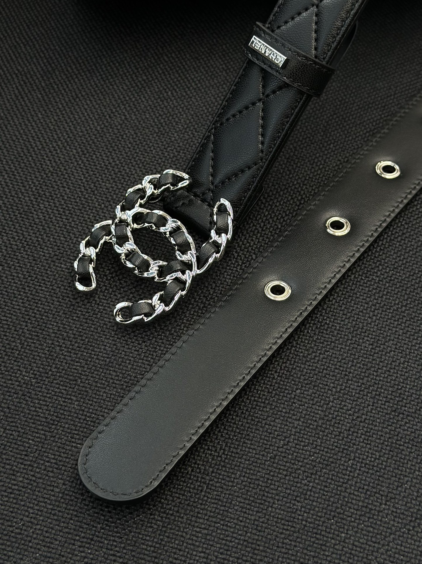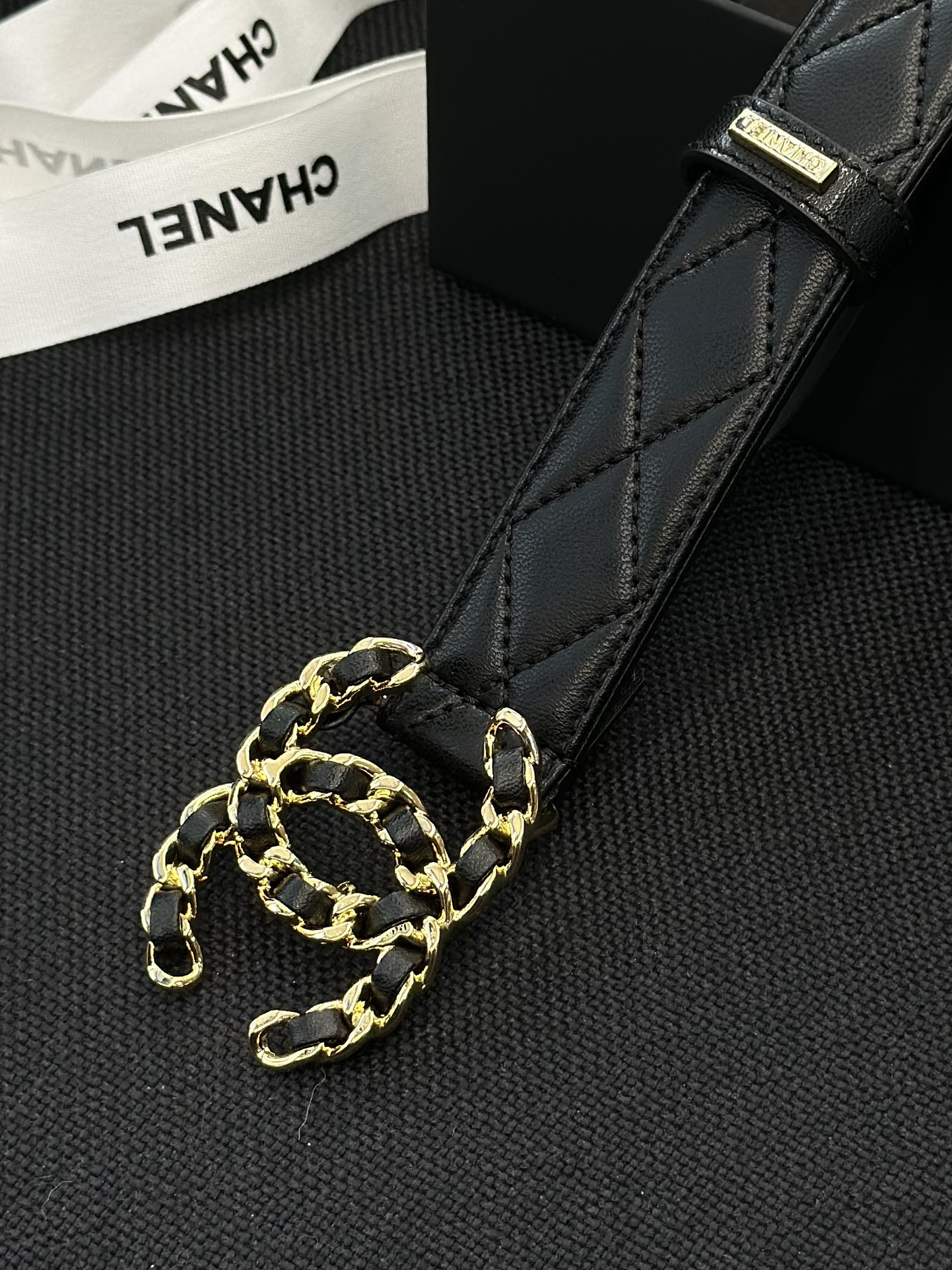 专柜款!头层小牛皮,CHANE1女士新款黑金皮穿链菱格字母腰带!时髦超百搭
