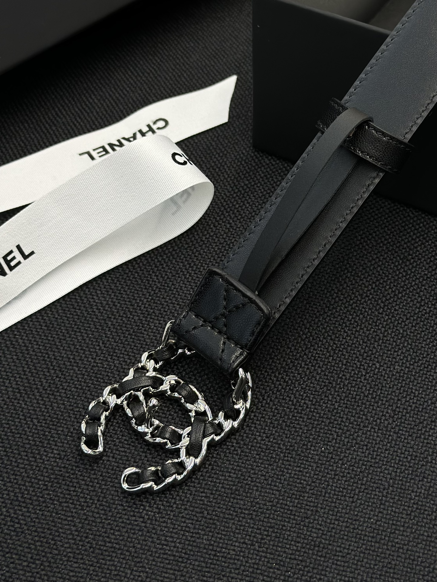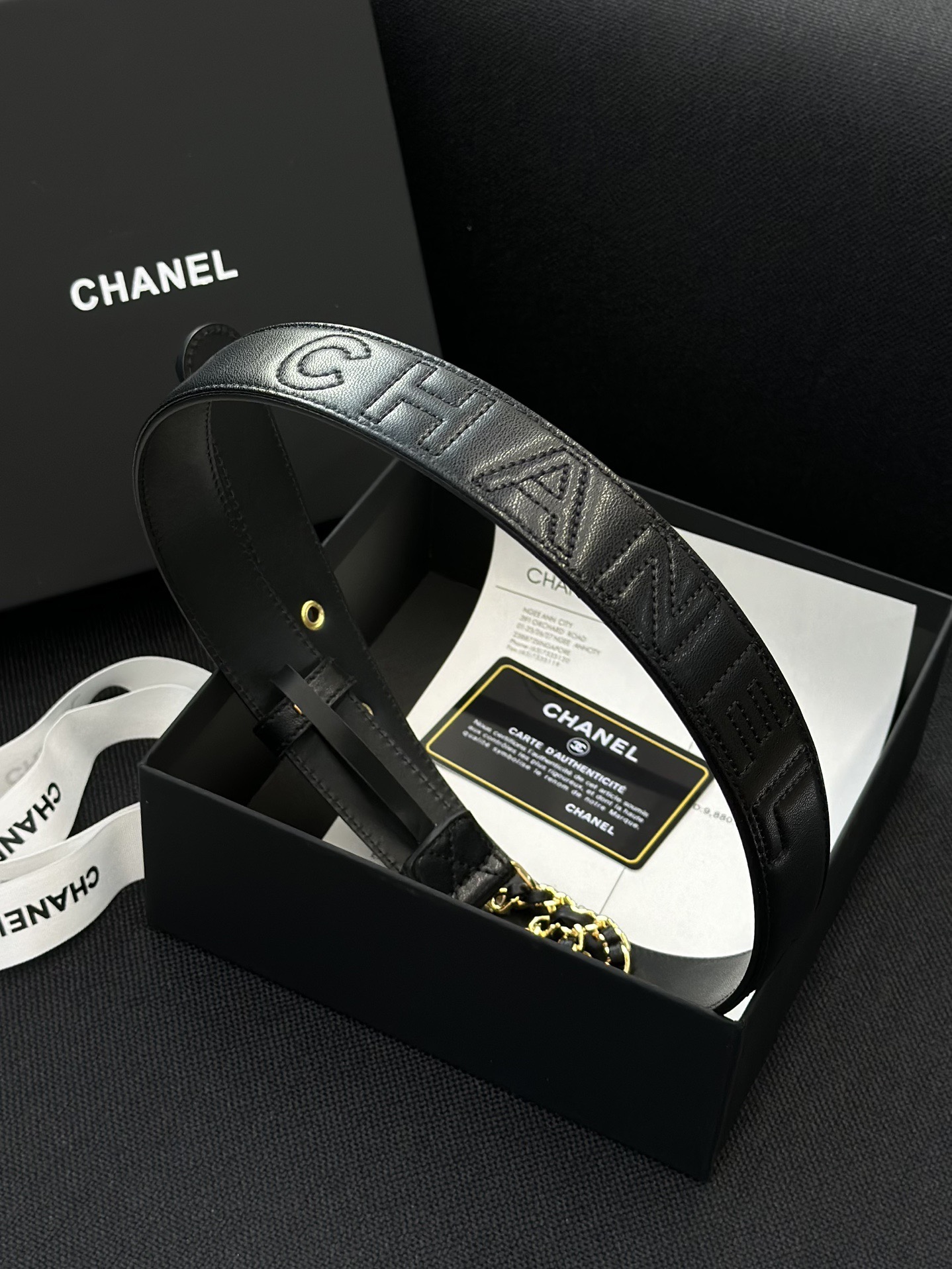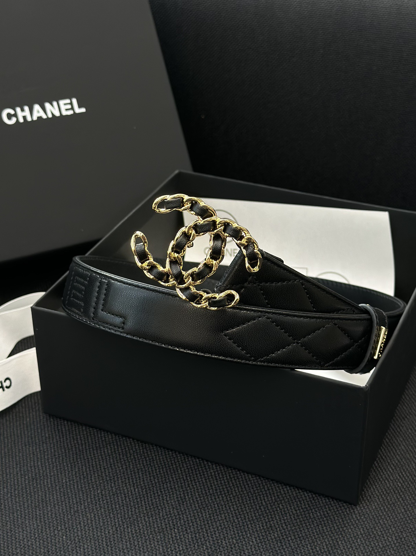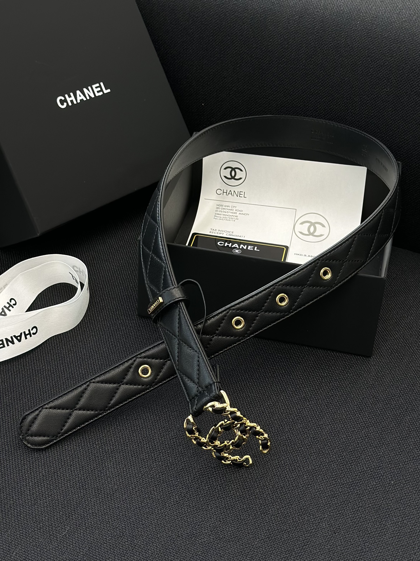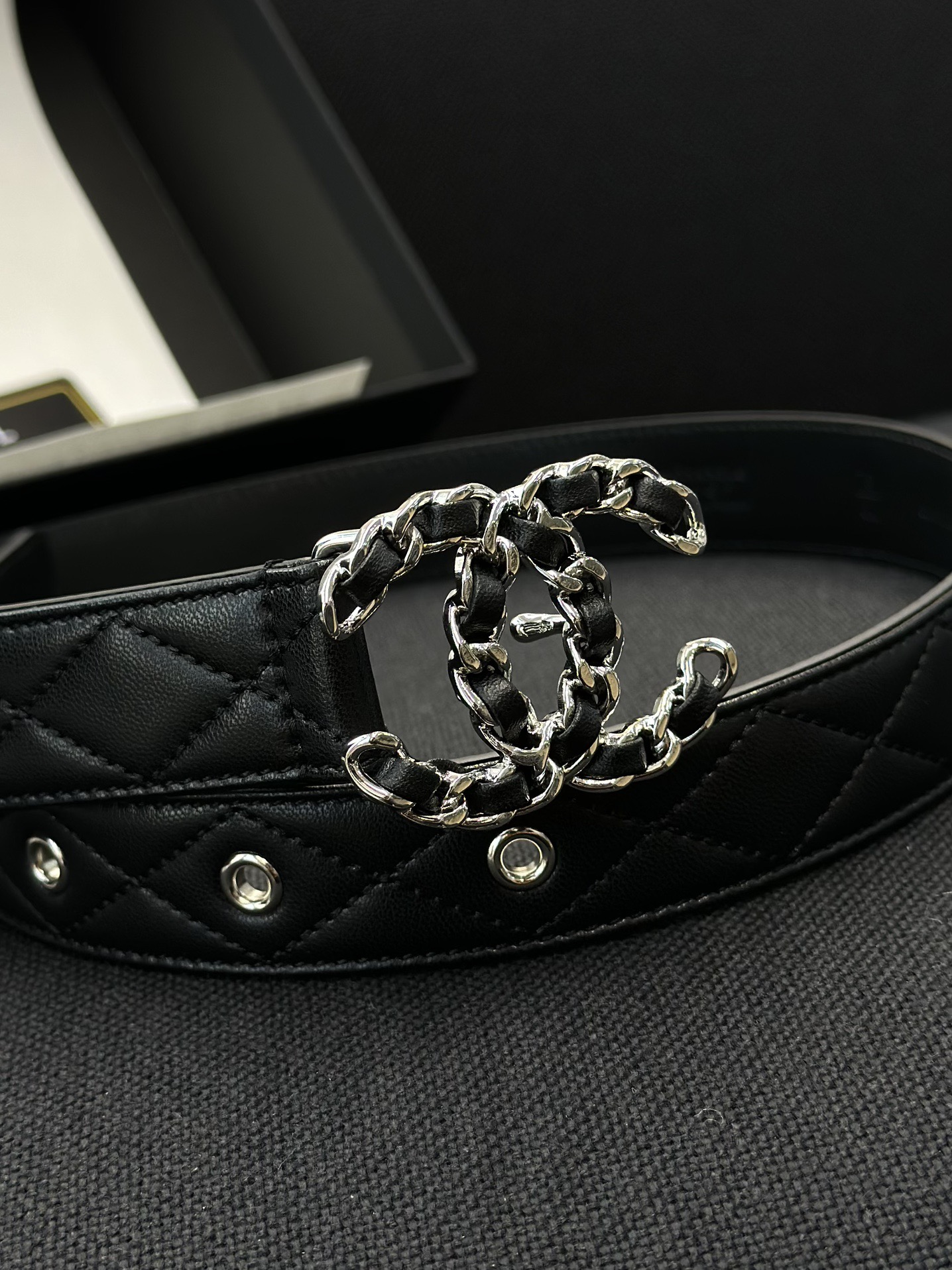 专柜款!头层小牛皮,CHANE1女士新款黑金皮穿链菱格字母腰带!时髦超百搭