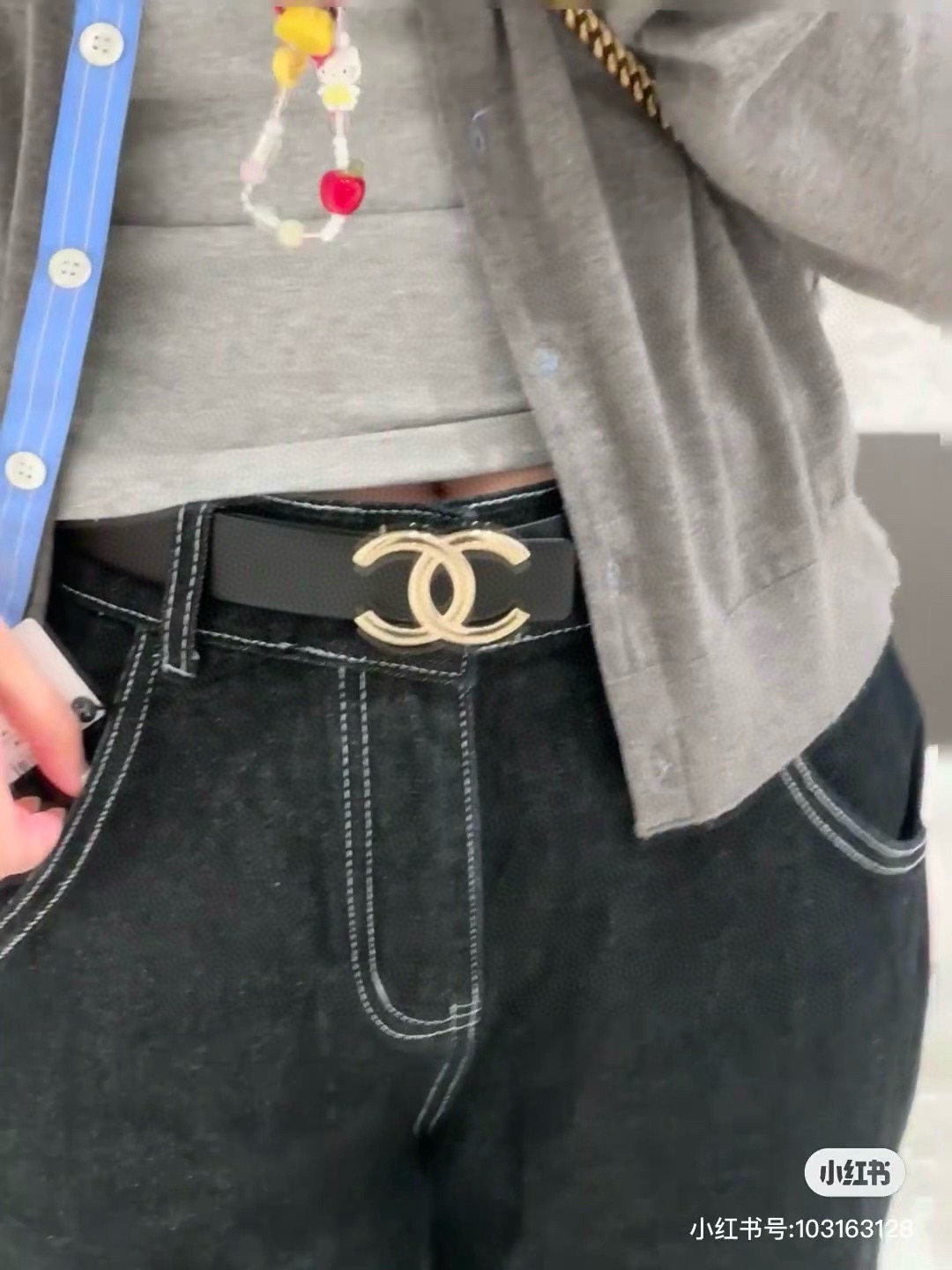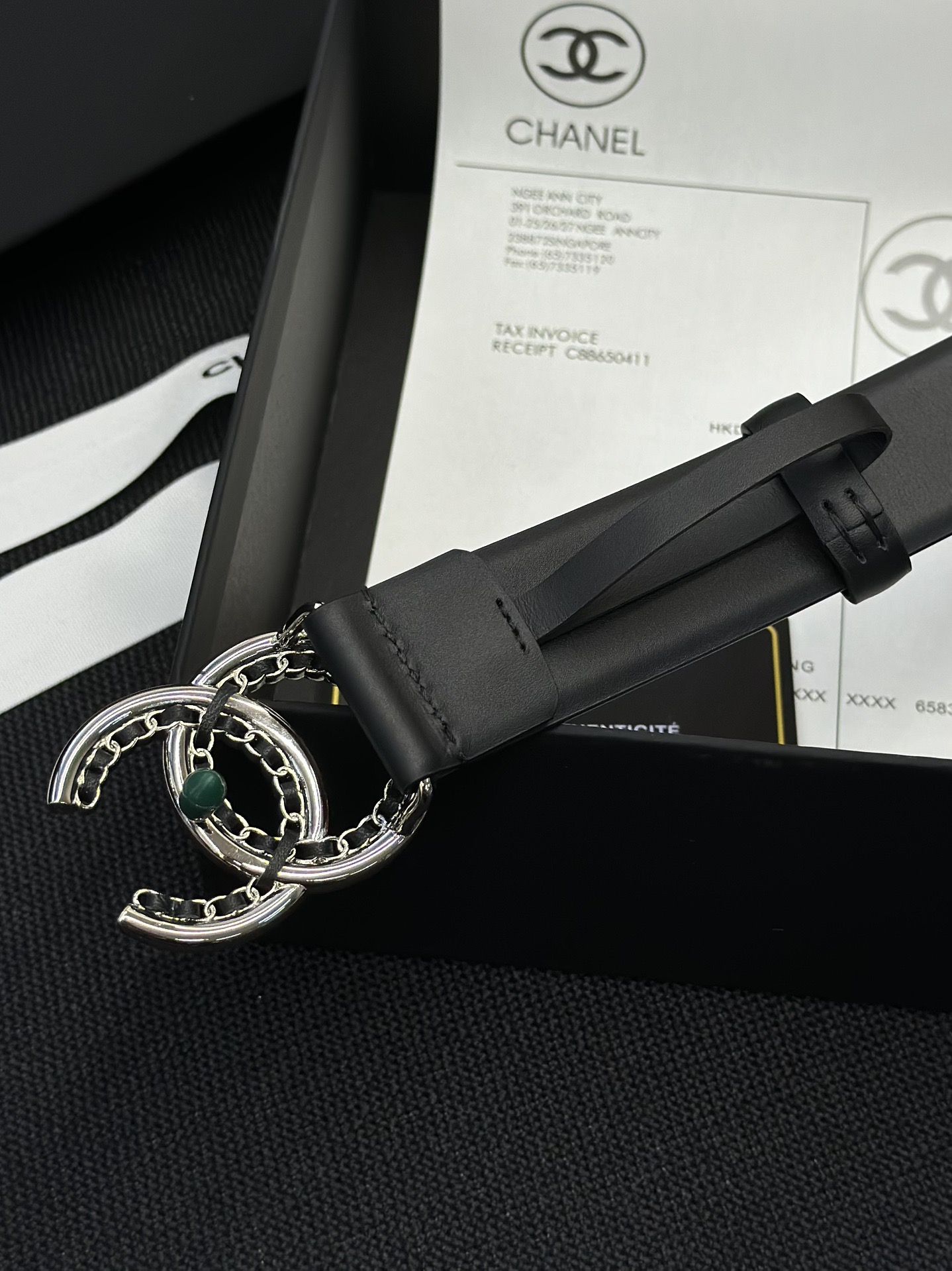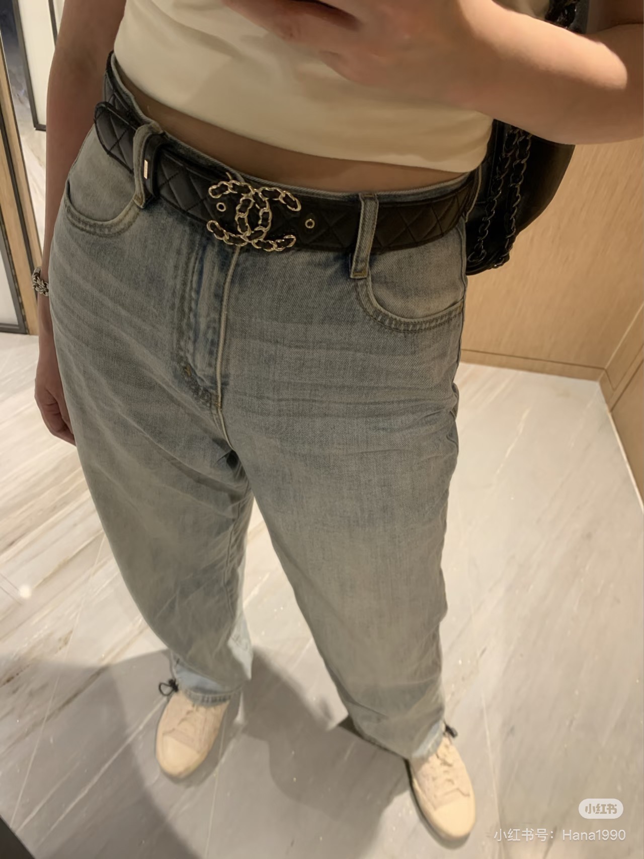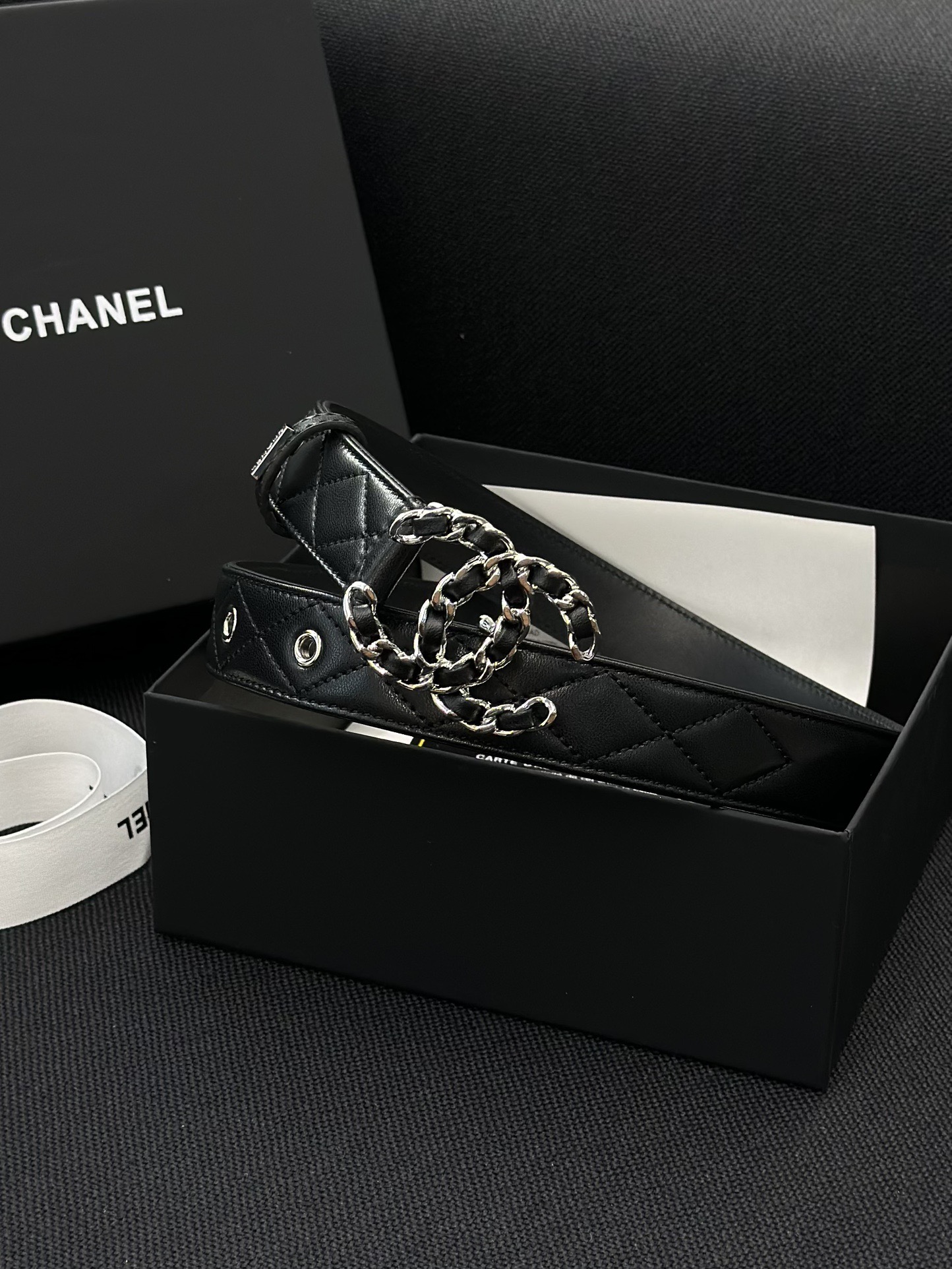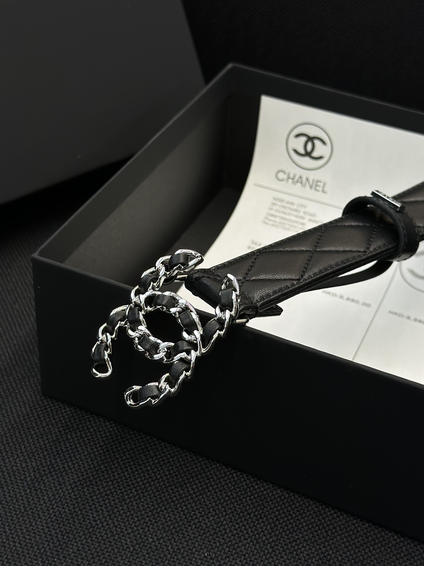 专柜款!头层小牛皮,CHANE1女士新款黑金皮穿链菱格字母腰带!时髦超百搭