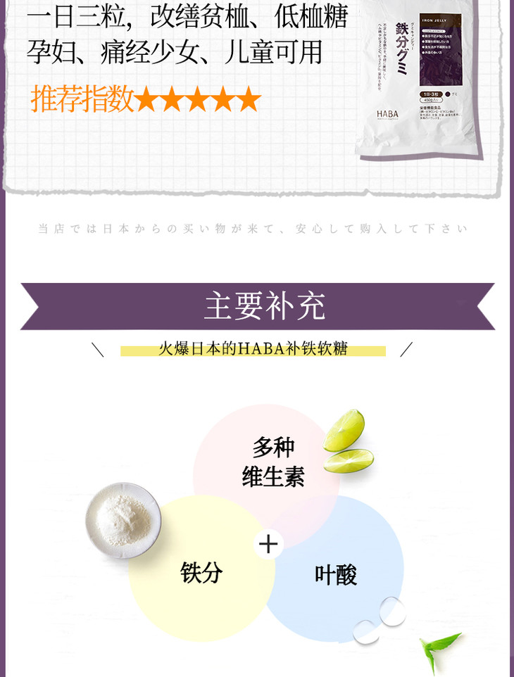 日本haba铁分糖 铁分补铁糖铁粉软糖补铁丸补维生素B叶酸 铁分90粒【日本直邮】