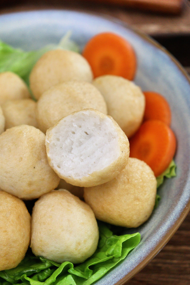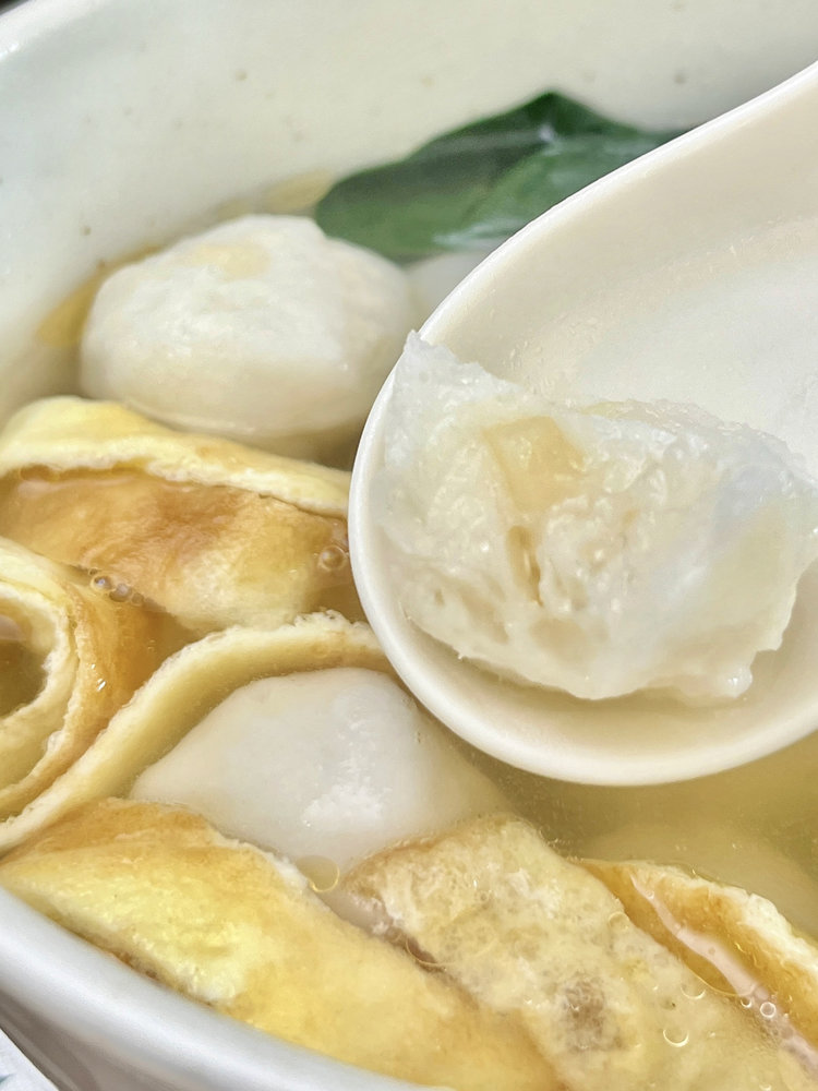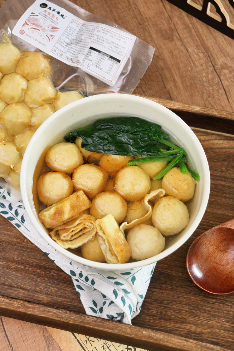 实打实好料做出来的东西,味道是骗不了人的。鱼丸的肉质呈现紧致的脆度,咬一口,仿佛在跟牙齿较劲,口感Q弹爽脆,尝到淡淡的海水咸鲜,光是原味就已经足够好吃了!