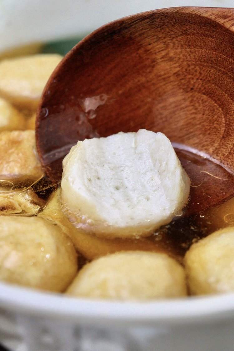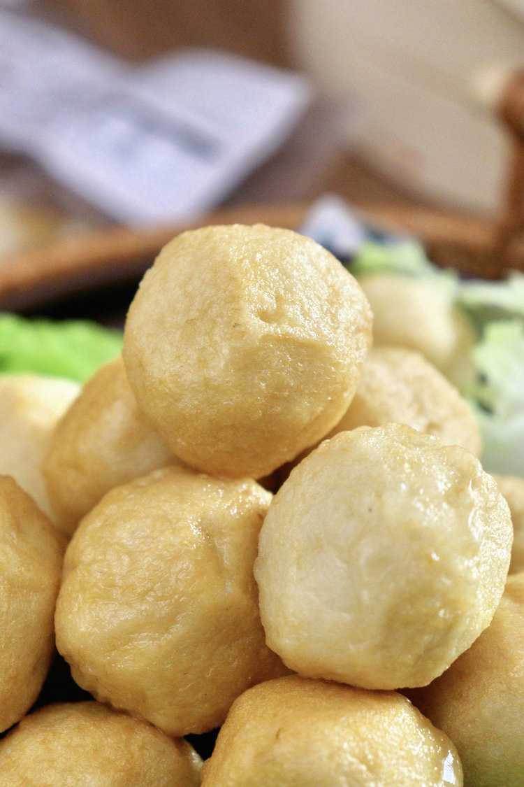 鱼丸如海绵般吸收麻辣/咖喱汤底,外层弹韧、内芯饱含滚烫鲜汁,油炸则外皮酥脆,内里仍保留湿润嫩滑感。