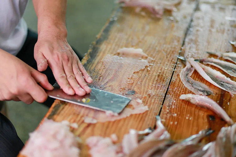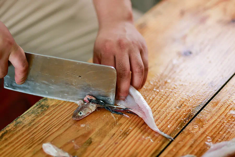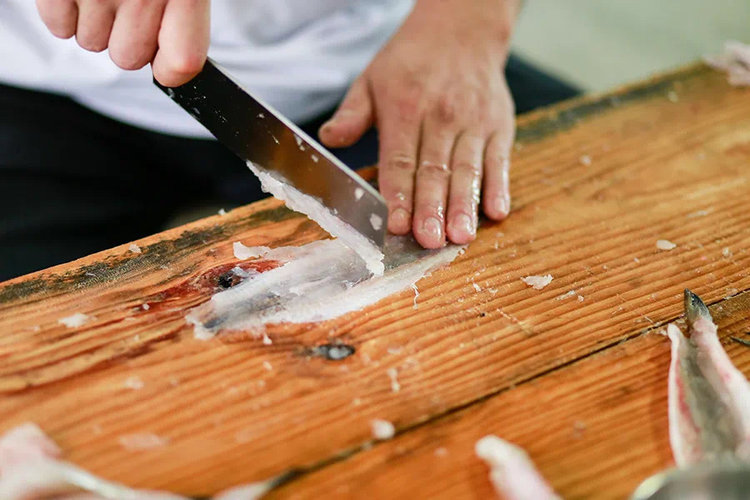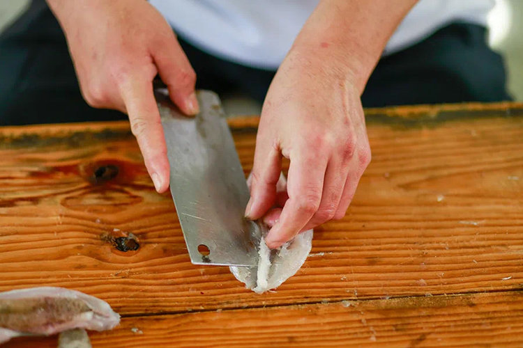 老师傅 快、准、狠地把鱼脊骨剔掉,不可有丝毫犹豫!