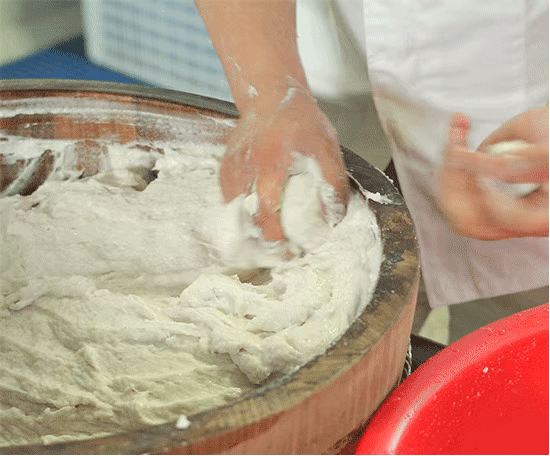 肉泥刮出来之后,就放到木盆里面,到了制作过程中最为吃力的环节,加入少量淀粉,海盐、鸭蛋蛋清,一边搅拌一边击打着鱼肉泥,五分钟时间,数百次搅拌与击打❗️最少摔打上千次后直至鱼浆吐出、鱼肉起胶,在摔打时加入冰水降温,以免温度过高,影响鱼胶的稳定性。 原本松散的鱼肉泥蛋白结构就变得爽口Q弹,只有经验的老师傅才能做出来。