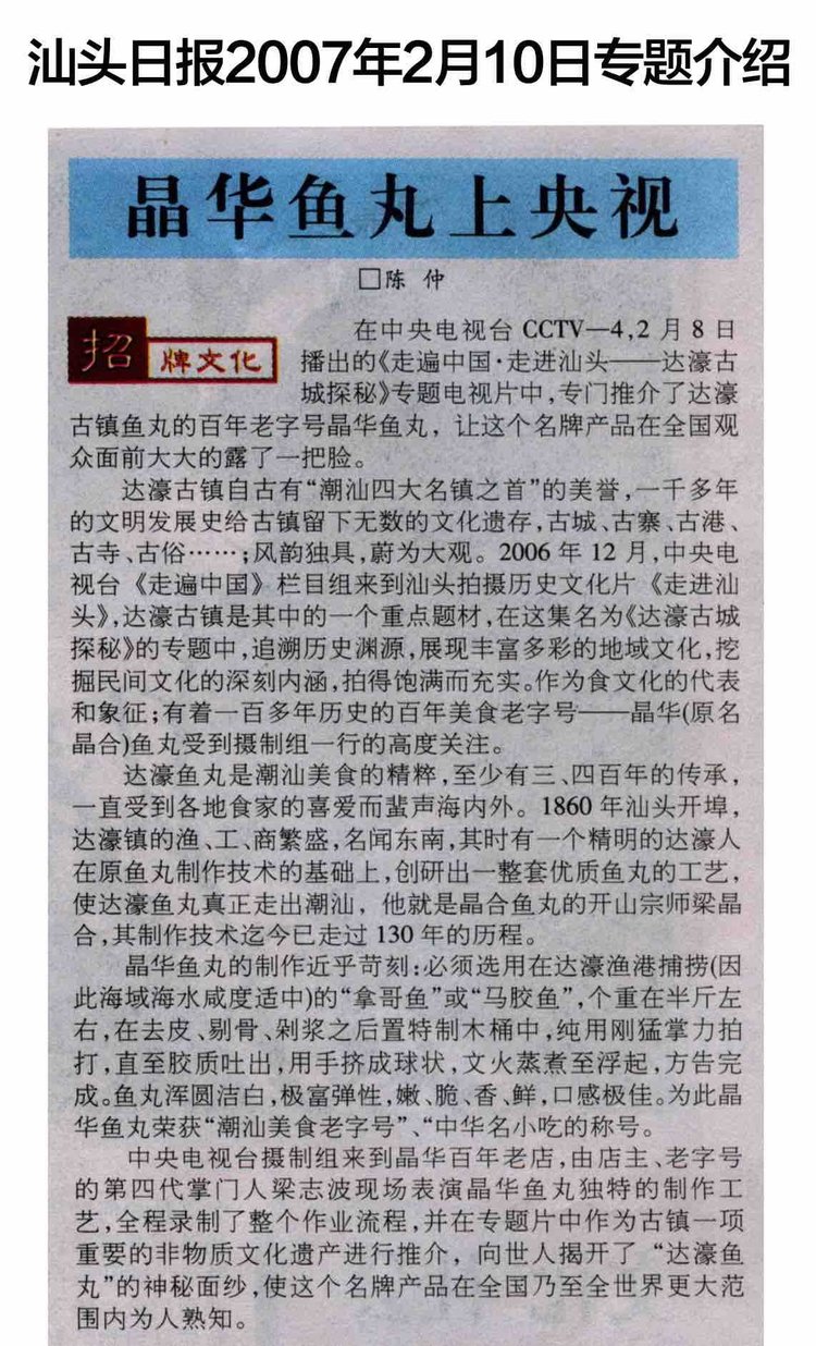 在汕头达濠,晶华是当地卖得最好的鱼丸牌子之一。潮汕鱼丸,是广东省潮汕地区的特色传统小食。在潮汕话中,“鱼”与“余”同音,“丸”同“圆”谐音,象征年年有余,合家团圆,鱼丸也就成了人们过年必备的席上之珍,甚至有“没有鱼丸不成席”之说。