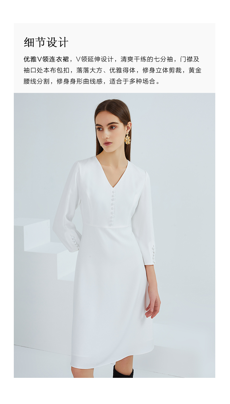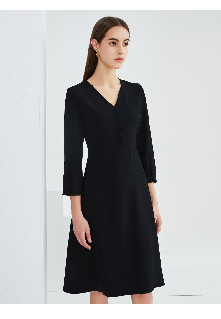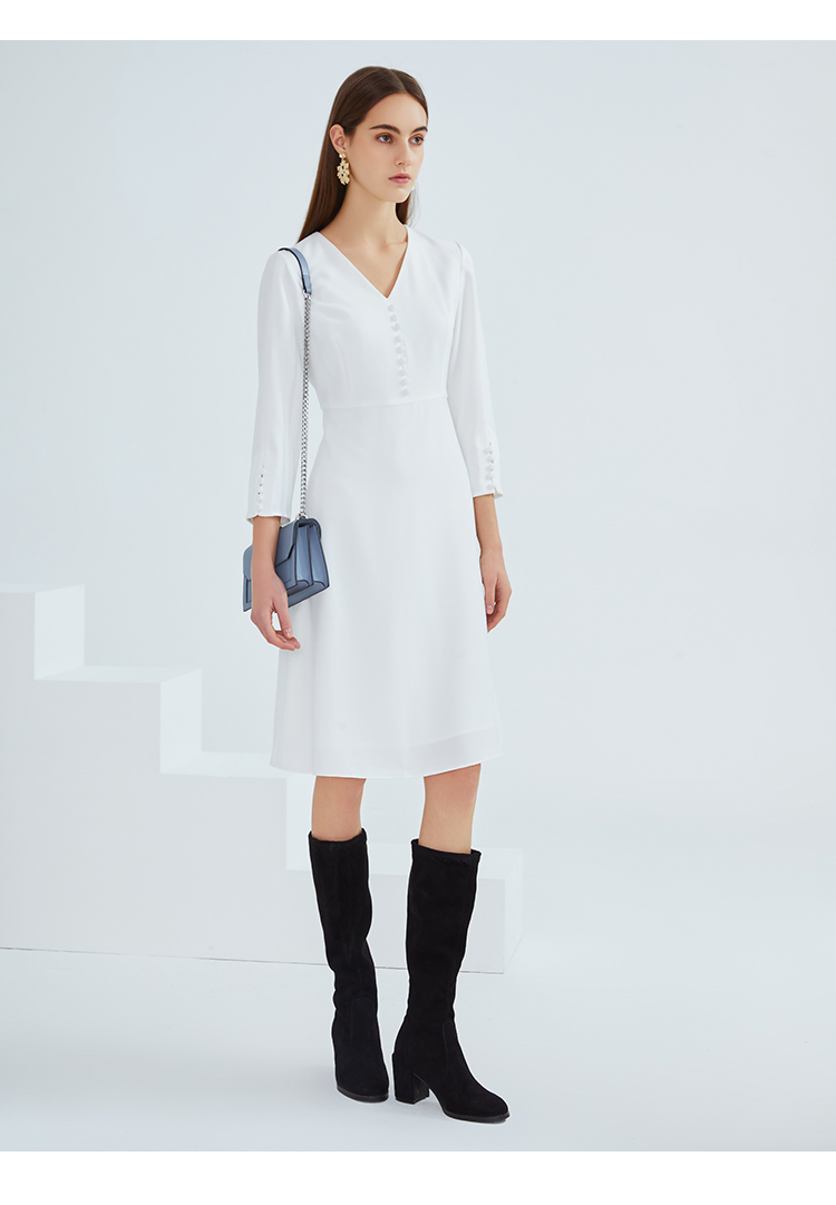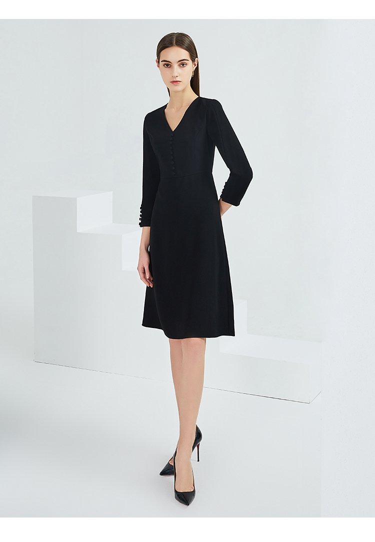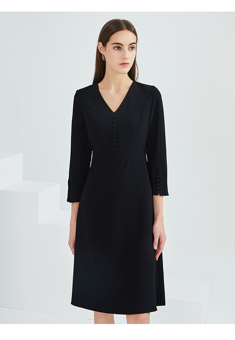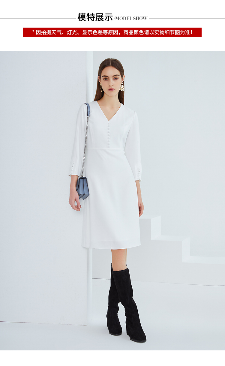 EITIE爱特爱春季新款洋气复古V领修身显瘦简约百搭气质连衣裙6307013