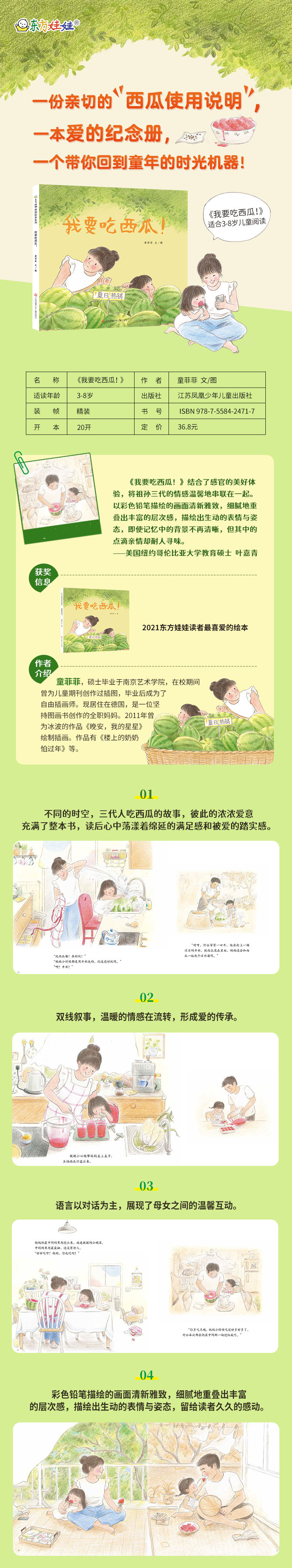 《我要吃西瓜》是作者童菲菲的原创图画书,故事从书中的女儿想吃西瓜开始,到挑西瓜、买西瓜、吃西瓜,通过不同色调,分两个时间线平行叙述,为我们展现了三代人珍藏的夏日记忆。