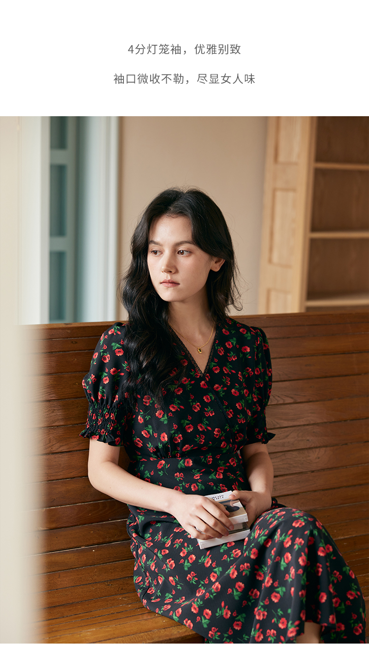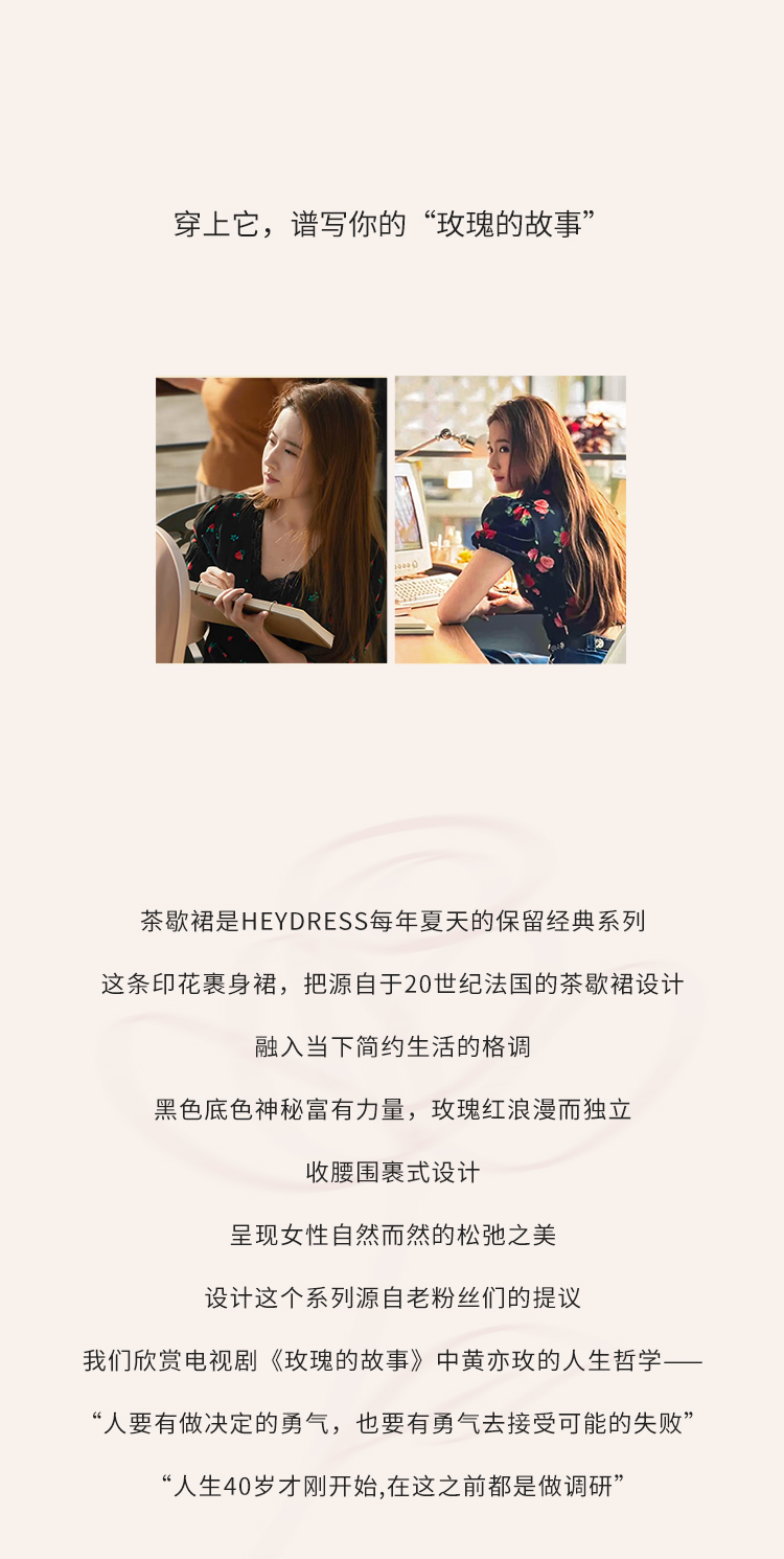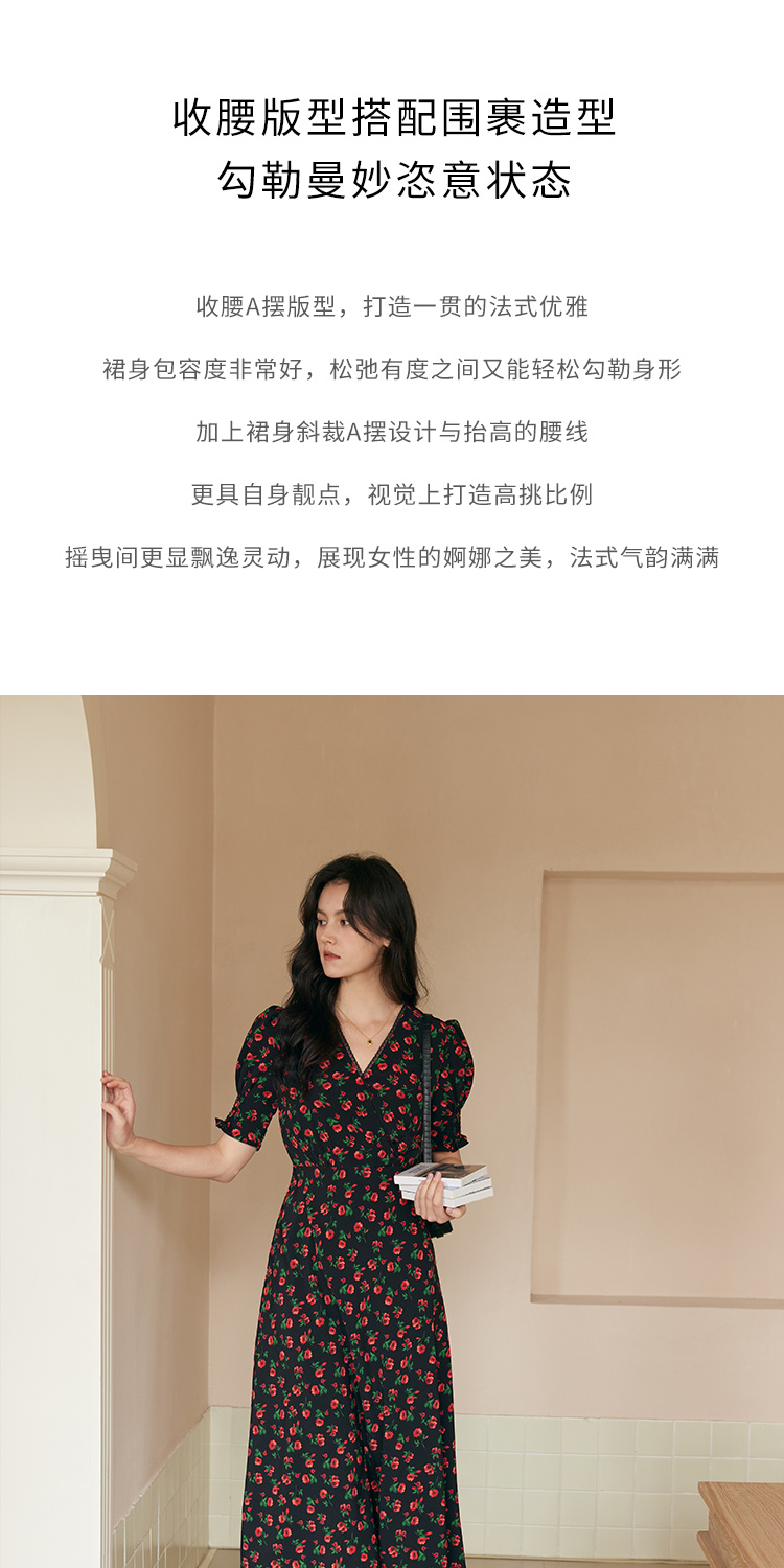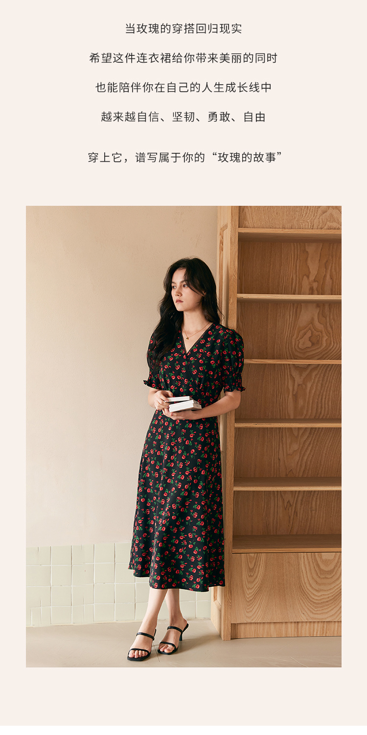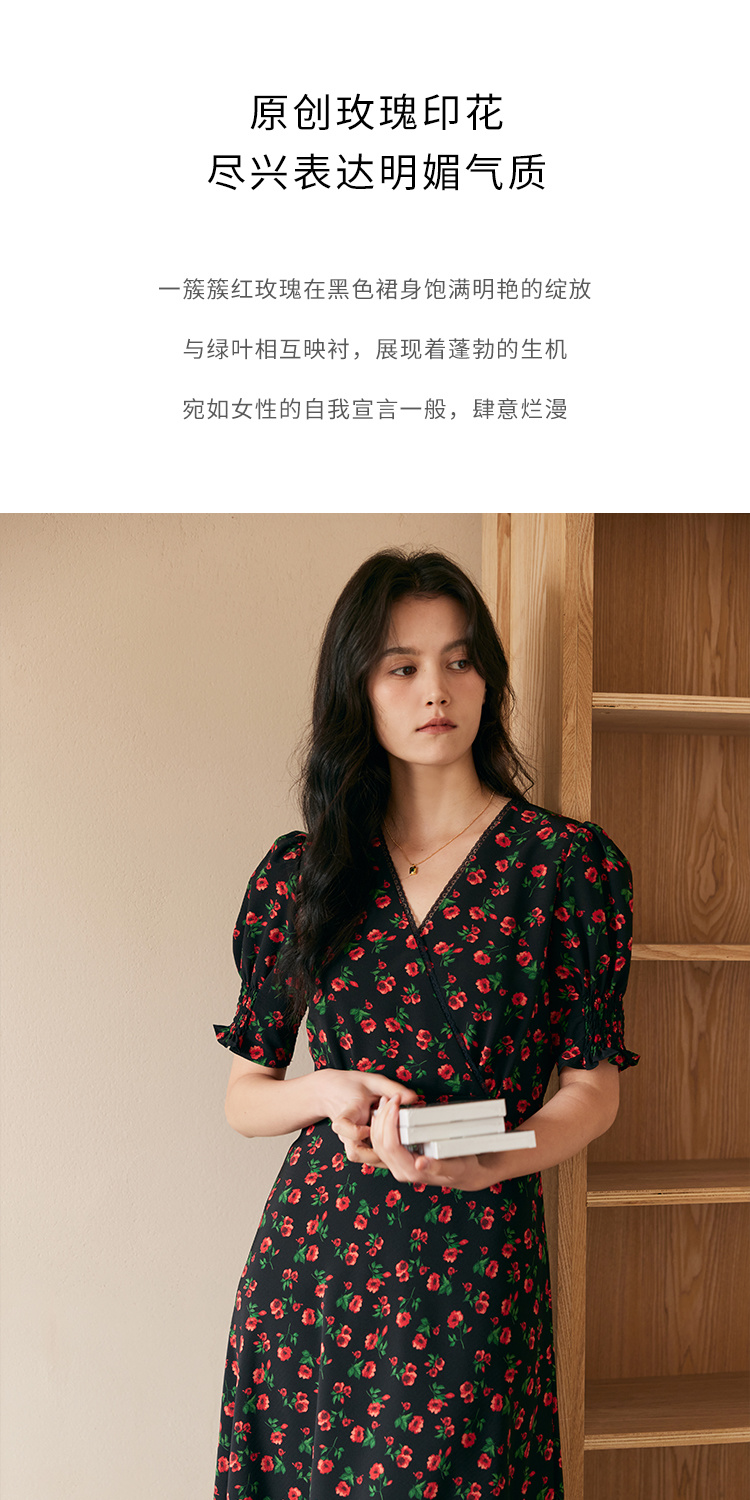 HeyDress原创玫瑰印花连衣裙女夏季法式收腰修身浪漫气质度假裙子