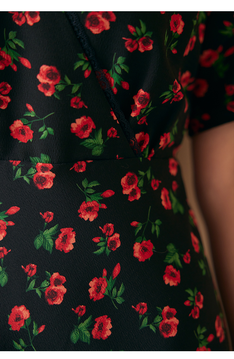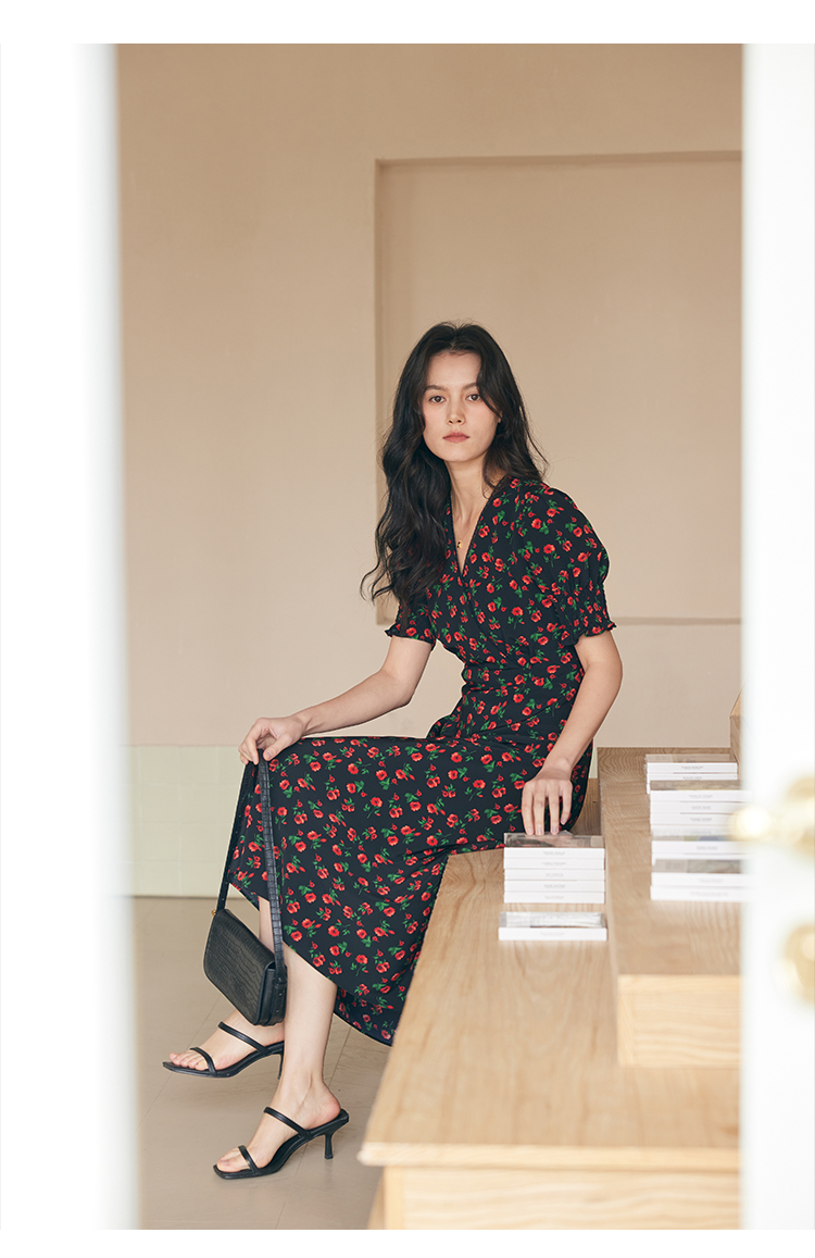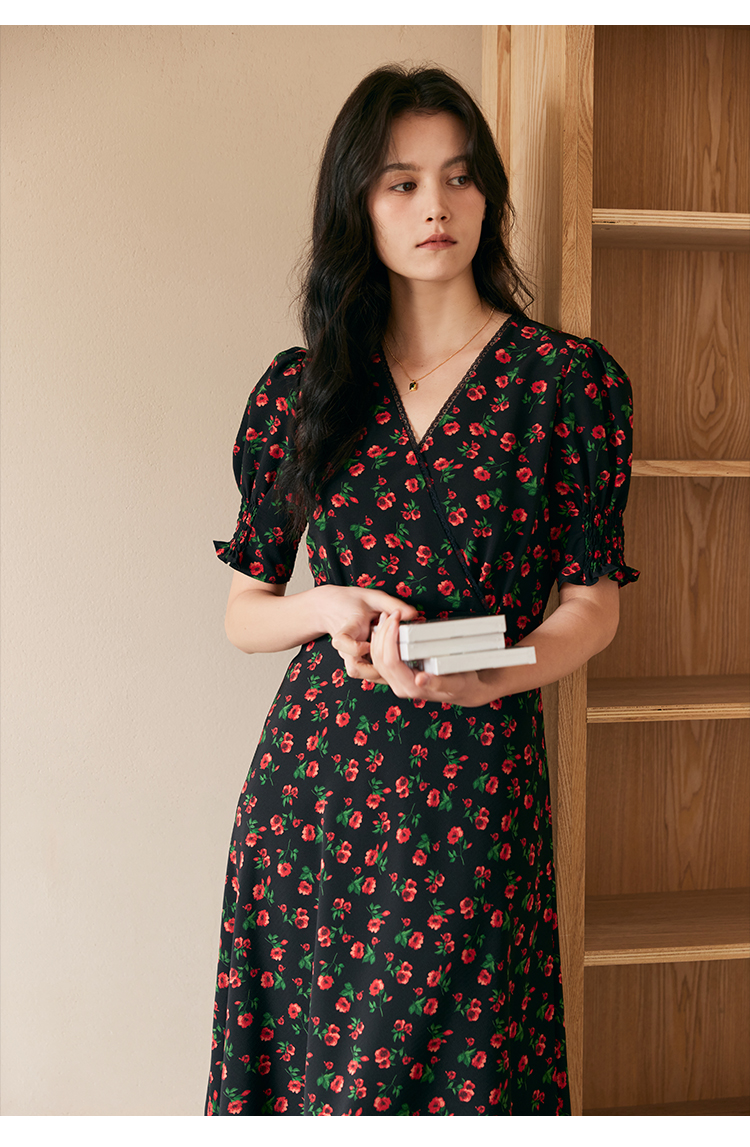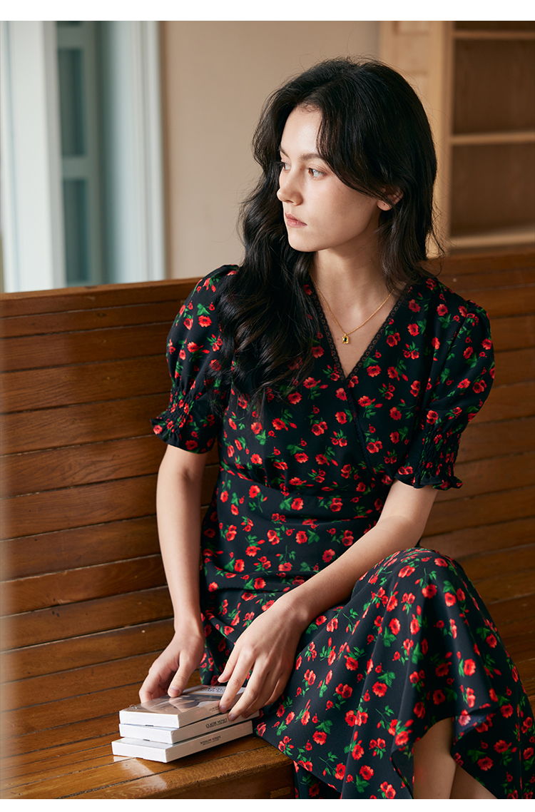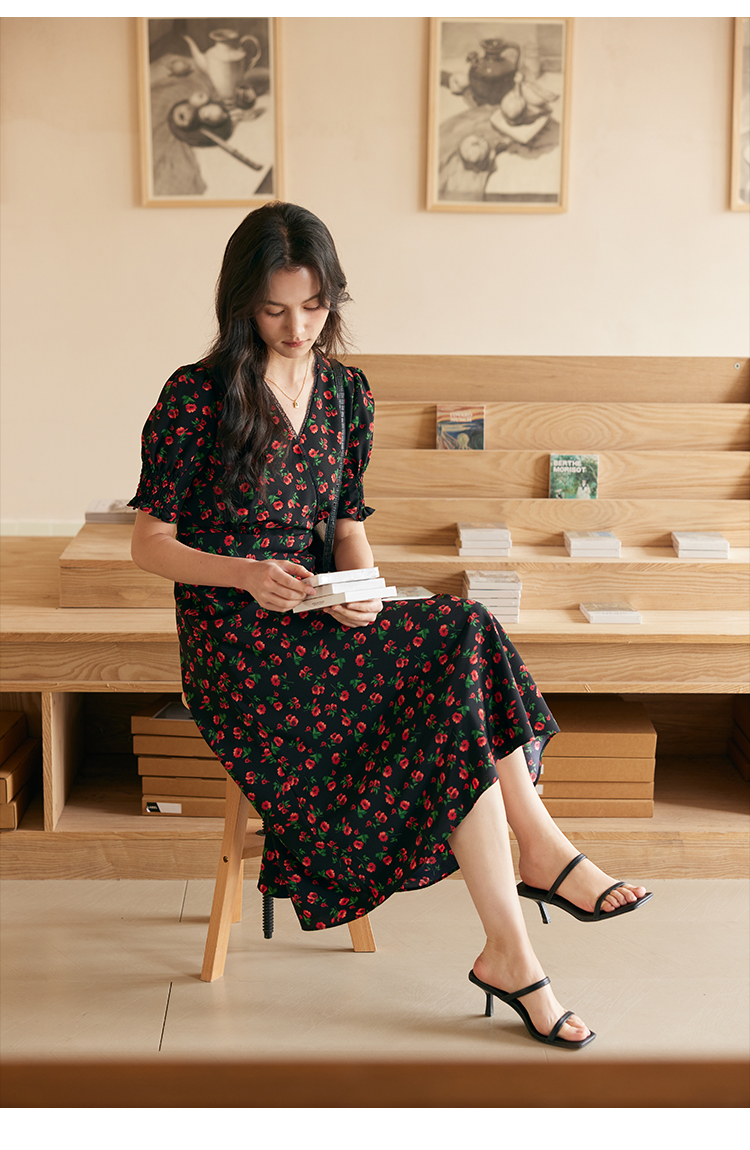HeyDress原创玫瑰印花连衣裙女夏季法式收腰修身浪漫气质度假裙子