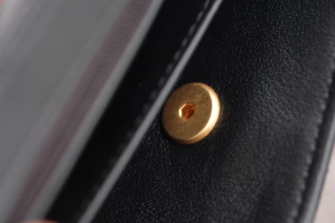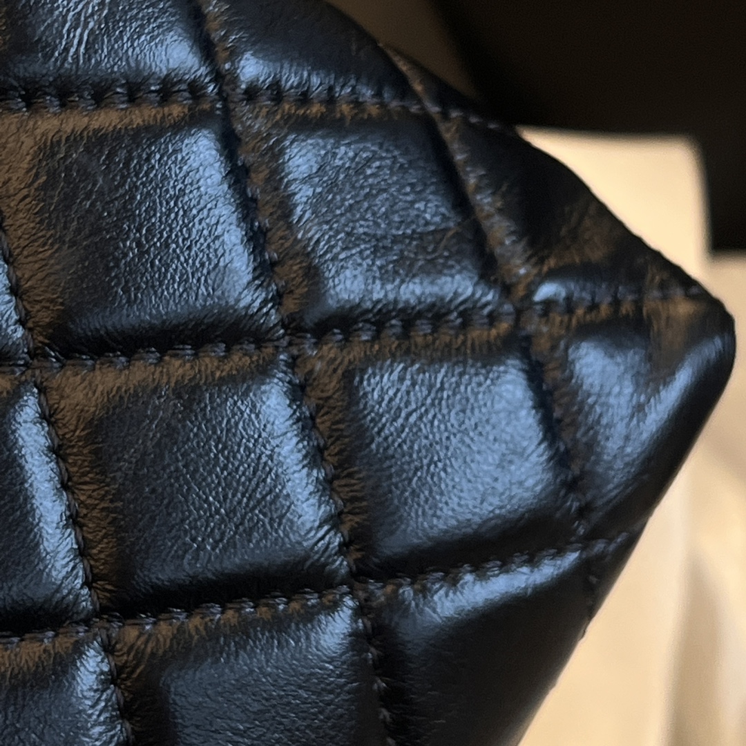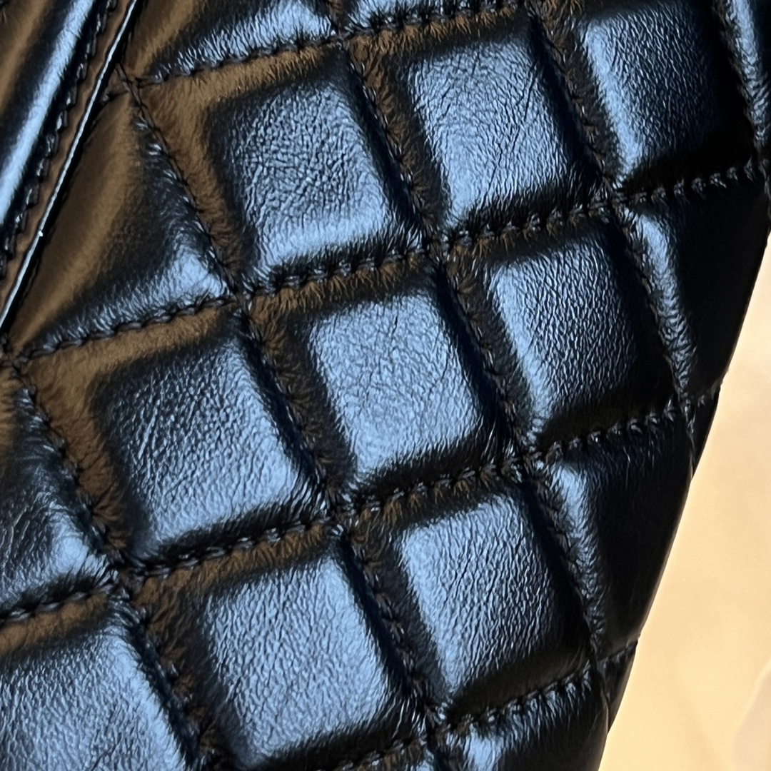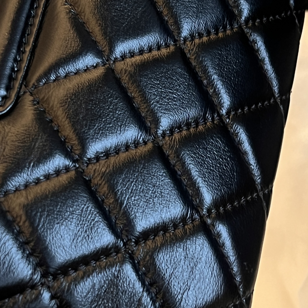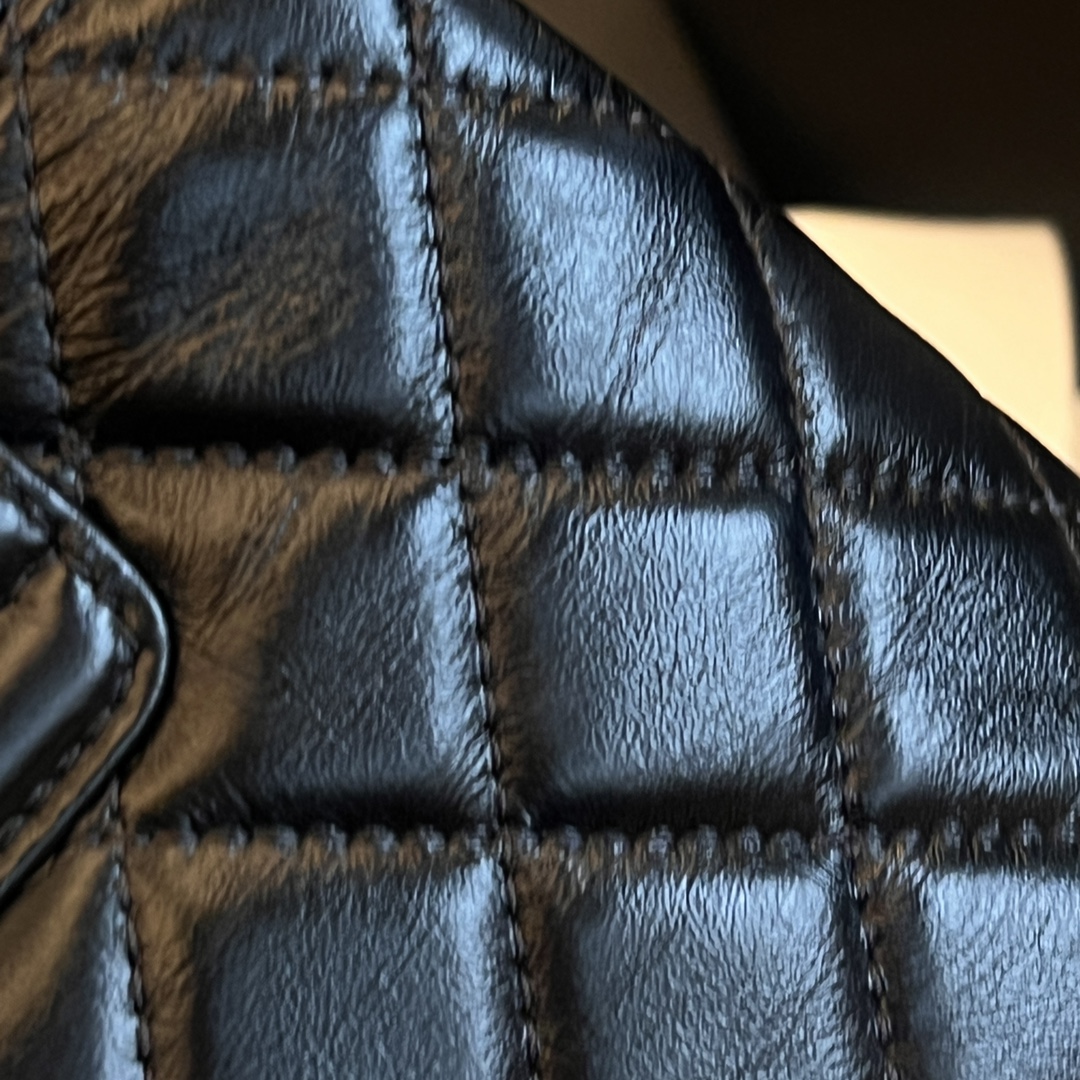 皮料必须原装,小牛油蜡皮,与22bag款同厂的不同风格,皮料稍亮,触感是那种很轻很薄的感觉,皮面有一点小褶皱的浅纹路,市场货的皮料看起来就是很厚很滑,没有这种软糯的感觉,上手对比差距就更明显了