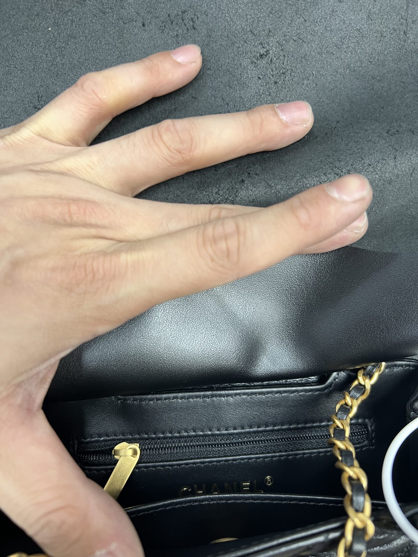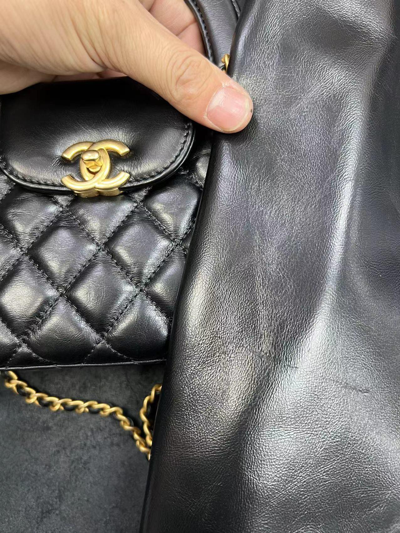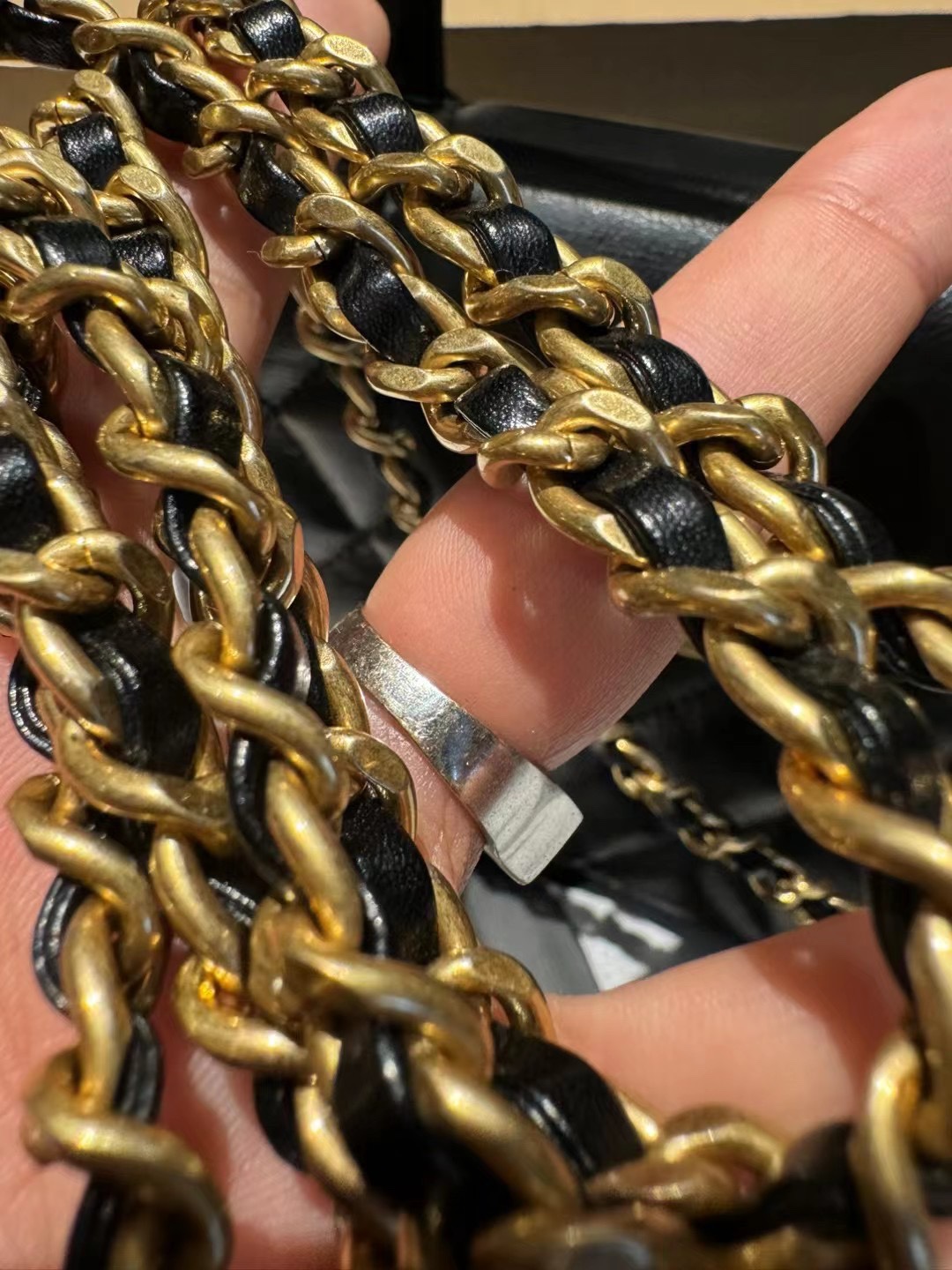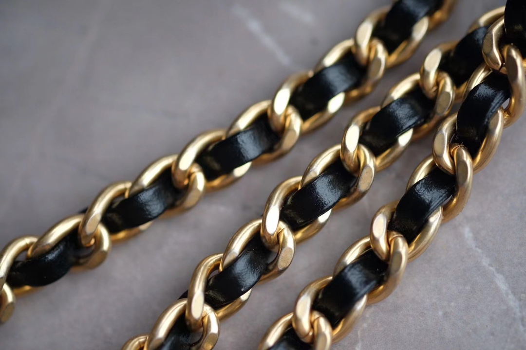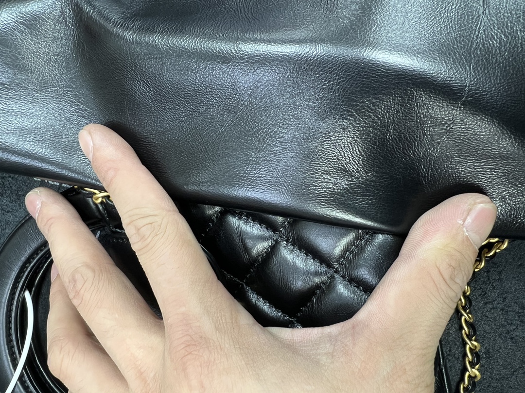 皮料必须原装,小牛油蜡皮,与22bag款同厂的不同风格,皮料稍亮,触感是那种很轻很薄的感觉,皮面有一点小褶皱的浅纹路,市场货的皮料看起来就是很厚很滑,没有这种软糯的感觉,上手对比差距就更明显了
