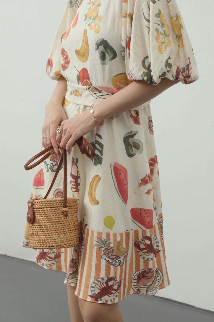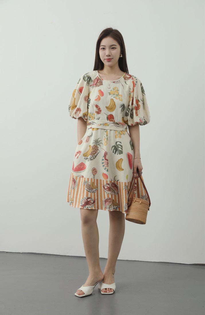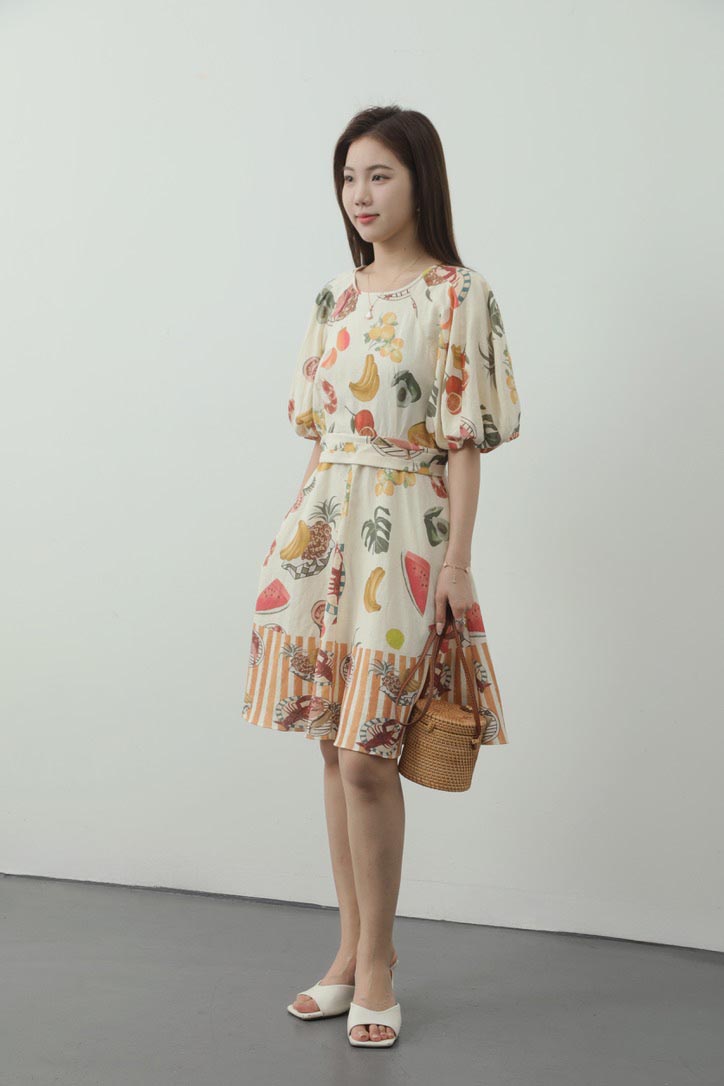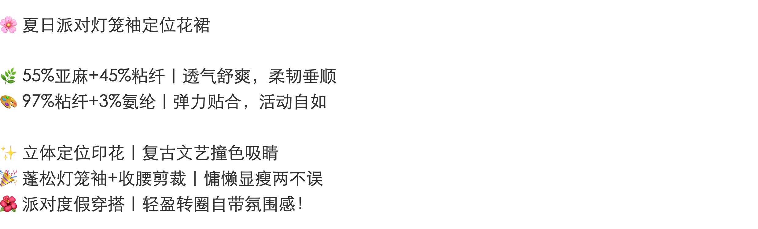 洛诗琳21714气质亚麻连衣裙2025夏季定位印花灯笼袖收腰裙子0368