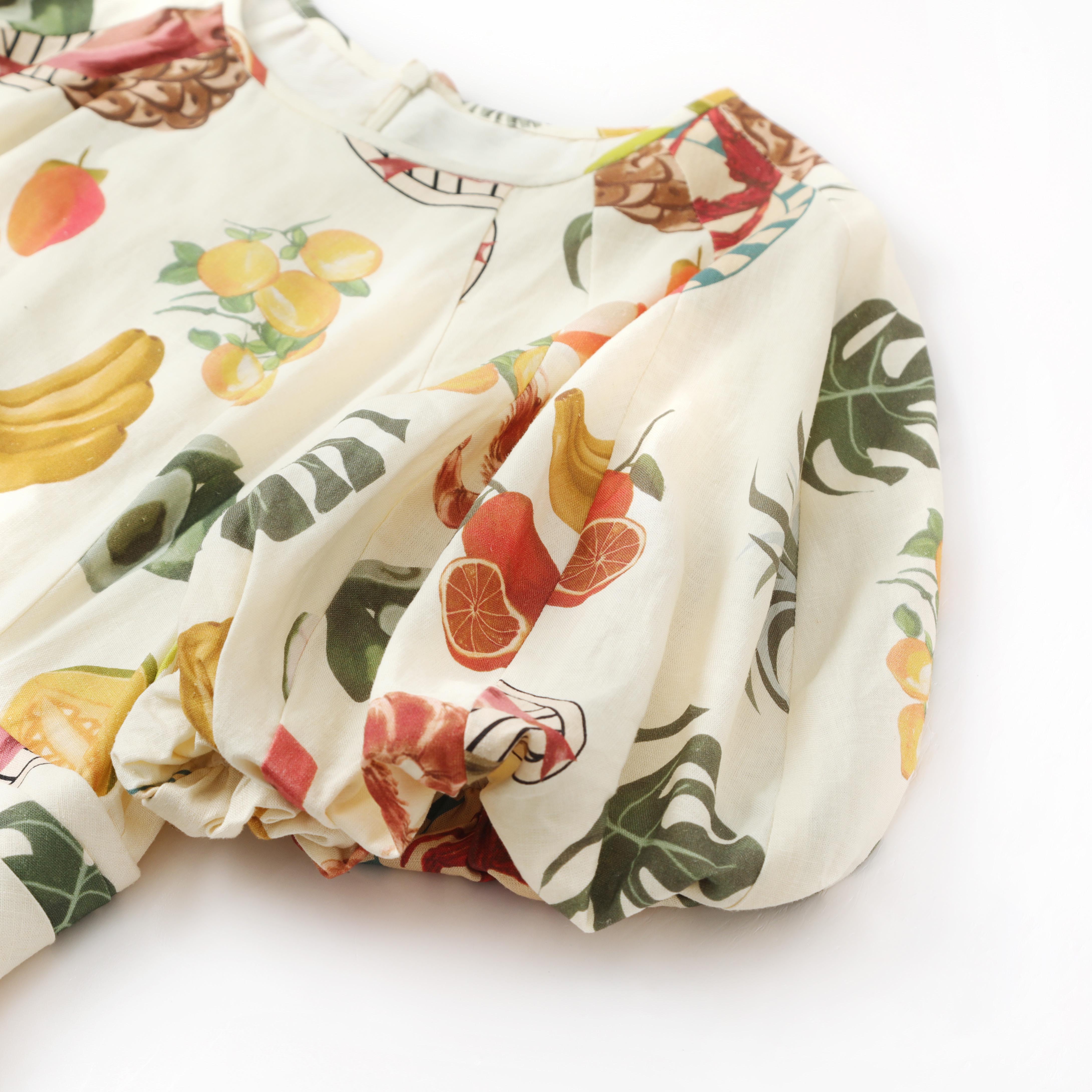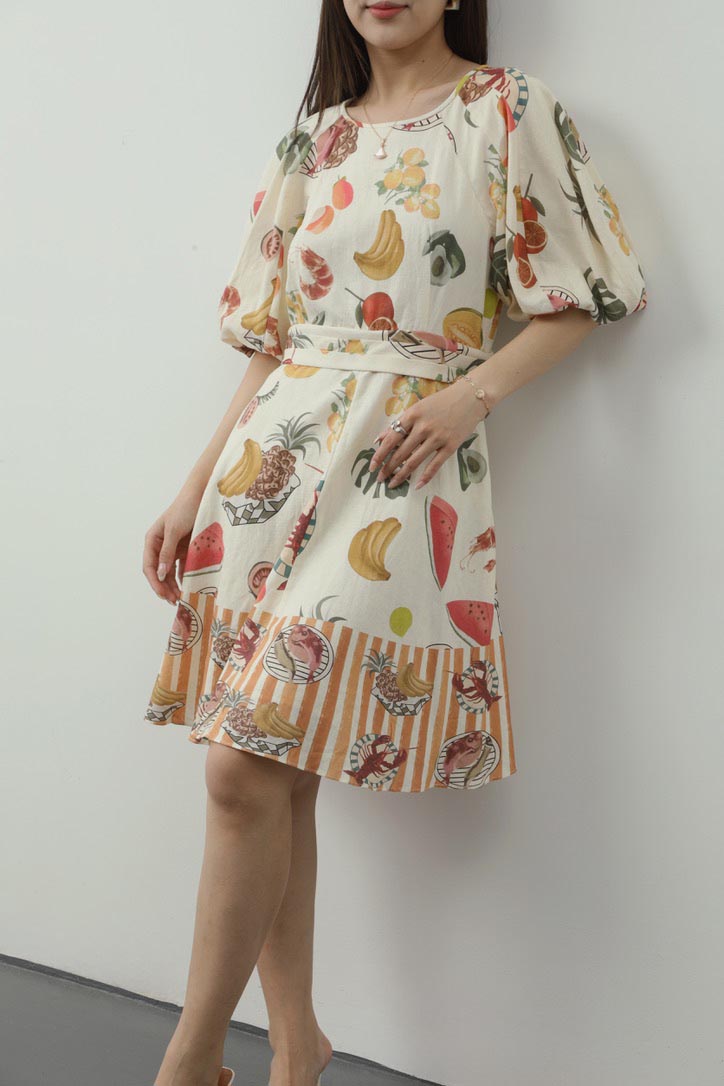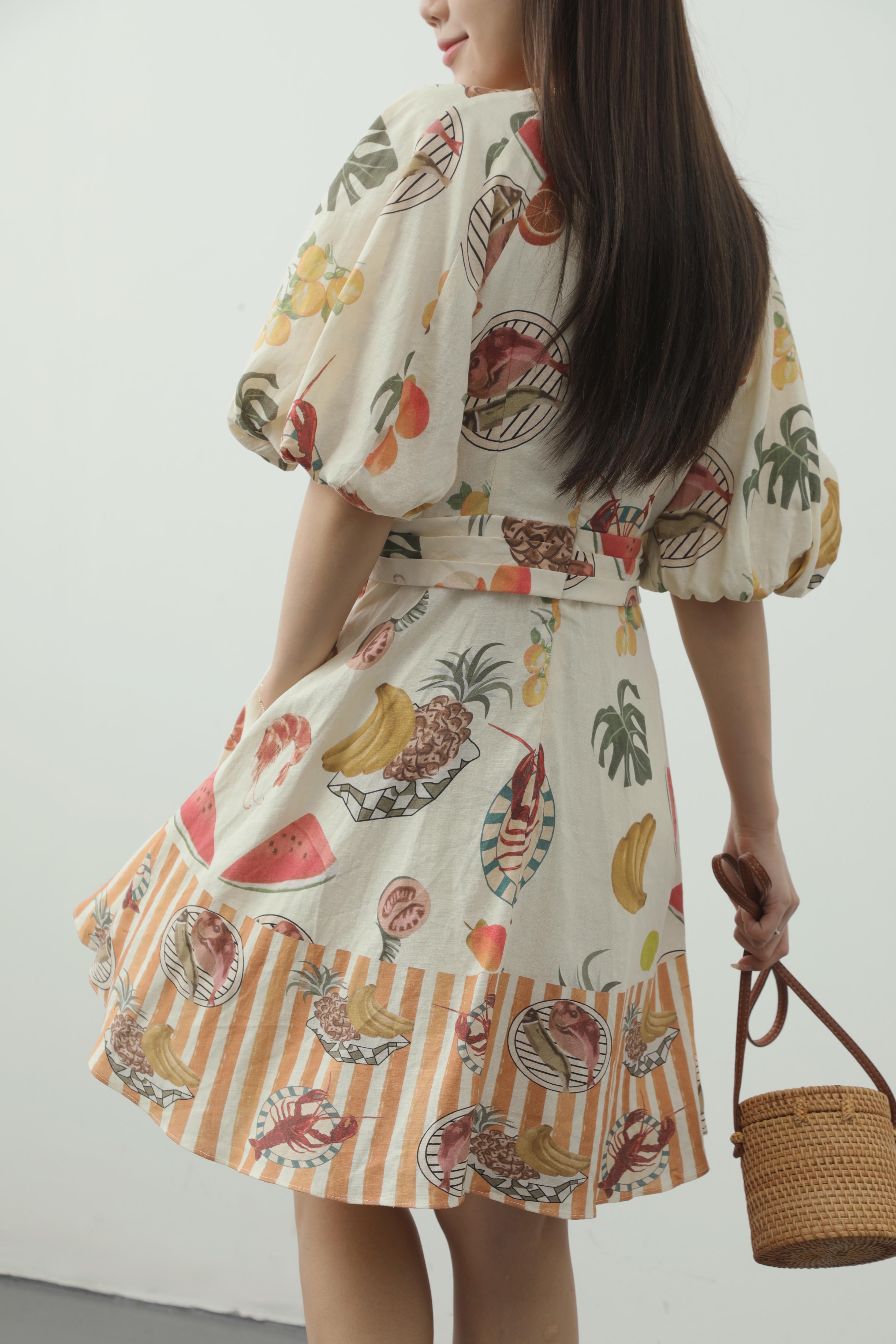 洛诗琳21714气质亚麻连衣裙2025夏季定位印花灯笼袖收腰裙子0368