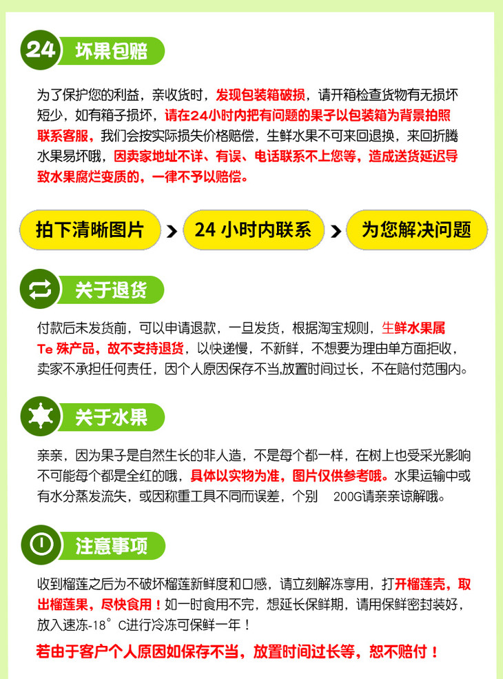 到货12小时内做售后,如果有-18度的存储条放一个月都没问题。关键是中间过程不可控,所以要求货到12小时内,如果不食用请客户解冻后取肉装碟用保鲜膜密封放急冻。 【马来西亚猫山王售后准则】