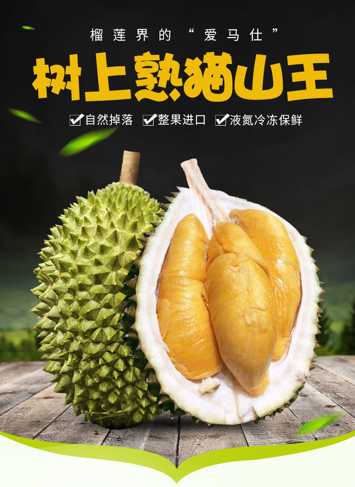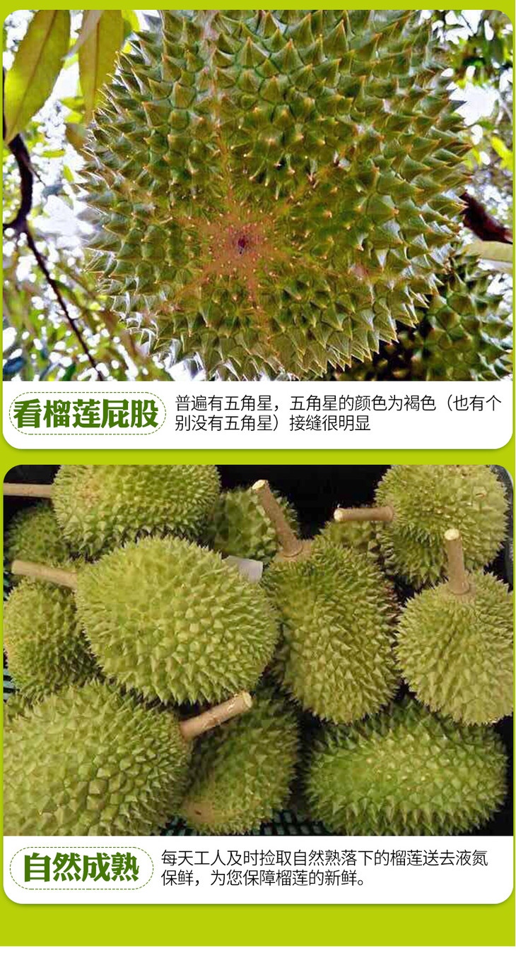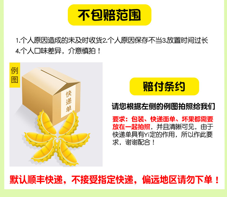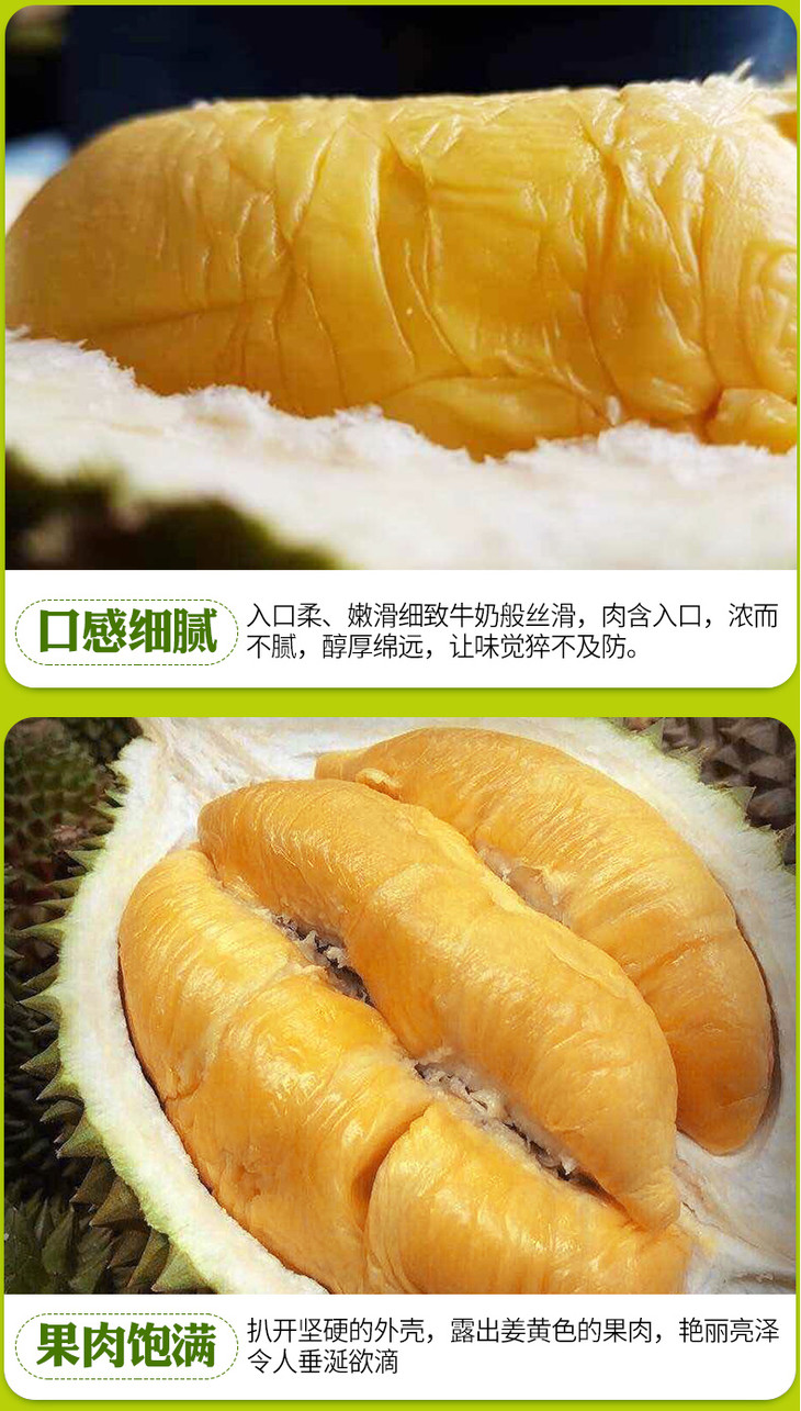 注意事项:猫山王在运输过程中可能会被榴莲刺扎破,猫山王主要靠冷冻保鲜,不是靠真空,所以包装袋运输路上漏气不影响品质,介意慎拍!!!!