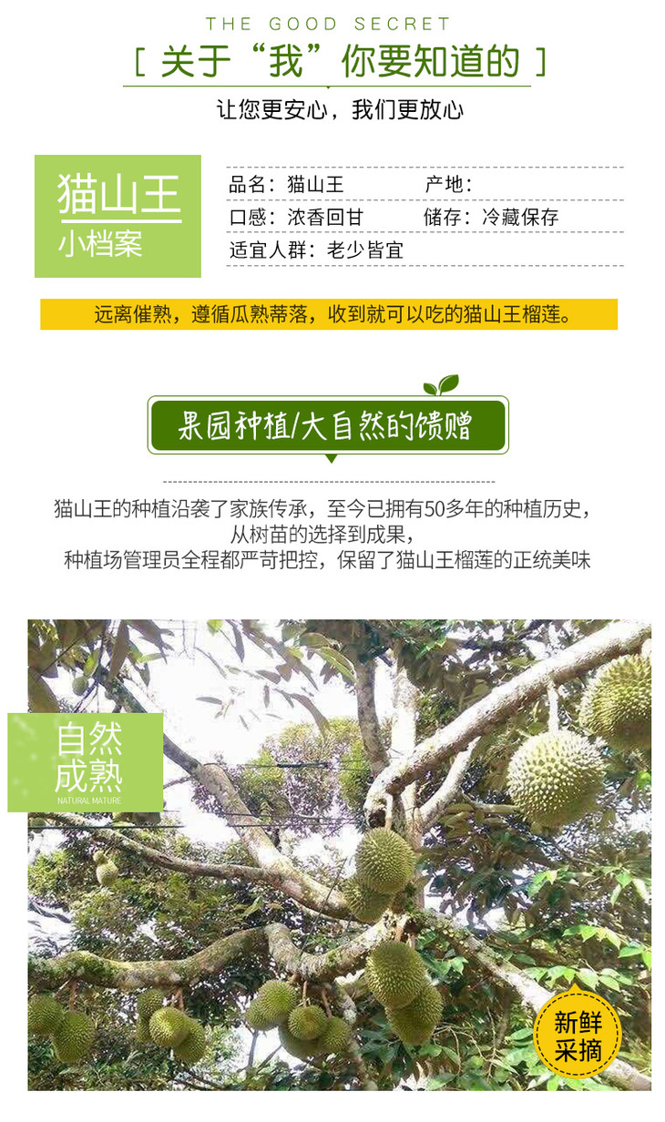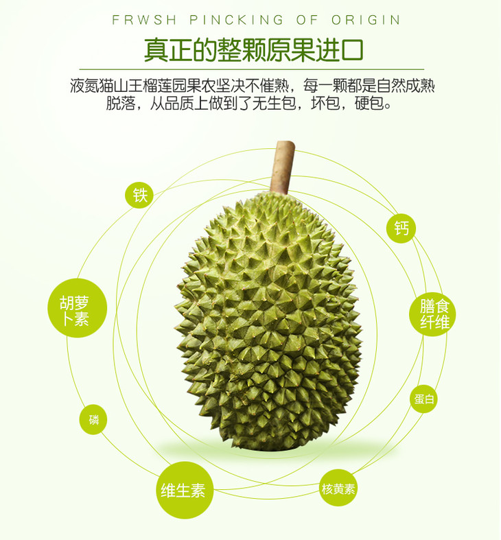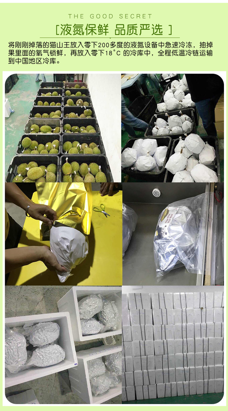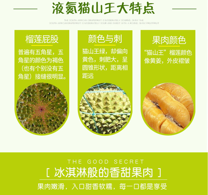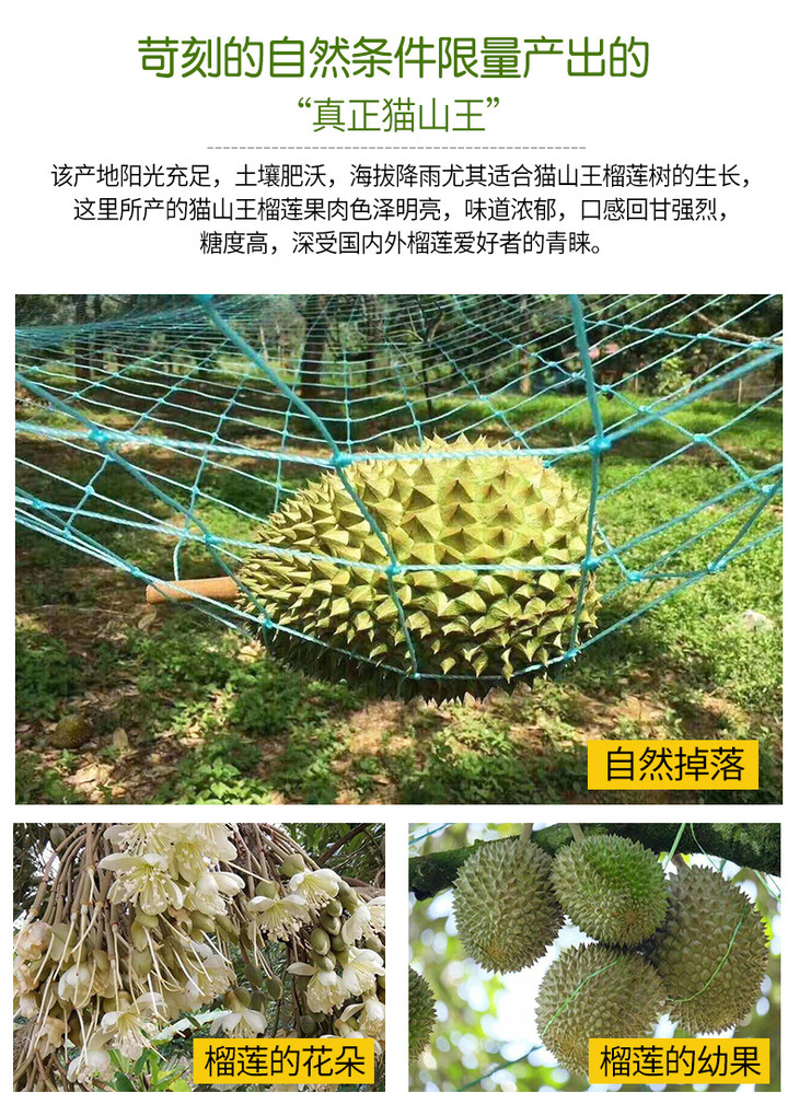 注意事项:猫山王在运输过程中可能会被榴莲刺扎破,猫山王主要靠冷冻保鲜,不是靠真空,所以包装袋运输路上漏气不影响品质,介意慎拍!!!!