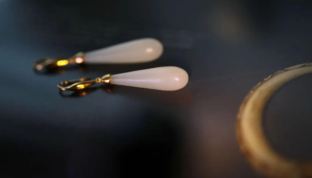 这一对水滴白玉镶嵌24k黄金耳环,文秀典雅,