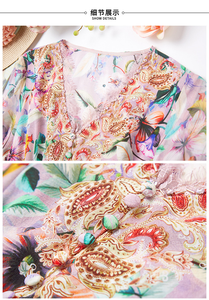FP-F5104新款V领蕾丝花边真丝印花裙