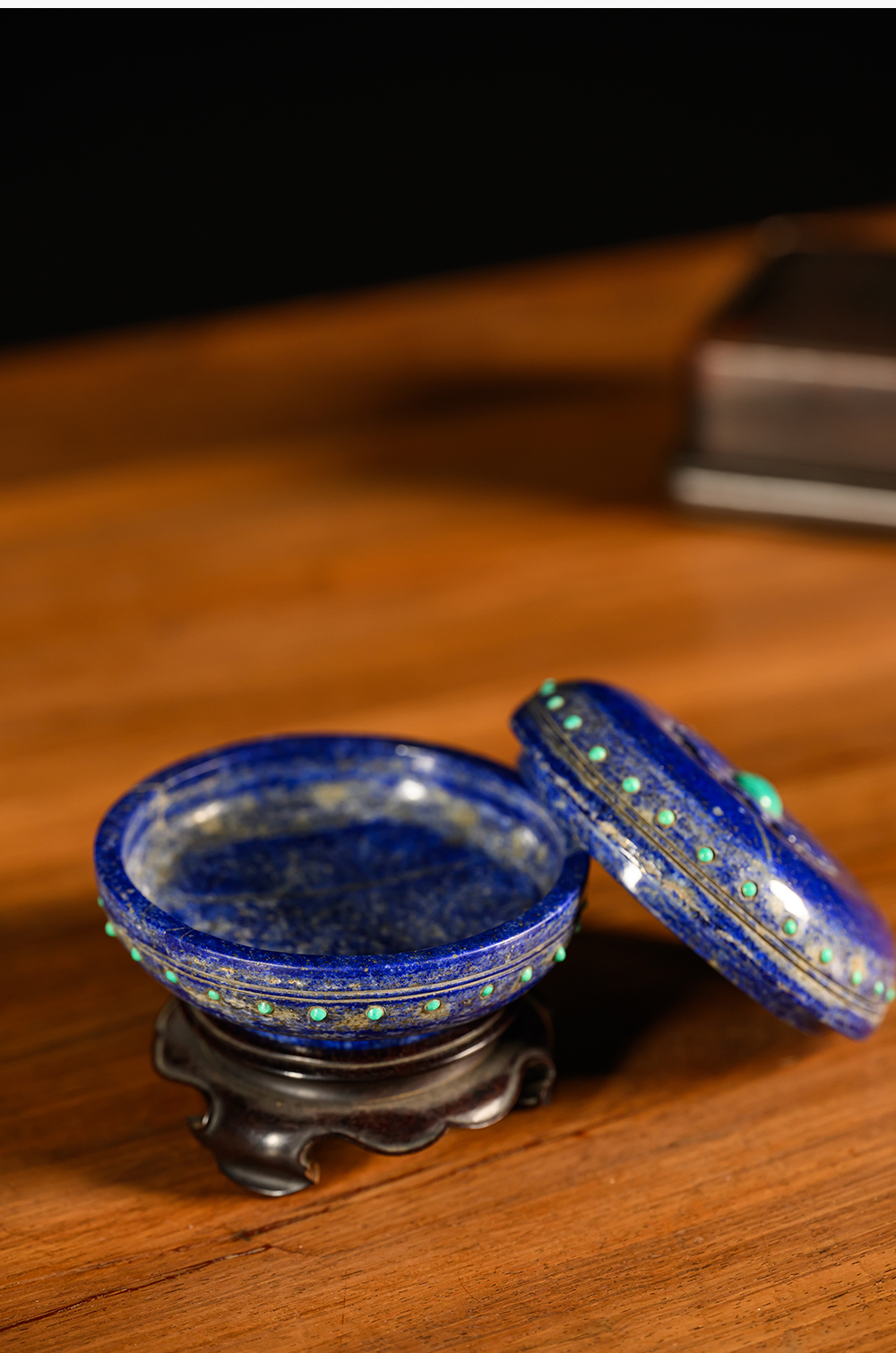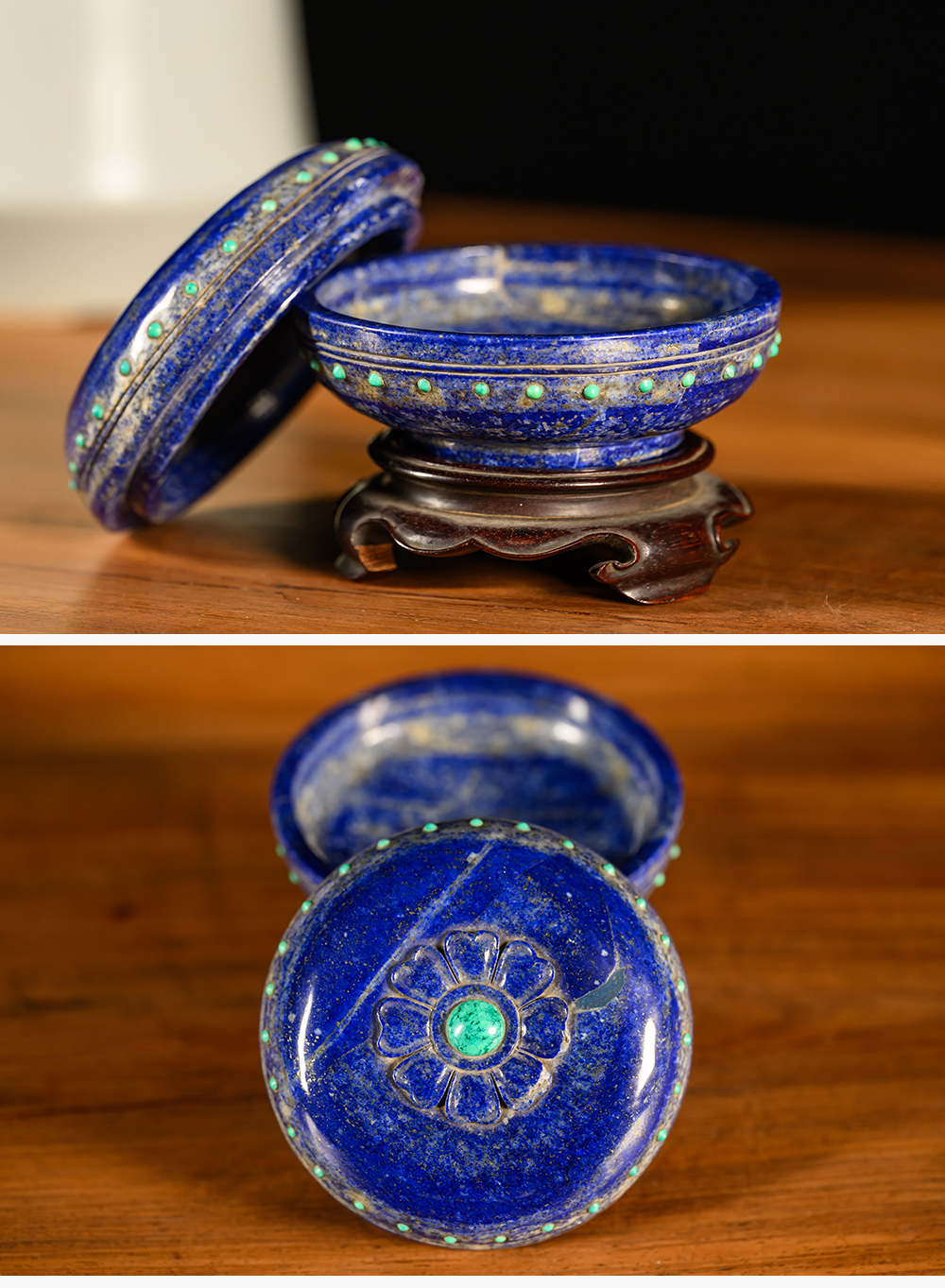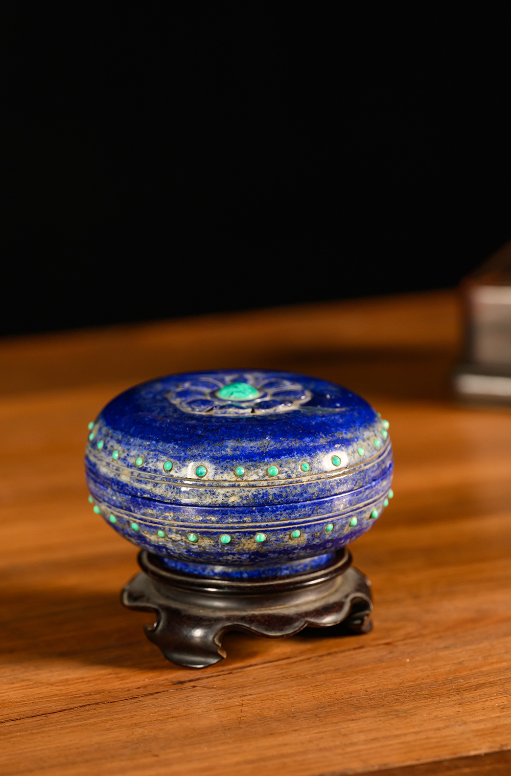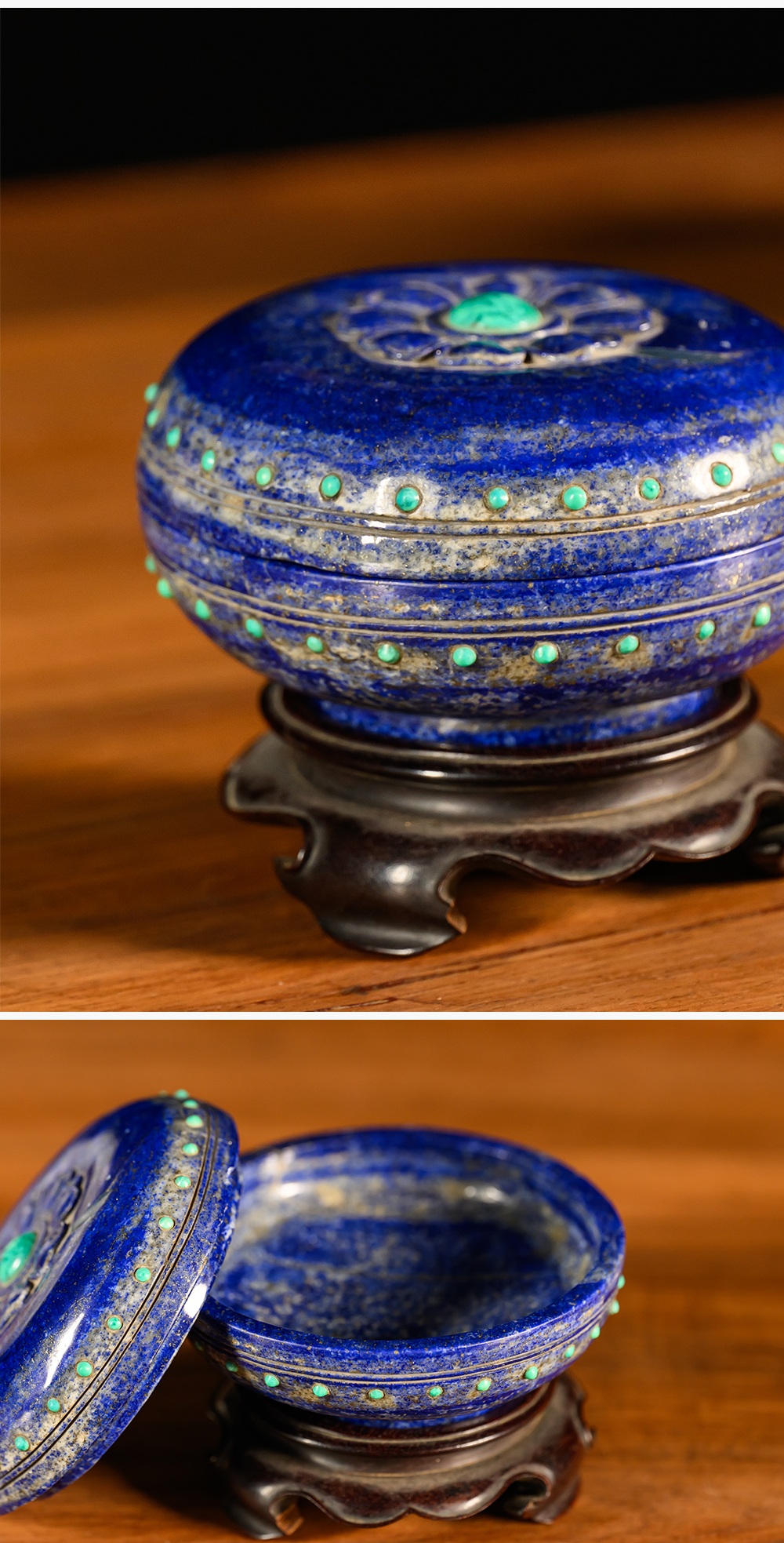 清 青金石嵌绿松石莲花盖盒(红木座)