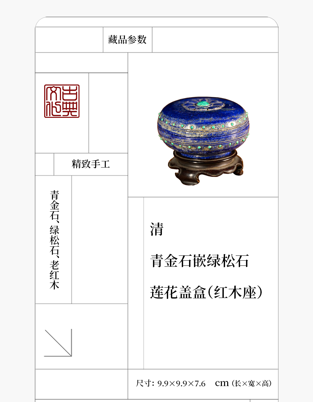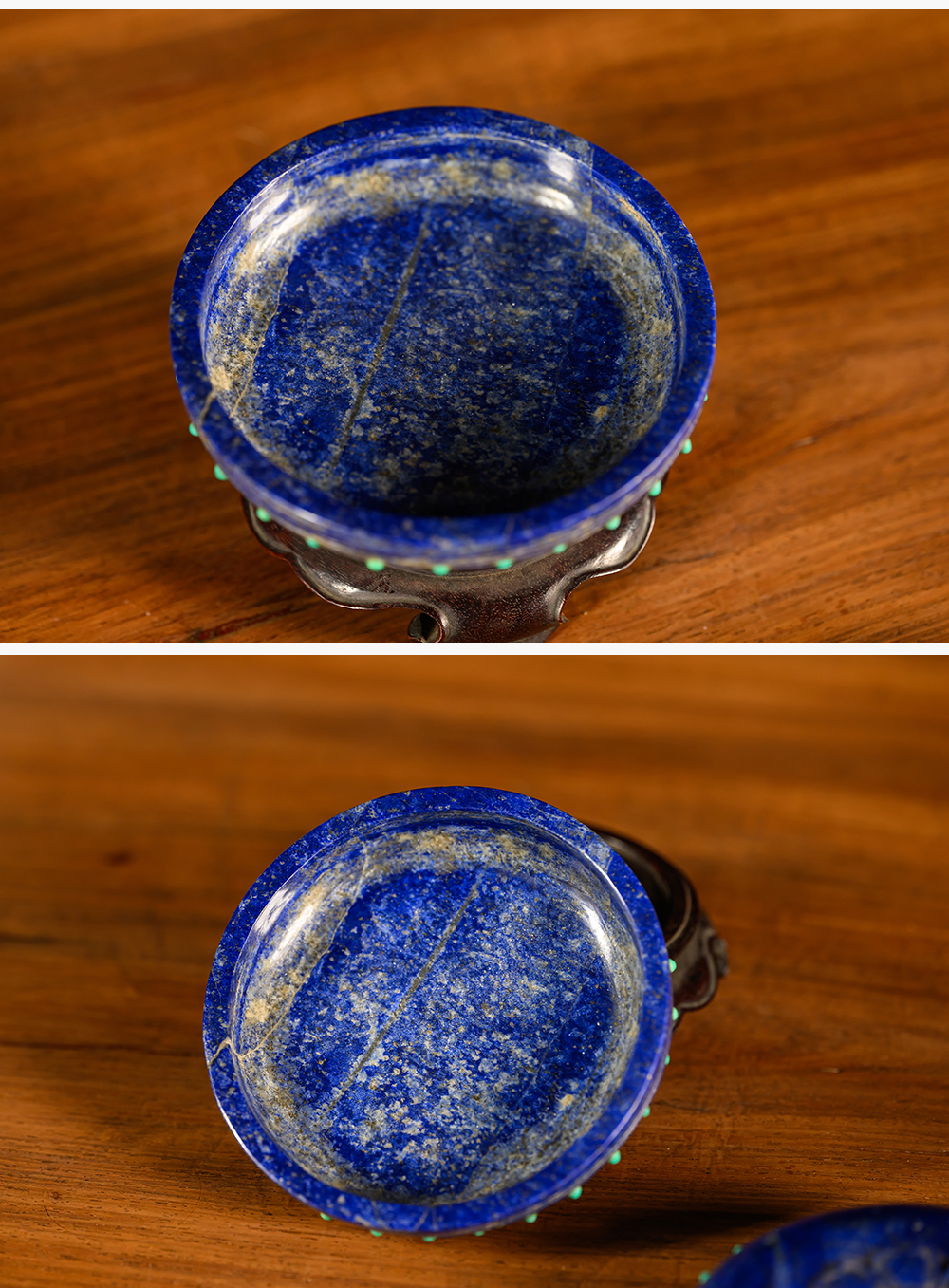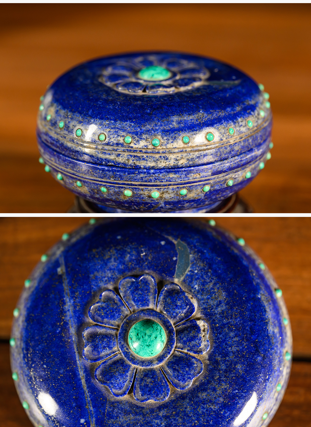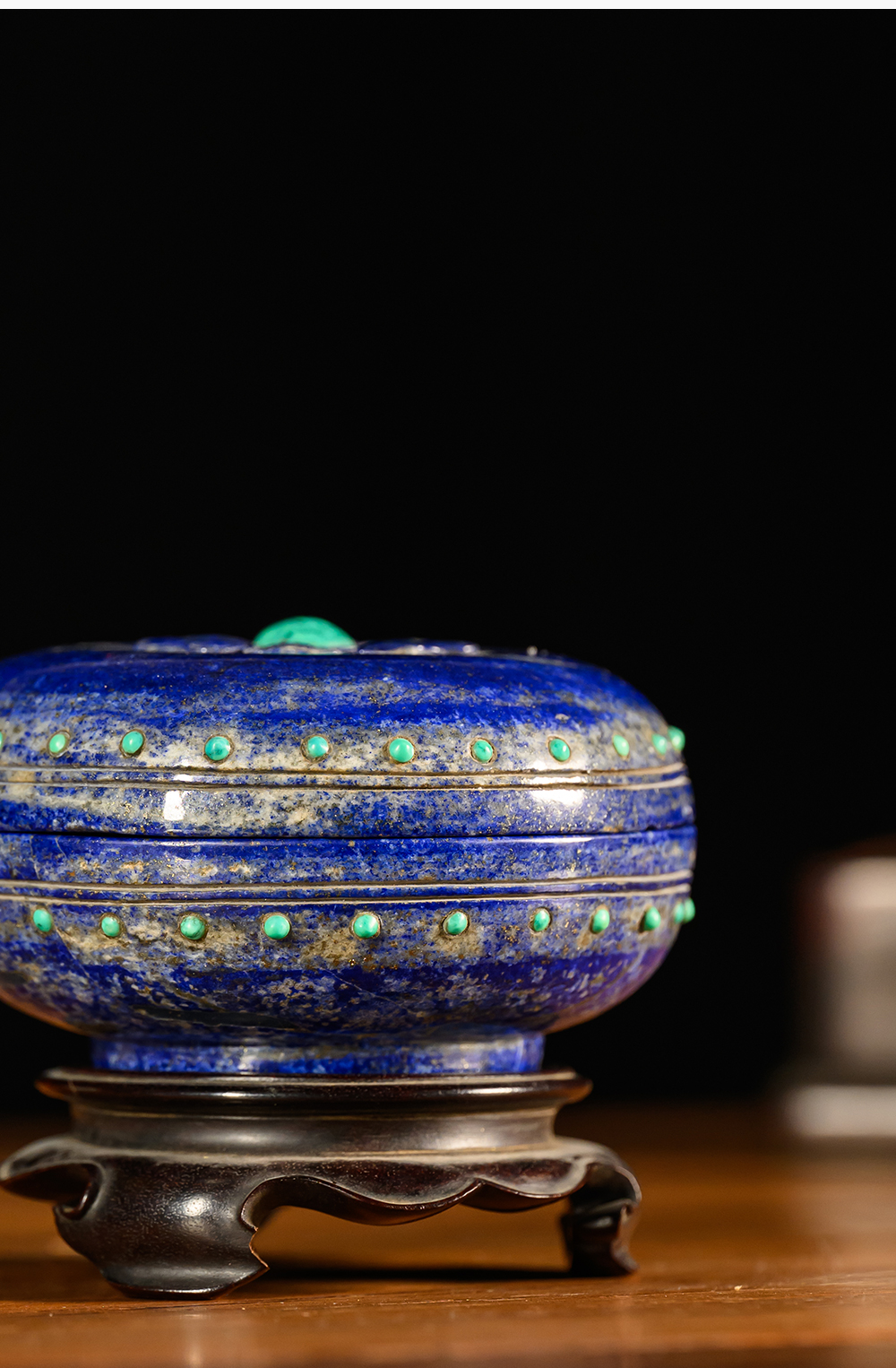 清 青金石嵌绿松石莲花盖盒(红木座)