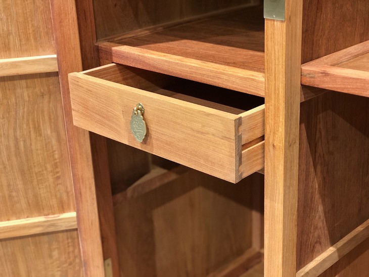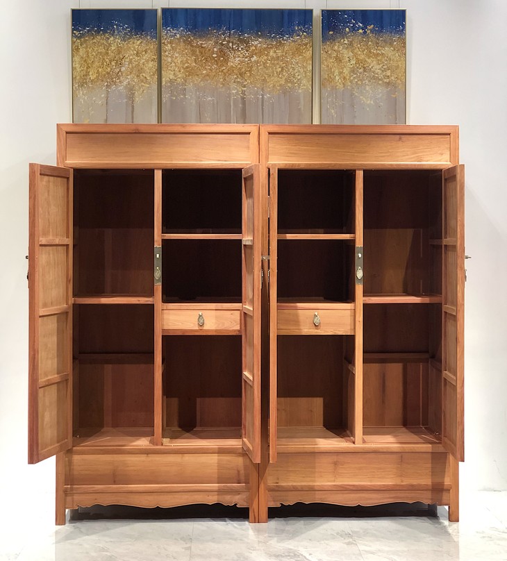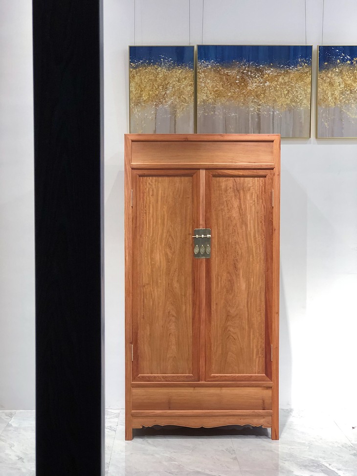 李渔在《闲情偶记》中写:造橱立柜,无他智巧,总以多容善纳为贵。此款复刻即对其内部空间进行了更大化的利用。柜内依闩杆为界设通高隔板,一边设可卸式挂杆、层板,一边设抽屉一具。门下柜膛安提拉式盖板做闷仓。整体实用功能尤佳,是传统明式家具应用于当代生活的改良式复刻佳作。