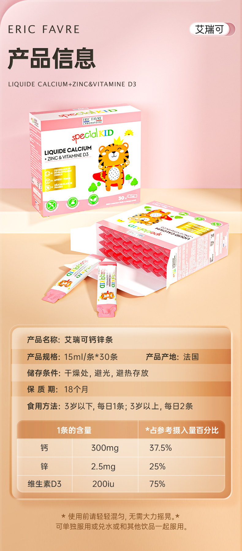 【跨境】法国艾瑞可Eric Favre儿童钙条钙锌条 15ml*30条