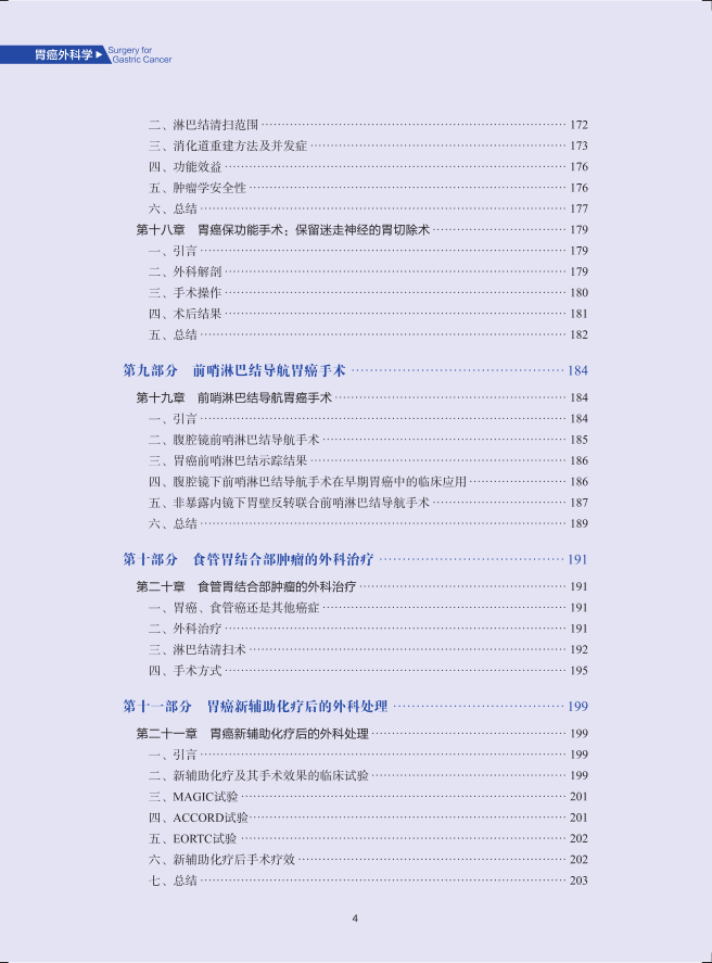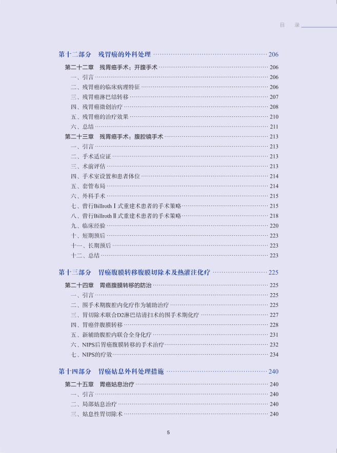 本书主要从胃癌外科发展史、胃癌病理分期、诊断和治疗几个方面进行描述,其中胃癌的治疗包括早期胃癌治疗、开放手术、腹腔镜及机器人手术、保功能手术、前哨淋巴结导航手术、食管胃结合部癌外科治疗、新辅助化疗后外科处理、残胃癌手术、腹膜转移热灌注化疗、姑息处理、术后管理与随访、新辅助治疗、围手术期化学治疗、放射治疗及各种靶向药物治疗。此书的出版将为我国胃癌诊治标准化提供参考,为提高我国胃癌诊治水平做出积极贡献。