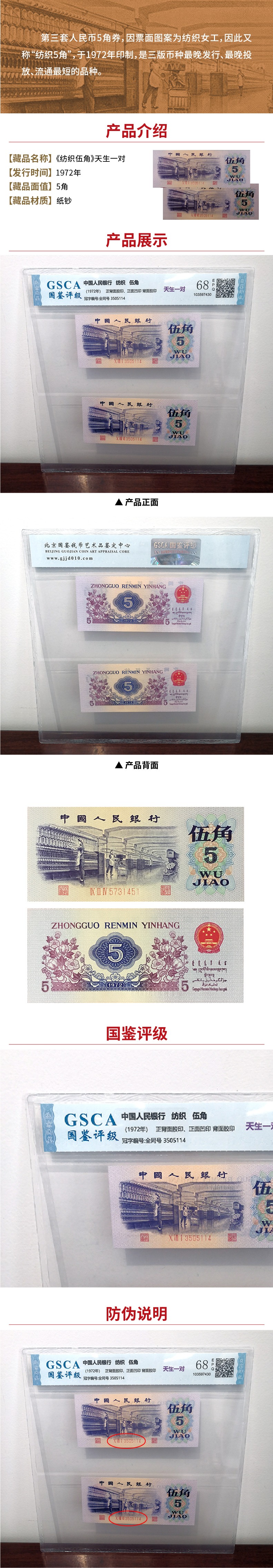 【天生一对】第三套人民币 纺织伍角封装评级版