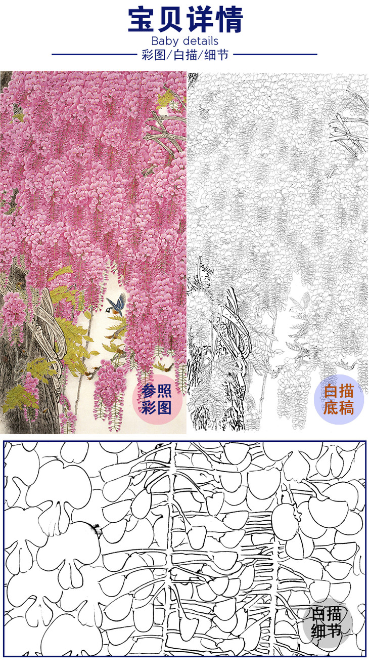 竖幅工笔花鸟白描底稿-周彦生-紫藤-《紫气春来》-多种白描尺寸可选-QN03