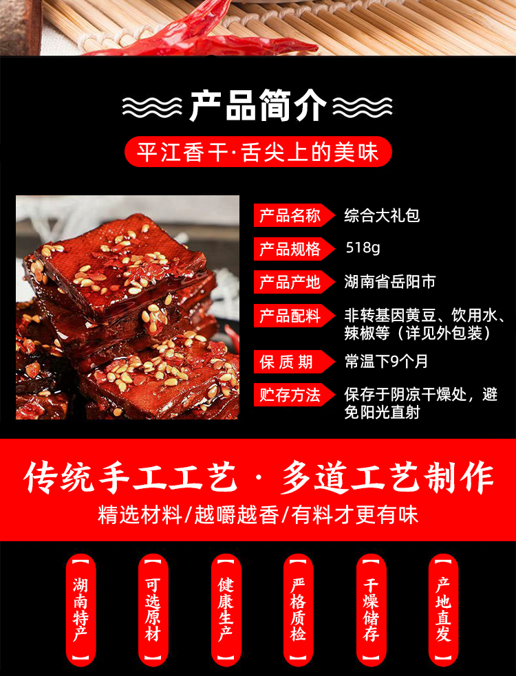 【周三会员日限时折扣】长寿人家平江酱干大礼包香辣味518g/包