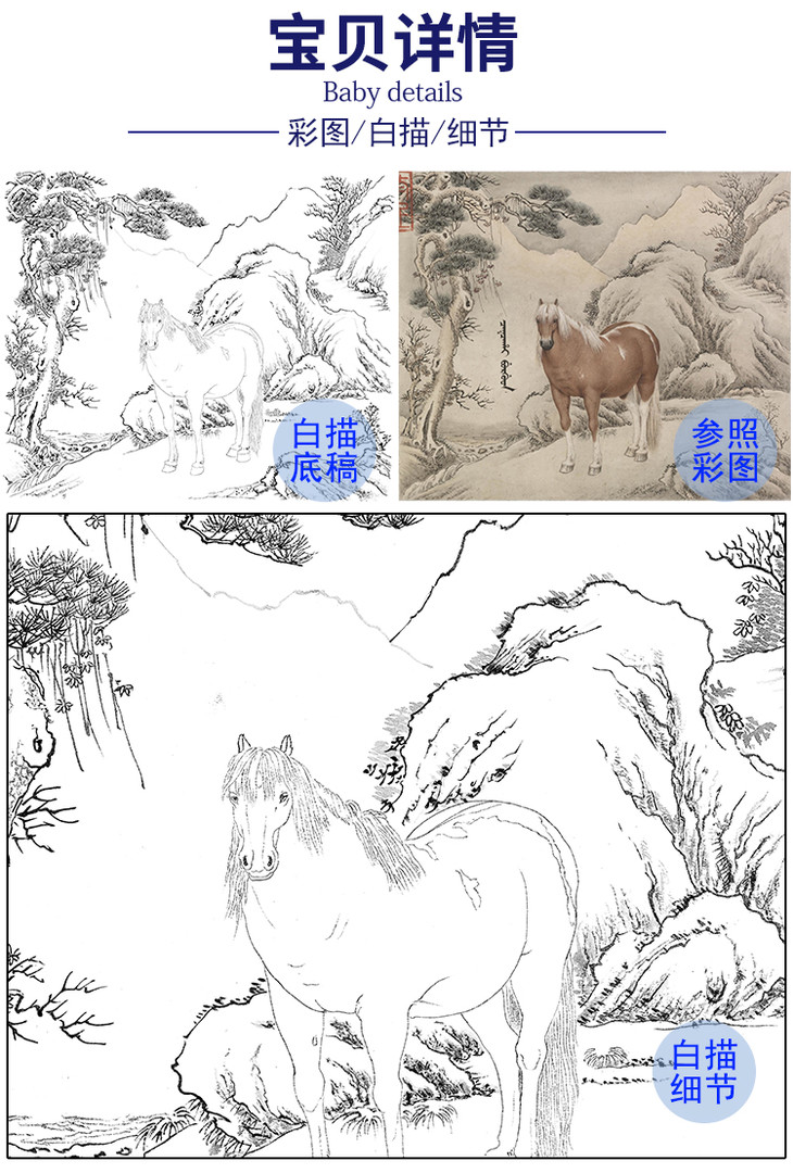 竖幅工笔花鸟白描底稿-周中耀樱花-染香《莺鸣一两啭樱花数重开》-多种白描尺寸可选-FV12