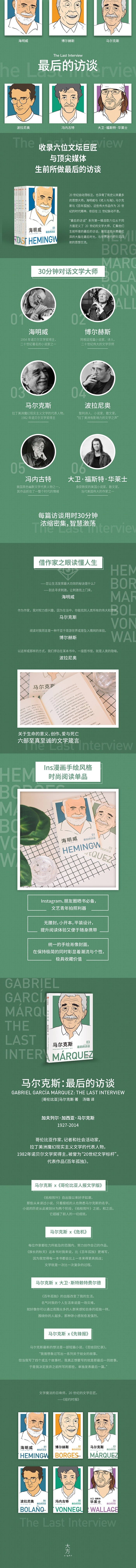 “最后的访谈”系列辑,收录六位二十世纪文坛巨匠(海明威、博尔赫斯、马尔克斯、波拉尼奥、冯内古特、大卫•福斯特•华莱士)与国际媒体生前所做后的访谈。