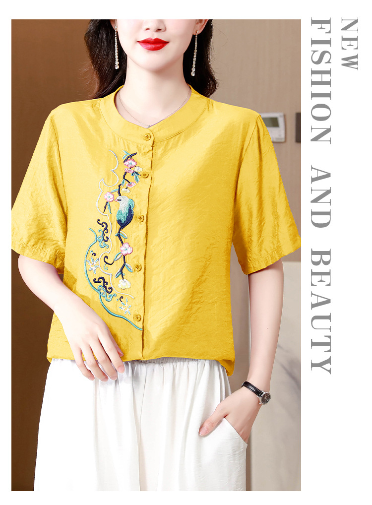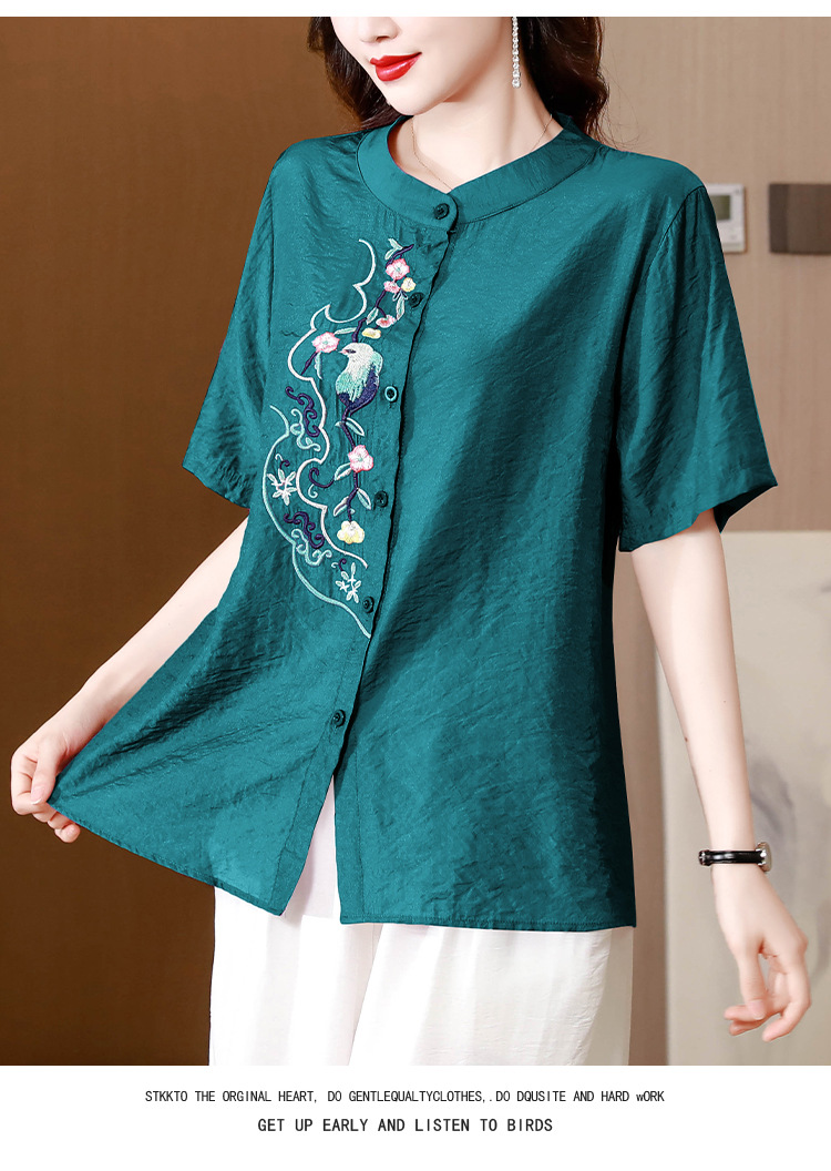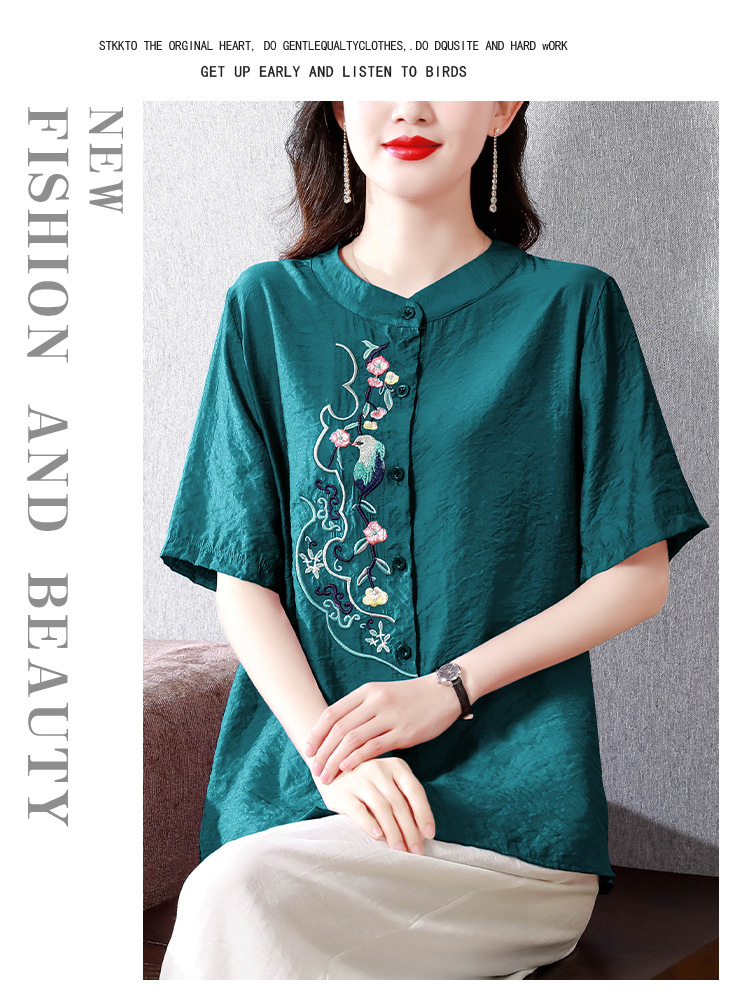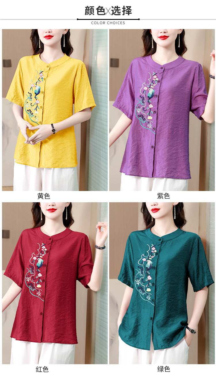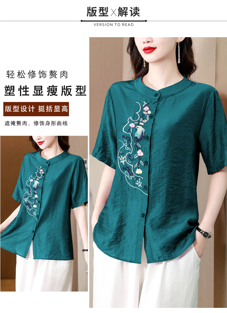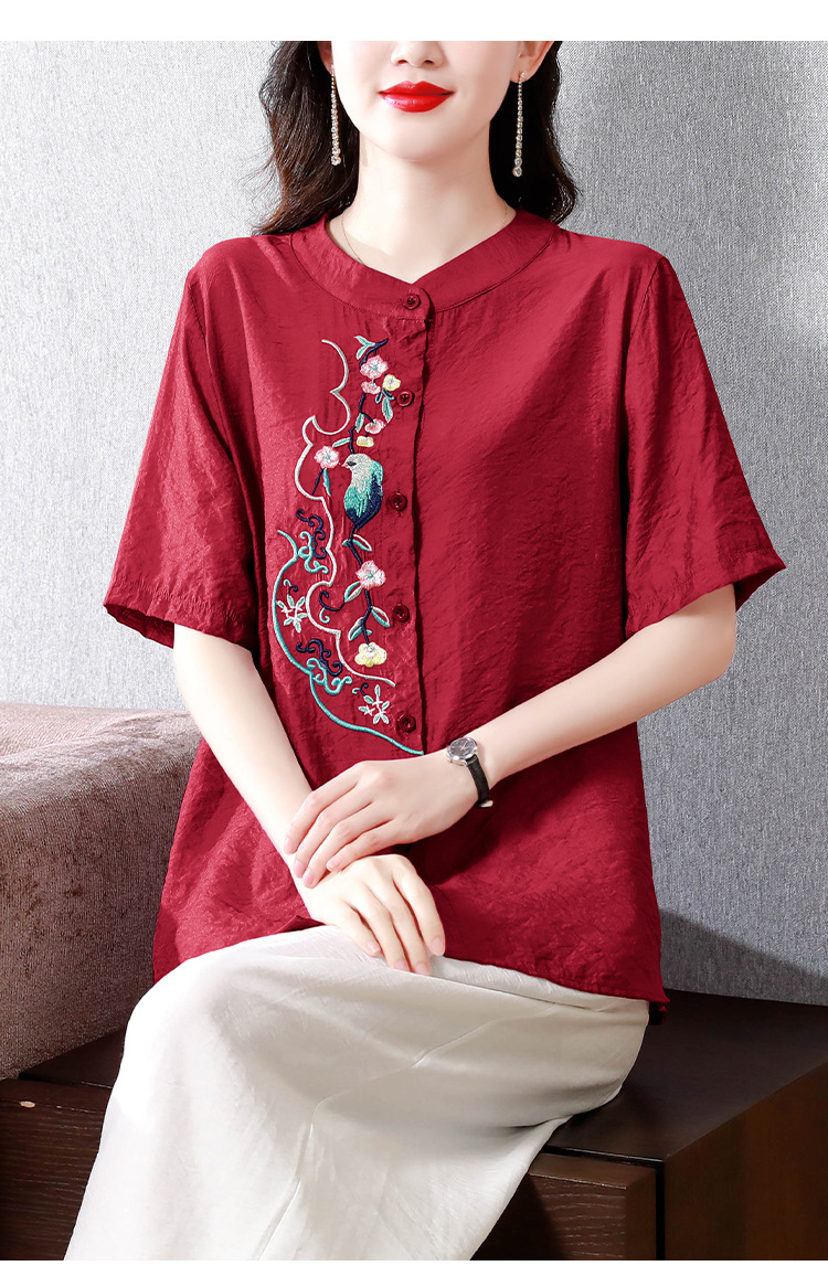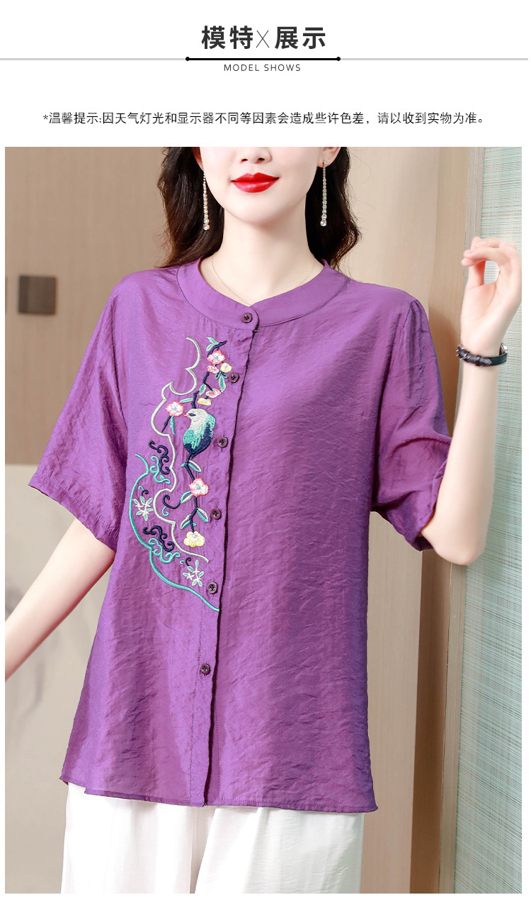 DD-新款五分袖棉麻刺绣宽松大码唐装衬衫衬衣