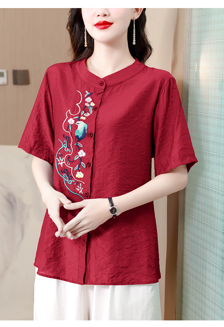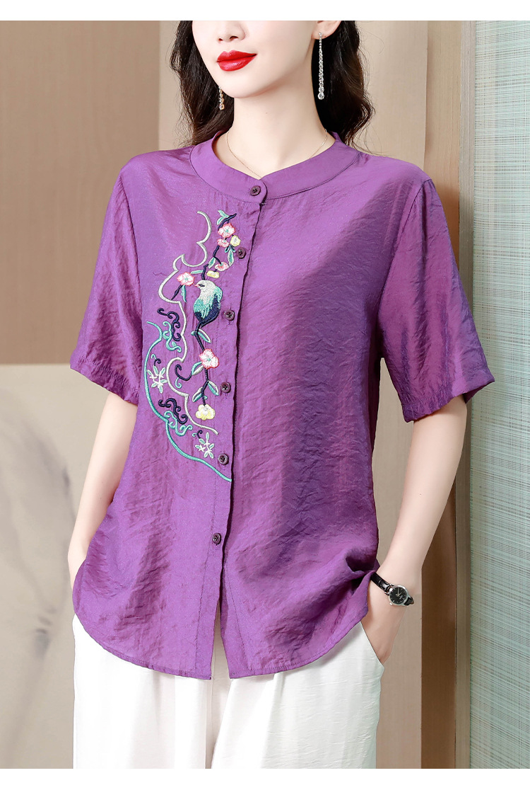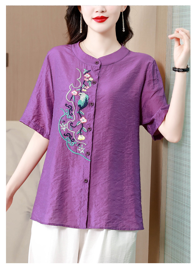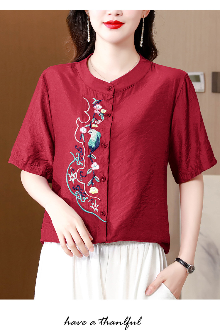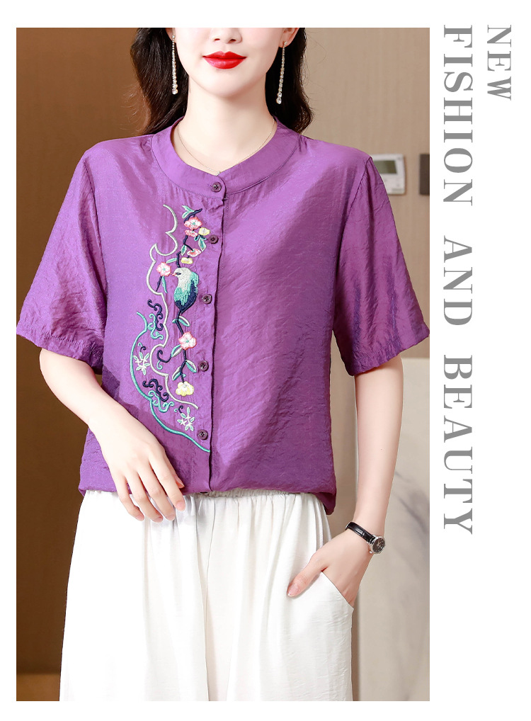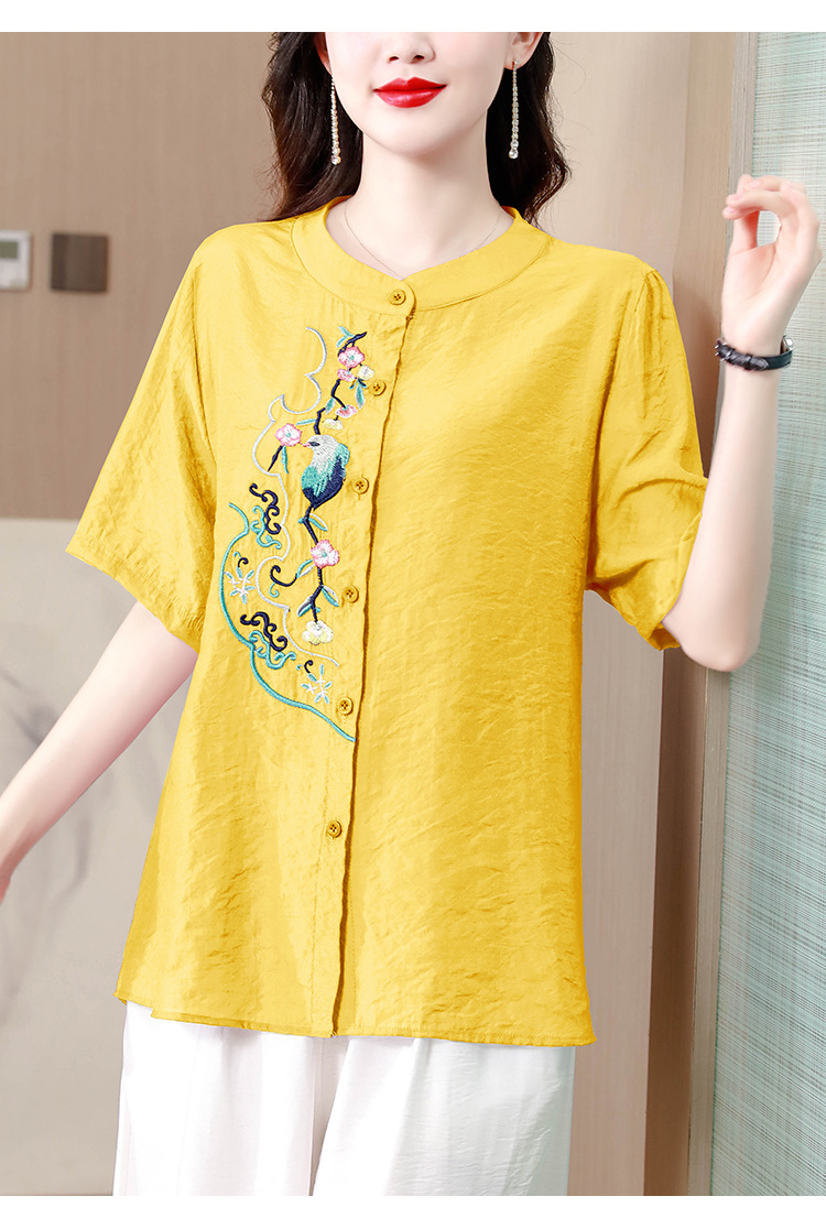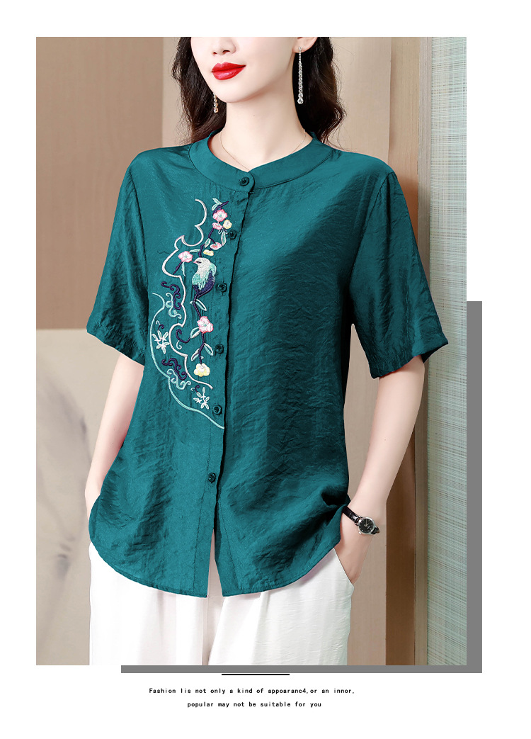DD-新款五分袖棉麻刺绣宽松大码唐装衬衫衬衣