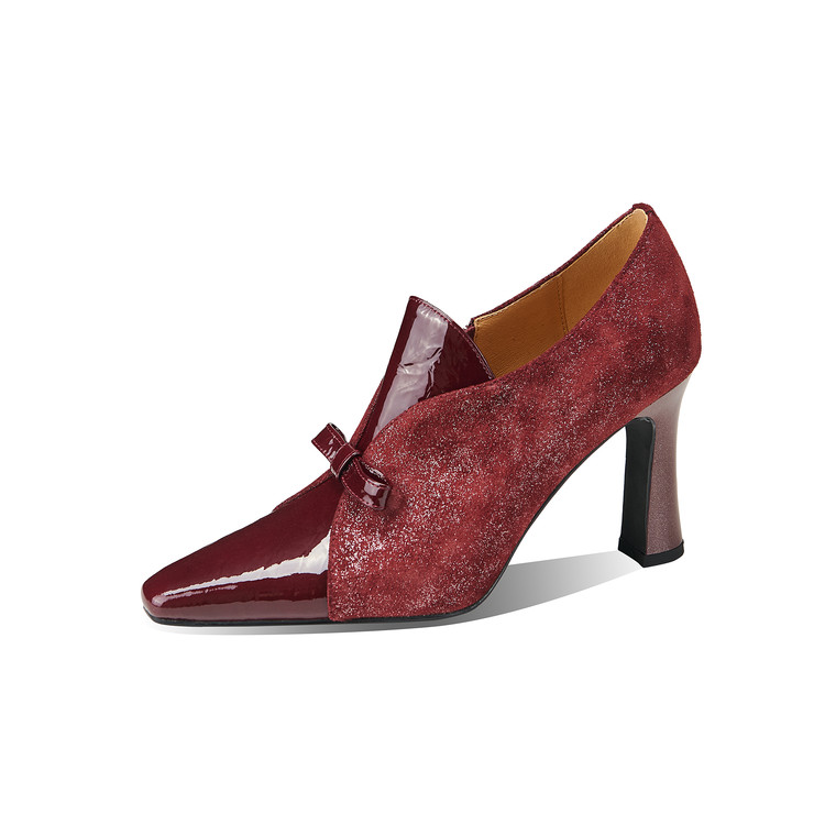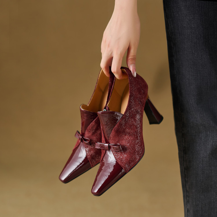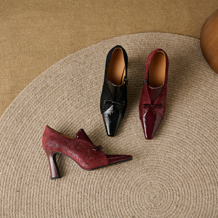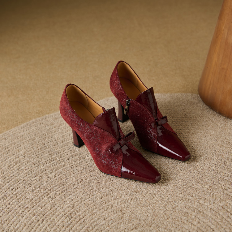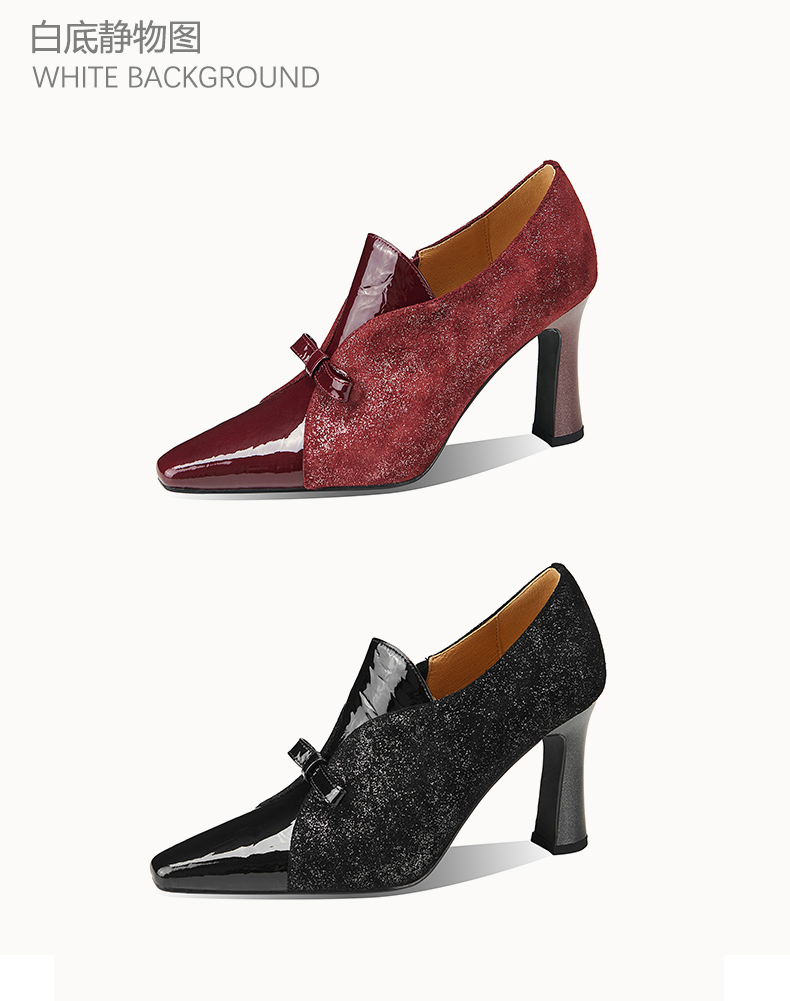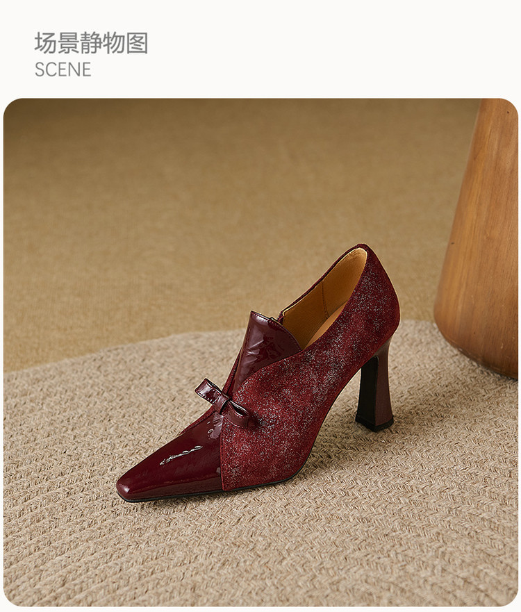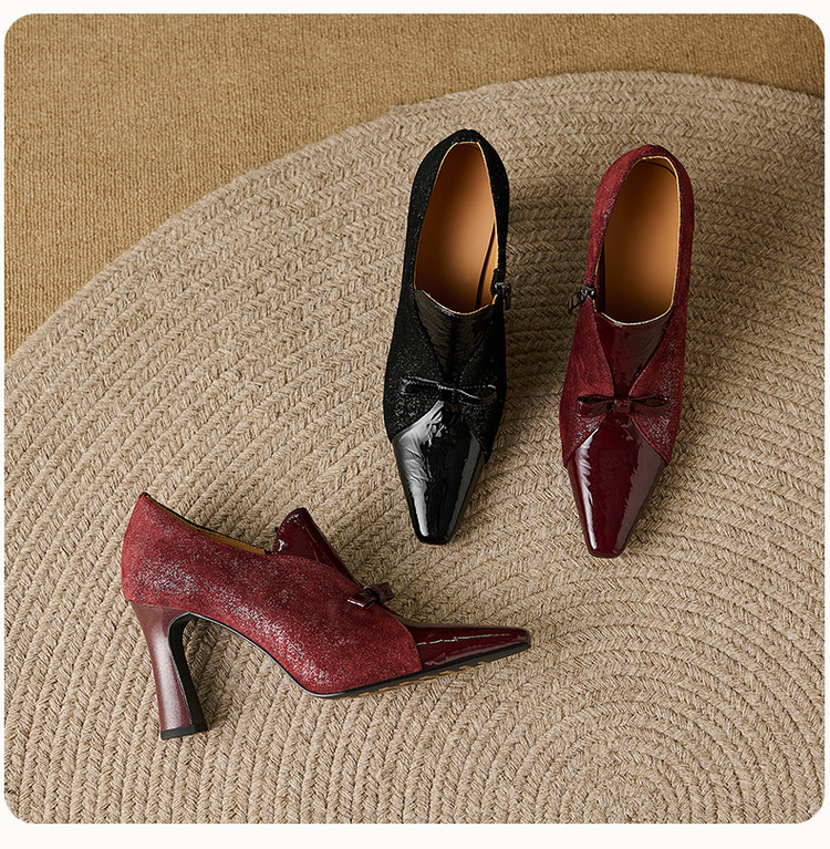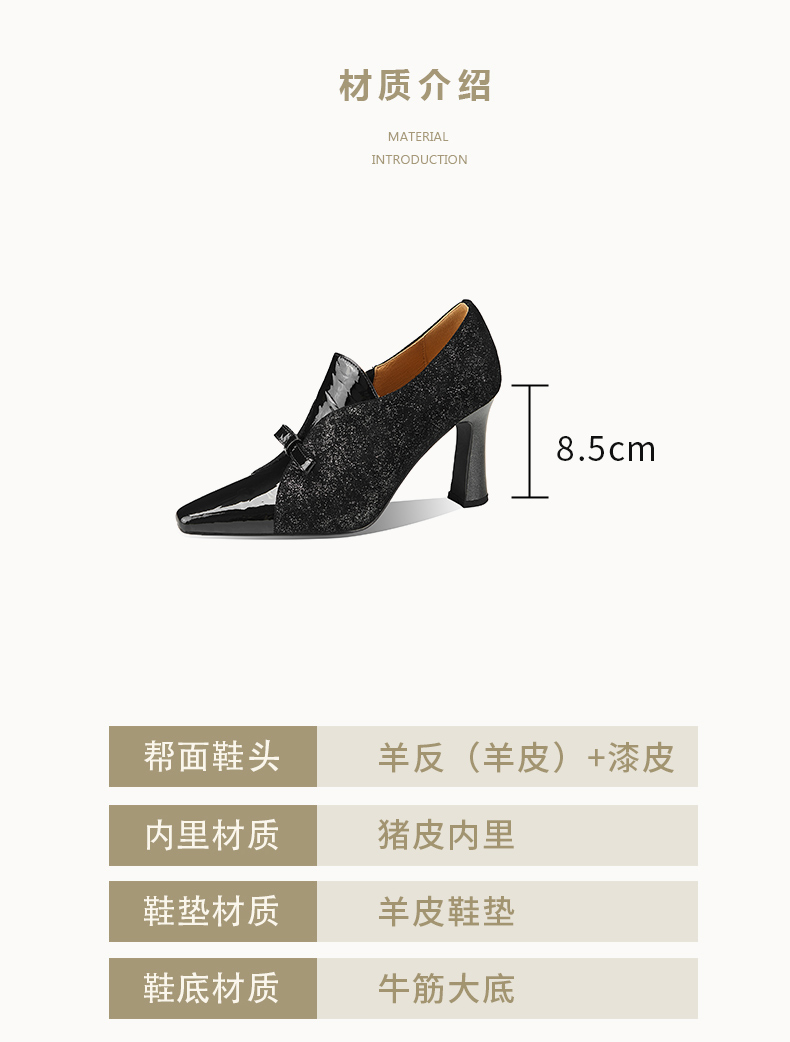 【鞋面材质】羊皮(羊反)+漆皮【鞋垫材质】猪皮【内里材质】羊皮【鞋底材质】牛筋底【跟 高】8.5cm【颜 色】黑色 酒红色【尺 码】34 35 36 37 38 39