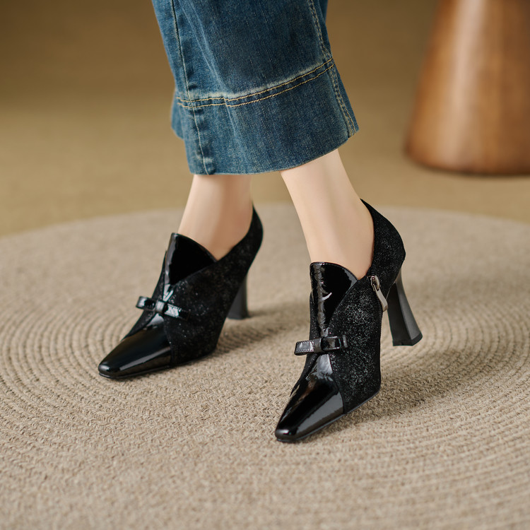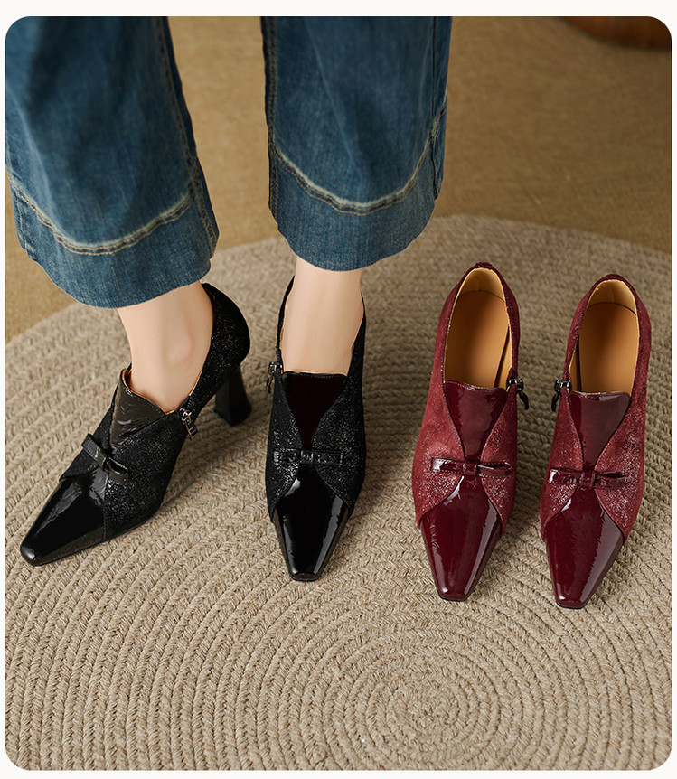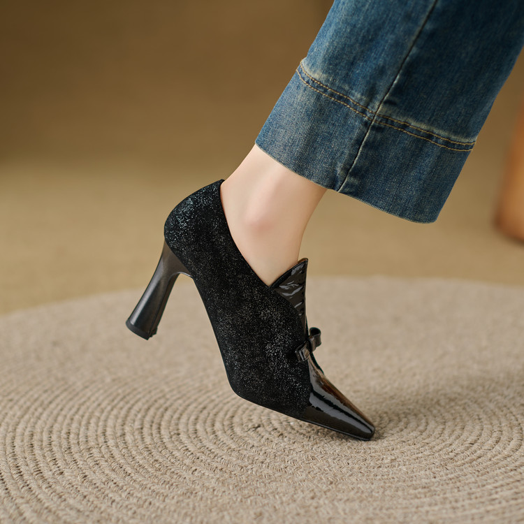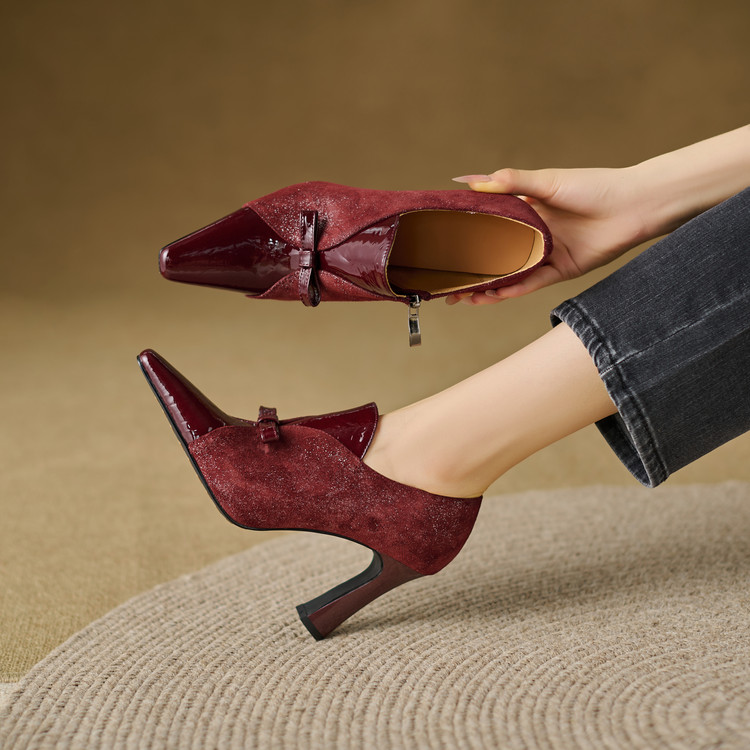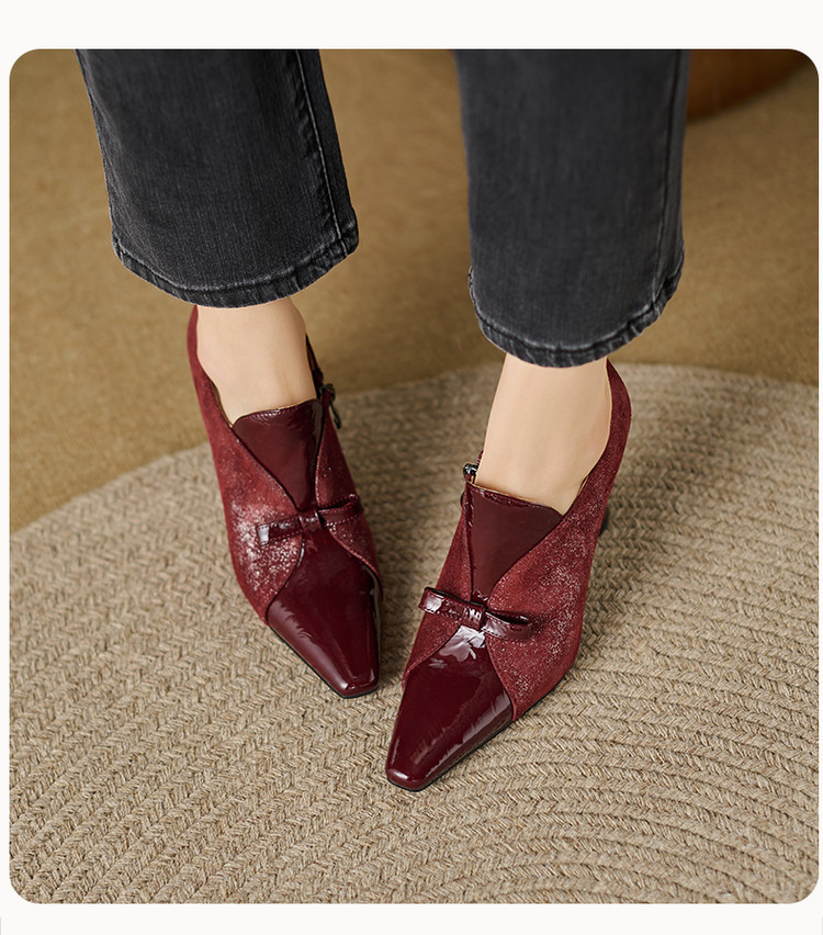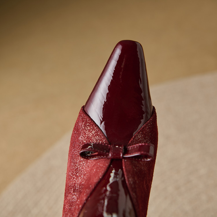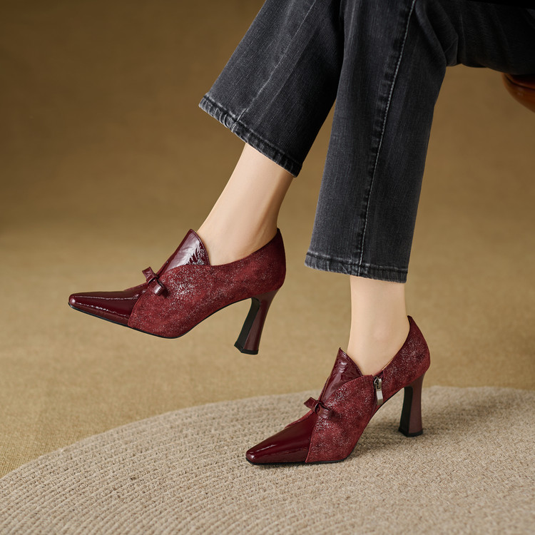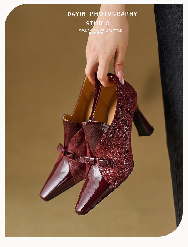 【鞋面材质】羊皮(羊反)+漆皮【鞋垫材质】猪皮【内里材质】羊皮【鞋底材质】牛筋底【跟 高】8.5cm【颜 色】黑色 酒红色【尺 码】34 35 36 37 38 39