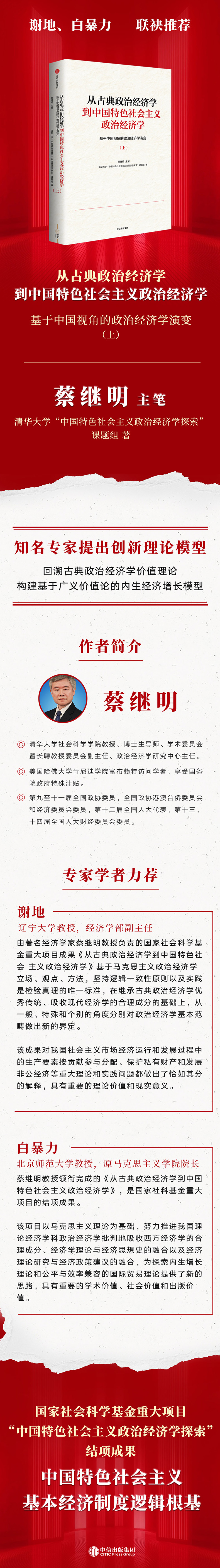 蔡继明教授领衔完成的《从古典政治经济学到中国特色社会主义政治经济学》,是国家社科基金重大项目的结项成果。该项目以马克思主义政治经济学方法论为指导,在继承古典政治经济学优秀传统、批判地吸收现代经济学的合理成分的基础上,从一般、特殊和个别的角度分别对政治经济学基本范畴做出新的界定;通过对传统劳动价值论、新古典价值论和斯拉法价值论的分析比较和综合,构建了广义价值论模型,依次分析了我国自改革开放以来从高度集中的计划经济向市场经济的转化,从单一按劳分配向按劳分配与按生产要素分配相结合的转化,从单一公有制向公有制为主体、多种有制经济共同发展的转化;在完成了对中国特色社会主义基本经济制度的理论阐释后,分别构建了基于广义价值论的内生经济增长模型和国际贸易模型,并具体讨论了城乡融合发展和土地制度改革以及中美贸易关系和发展中国家实现赶超战略的贸易政策选择,由此构建了一个基于广义价值论的中国特色社会主义政治经济学体系的框架,在同类出版物中具有鲜明的特点。该项目以马克思主义理论为基础,努力推进我国理论经济学科政治经济学批判地吸收西方经济学的合理成分、经济学理论与经济思想史的融合以及经济理论研究与经济政策建议的融合,为深入理解党的十六大以来确立的以按劳分配为主体与按生产要素分配相结合的原则以及以公有制为主体多种经济成分共同发展的基本经济制度,提供了一条具有新意和有益的思路,为探索内生增长理论和公平与效率兼容的国际贸易理论提供了新的思路,具有重要的学术价值、社会价值和出版价值。