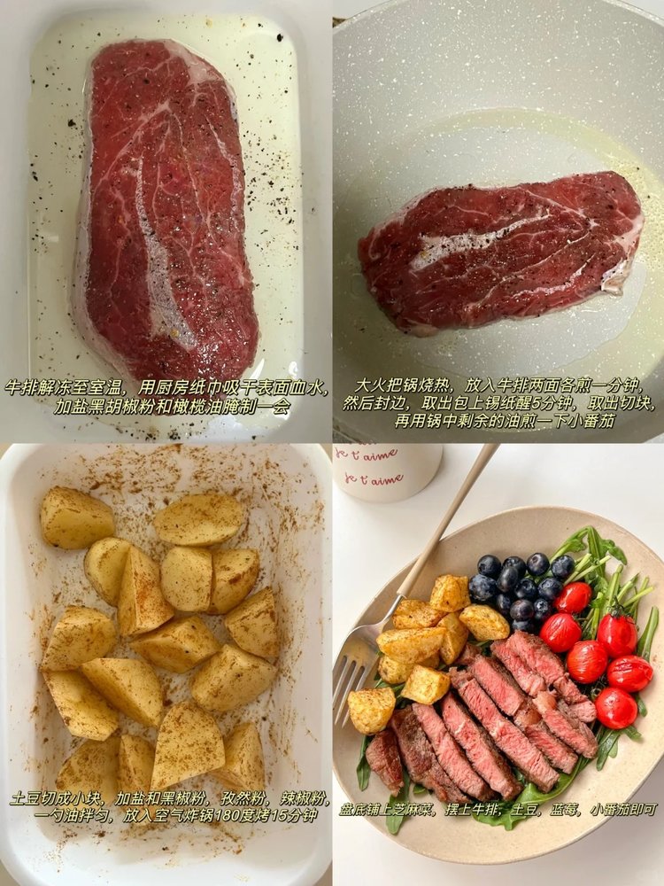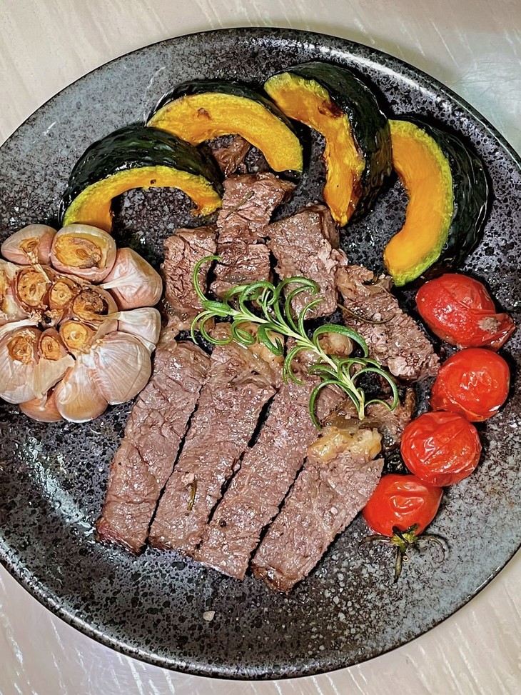 5、牛排起锅放在盘子里醒肉3-5分钟,醒好肉切肉摆件,搭配果蔬一起摆个超级好看的盘