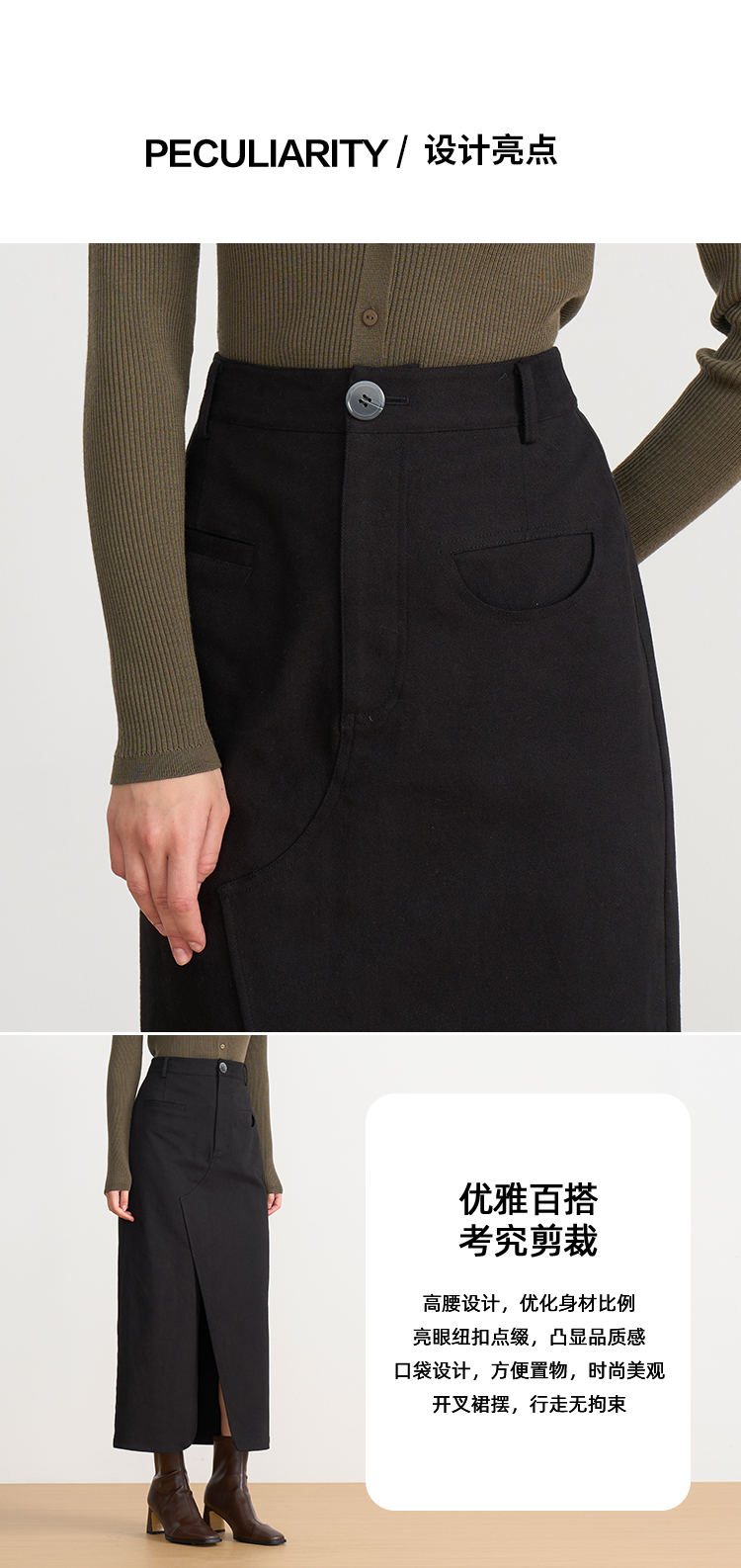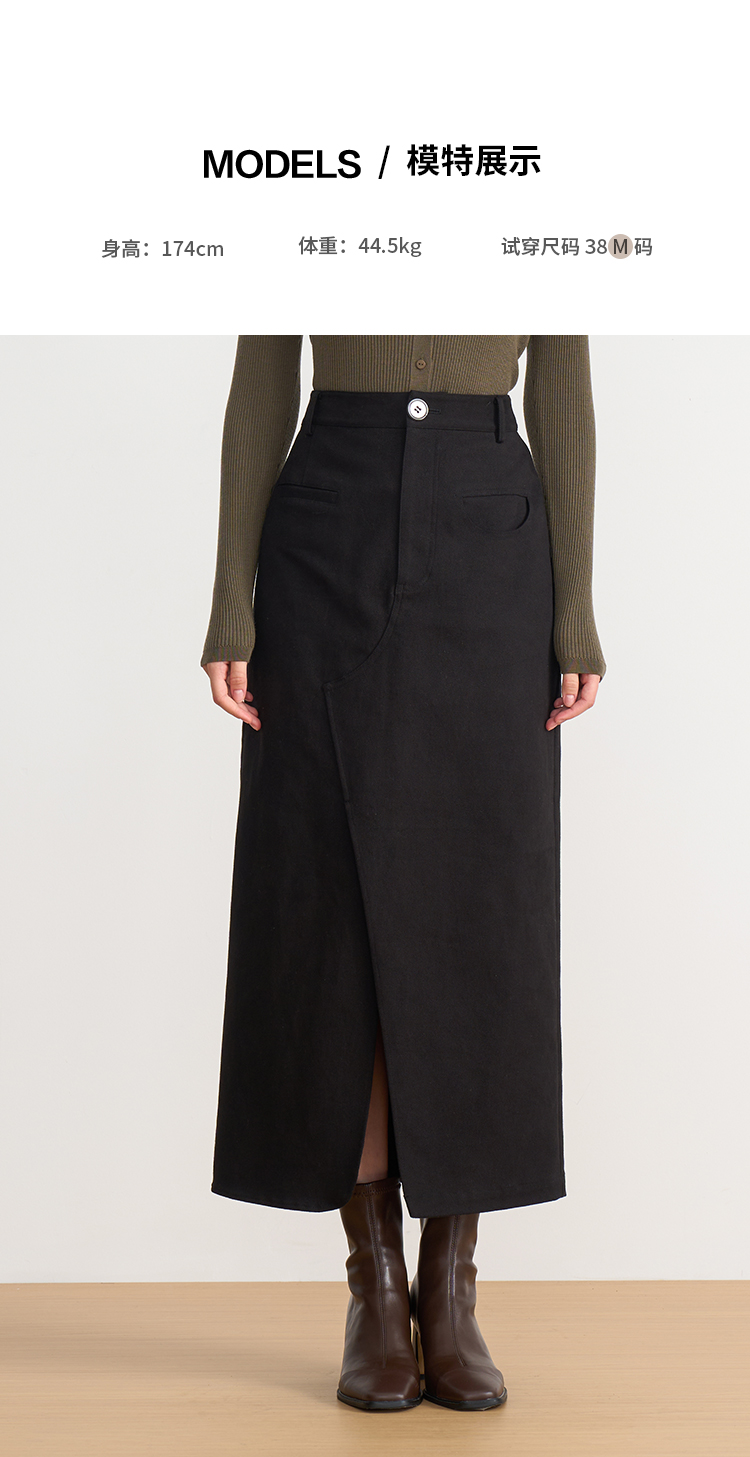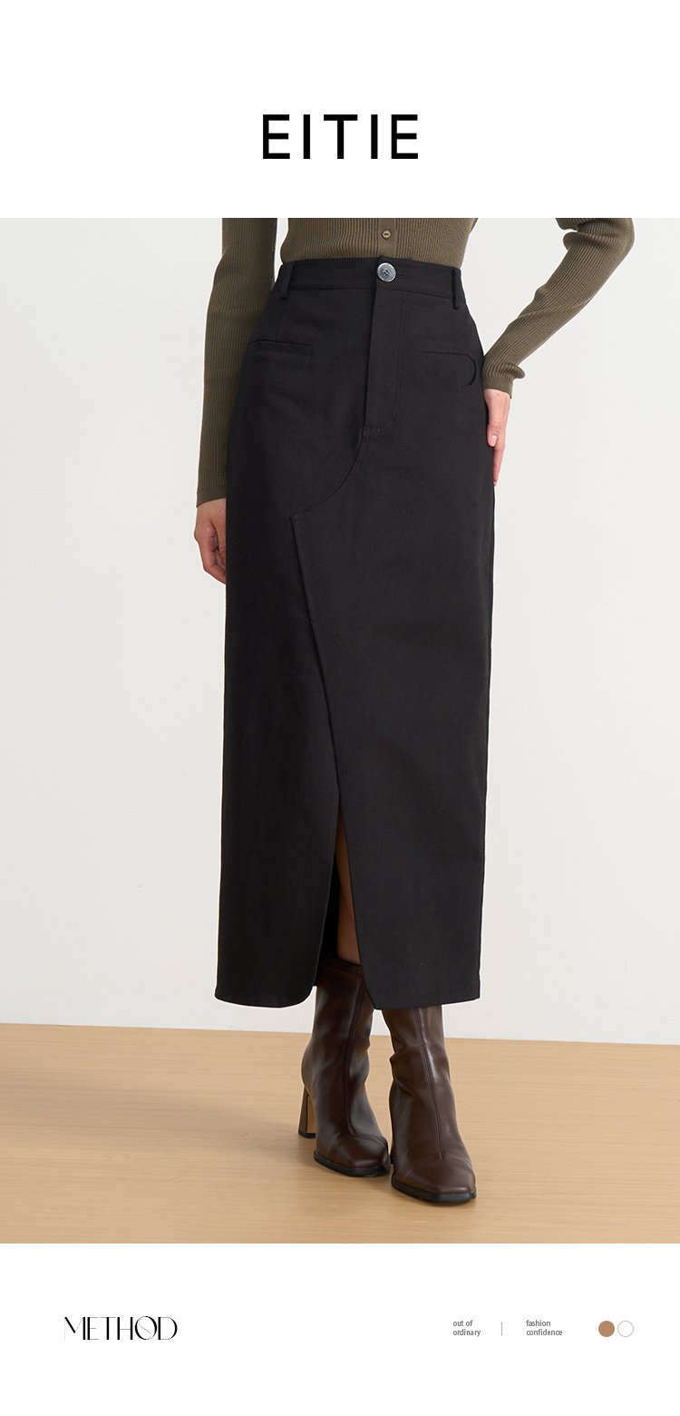 EITIE爱特爱挺括工装设计感不对称高腰黑色长款半裙2025秋季新款C2506816