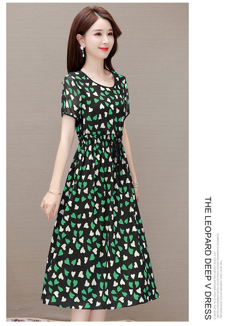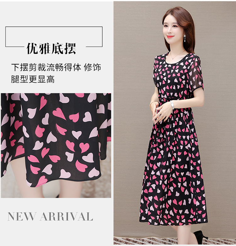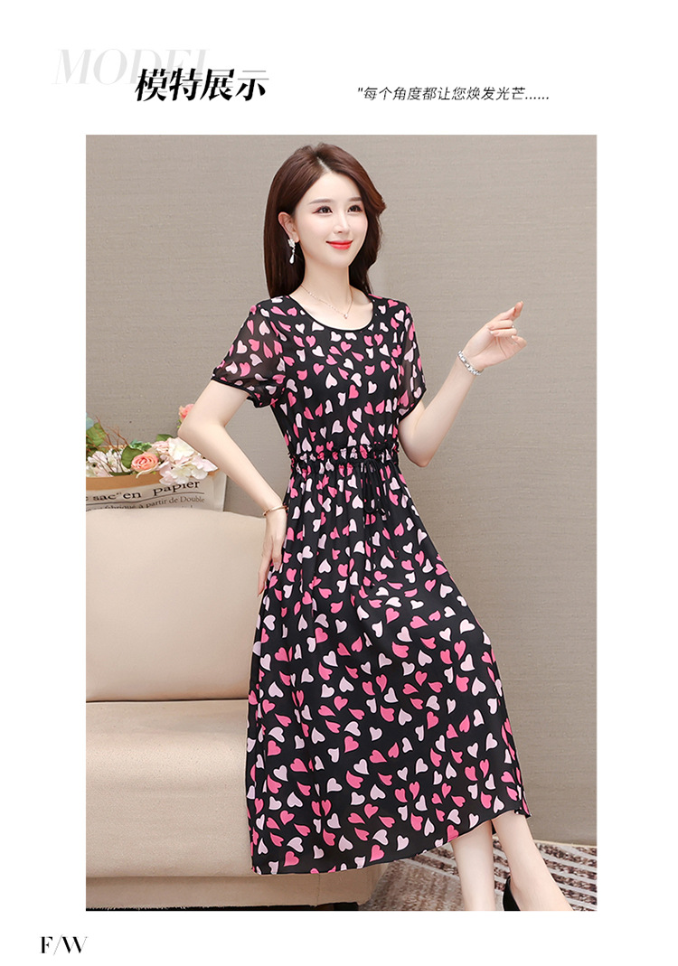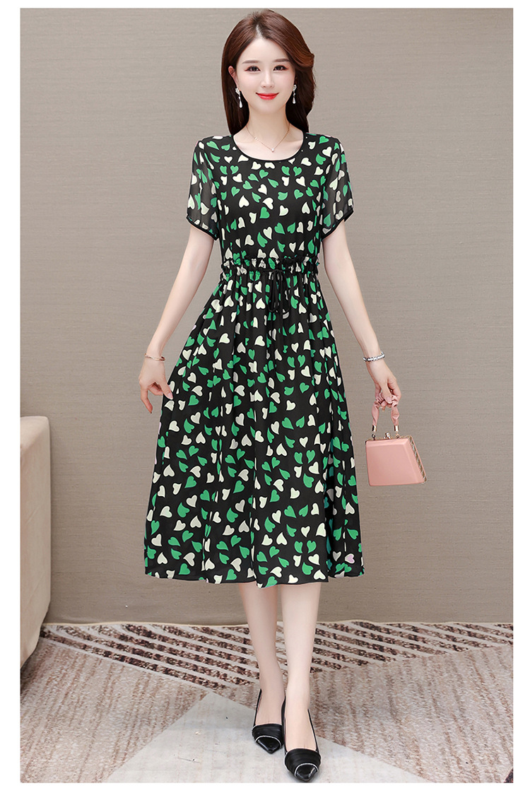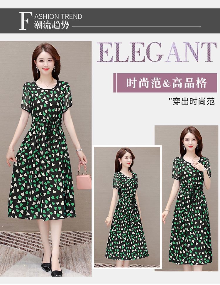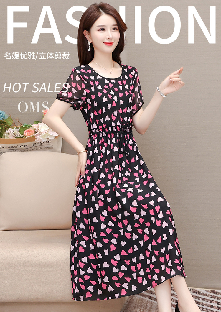 简约修身,夏款中长款印花时尚雪纺裙圆领短袖气质休闲连衣裙QYM-OMS-SLA318-L