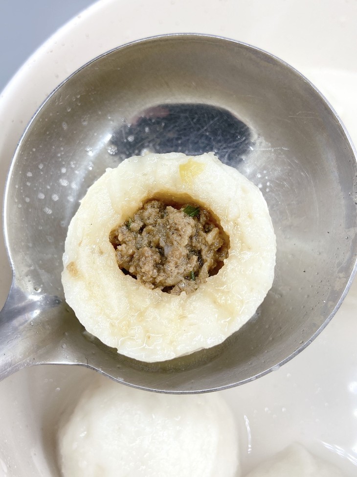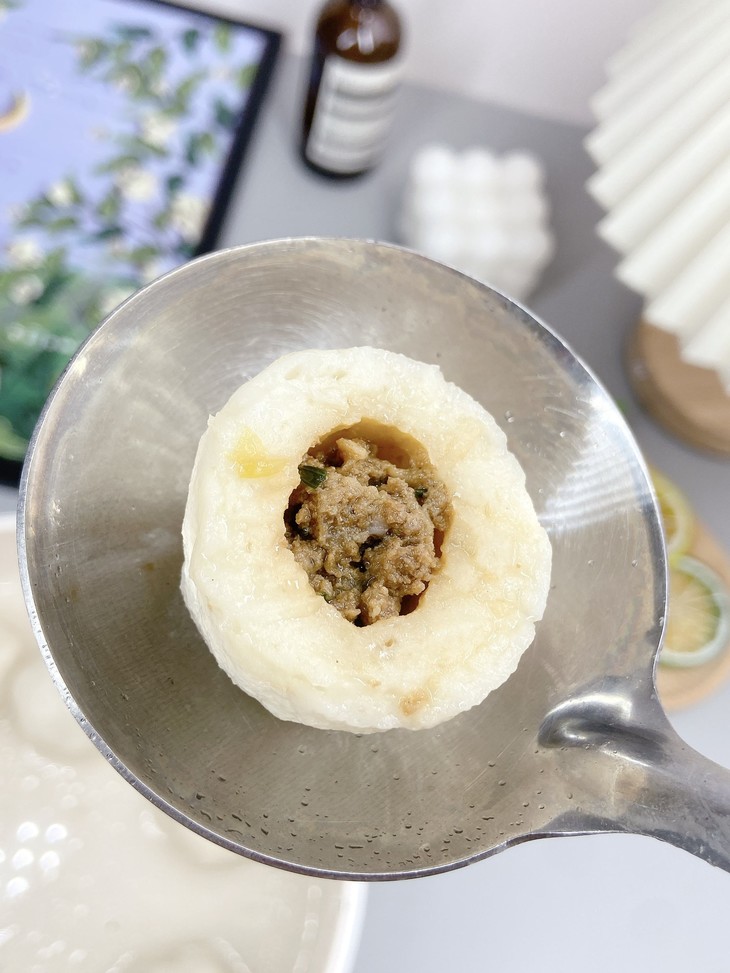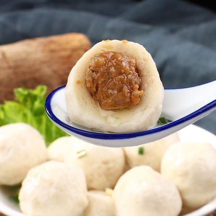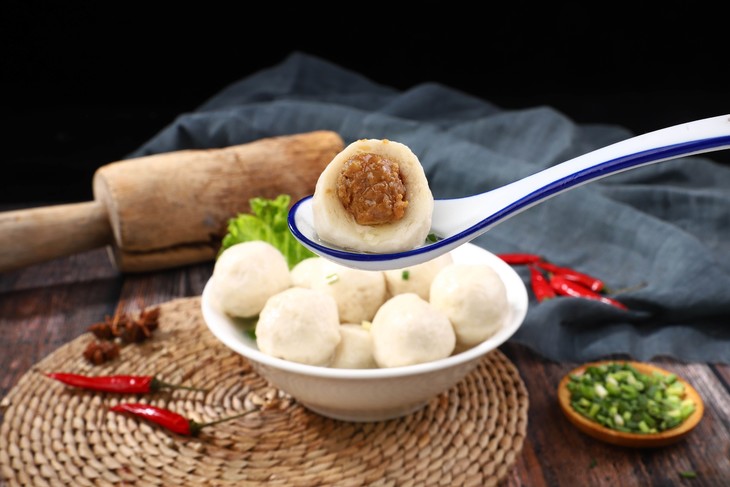 福州鱼丸的肉馅选用的是福建精选状元黑猪肉,价格是普通猪肉的两倍,取其肥瘦相间的去皮五花肉,洗净剁成肉浆。加入民天酱油(福建老字号)提鲜制作成馅。