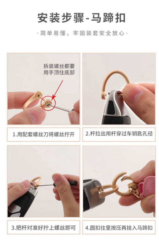 安装步骤超简单 马蹄扣牢固安心 用配套螺丝刀拧开螺丝 注意顶住底部 杆拉出穿过车钥匙孔径 操作无难度 把杆对准拧上螺丝 安装超便捷 圆扣按压挂入马蹄扣 固定超牢固 步骤简单易懂 新手也能轻松上手