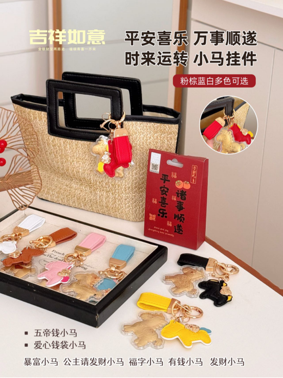 时来运转小马挂件·颜值与吉意并存! 金色小马+皮质挂绳 彩金撞色超亮眼 钱袋装饰更显贵气 粉白棕蓝等色系齐全 皮质挂带柔软耐用 金属挂扣 质感高级 暴富/福字等多款吉语可选 时来运转寓意超讨彩 精致的红色礼盒包装 印有“平安喜乐”“诸事顺遂”字样 送礼倍儿有面 挂在包上秒变吸睛小配饰