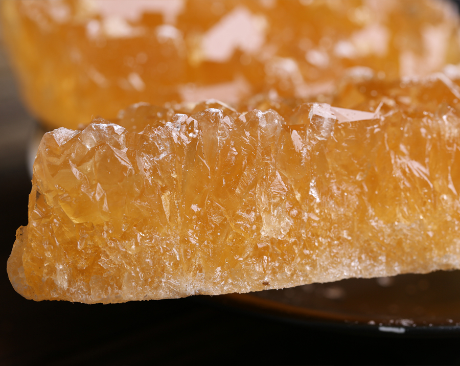 精选高纯度的黑蔗汁制成砂糖。按照古方融糖比混合后加热,提纯过滤后回锅熬制,提炼甘蔗汁自然结晶,一套完整的工艺下来,28天才能制成一批多晶老冰糖。