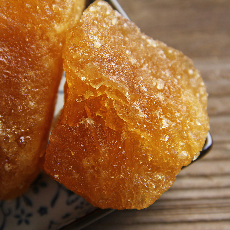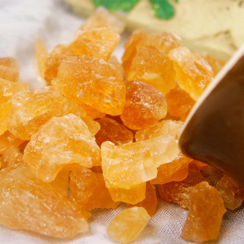 老冰糖又名土冰糖、老土冰糖、黄冰糖、块冰糖、多晶体冰糖等,是以甘蔗为原料,经压榨、除杂、清汁、蒸发、浓缩并添加适当结晶剂后,逐步冷却结晶制成,经敲碎干燥后即主为成品,其生产周期约为7天。