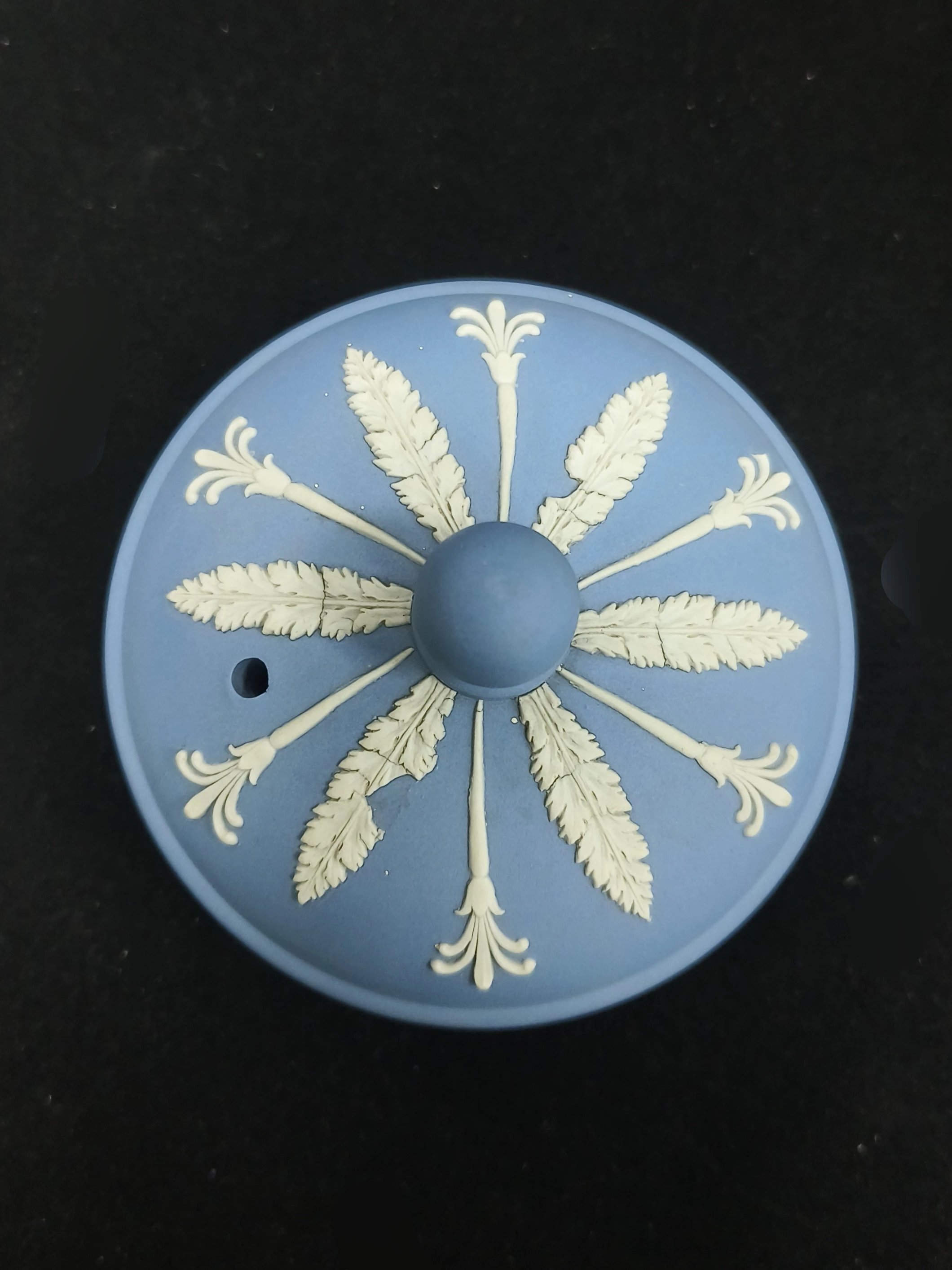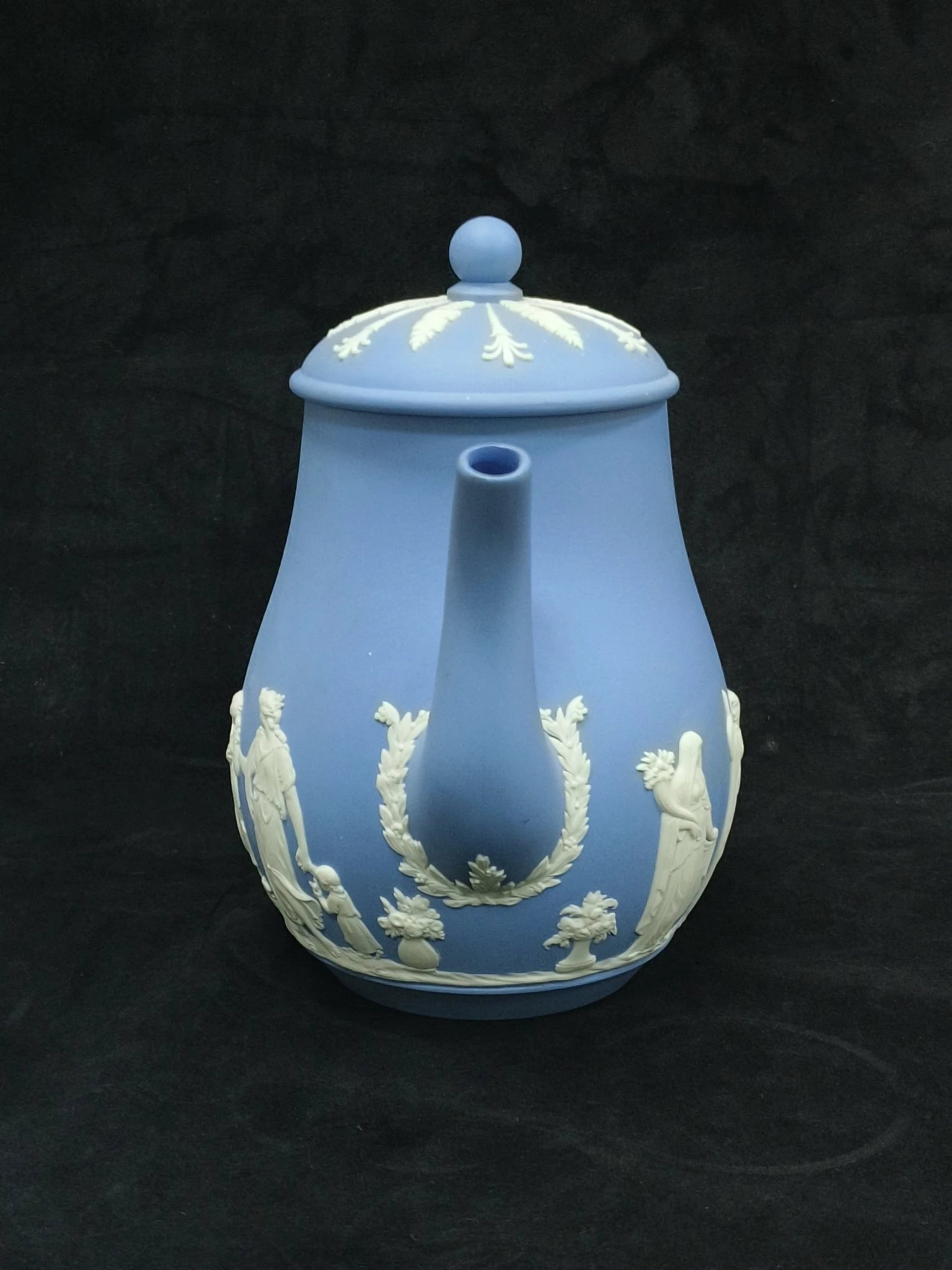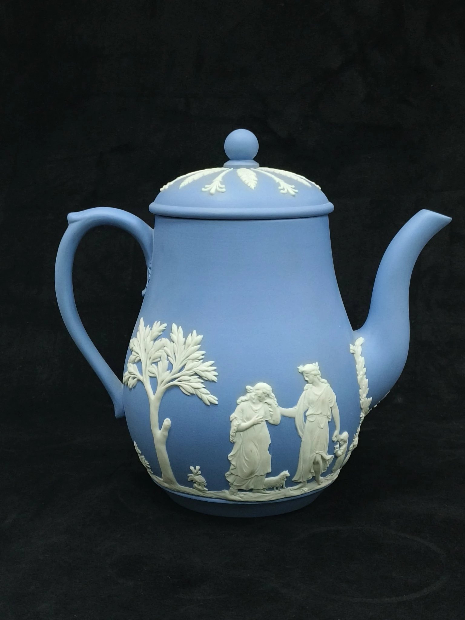 英产威基伍德碧玉浮雕茶壶。壶身是经典的蓝色,两侧浮雕画片故事不同,但元素对称。壶嘴有一圈叶片浮雕,壶盖也有精美的装饰。壶盖堆白有损。高18.5,1280出。
