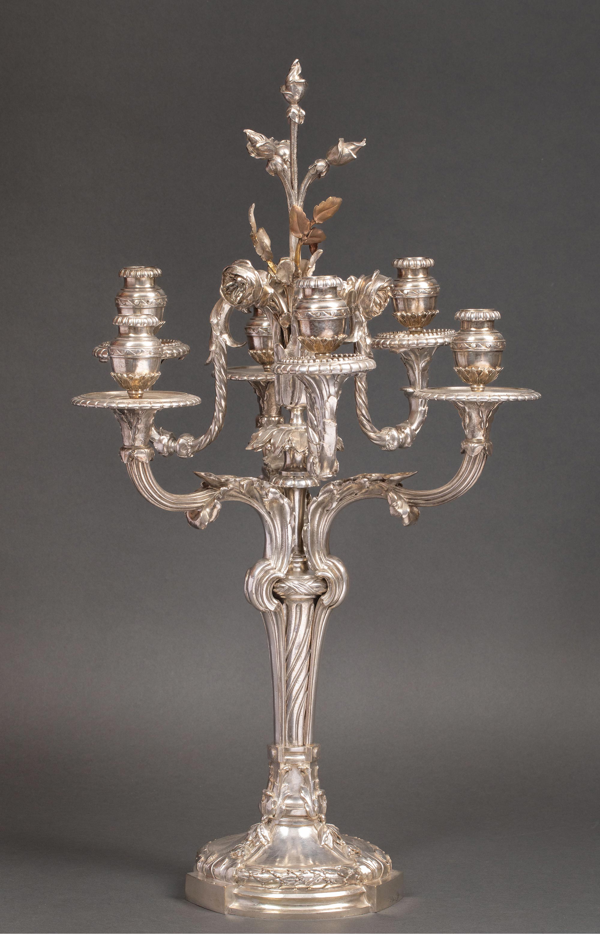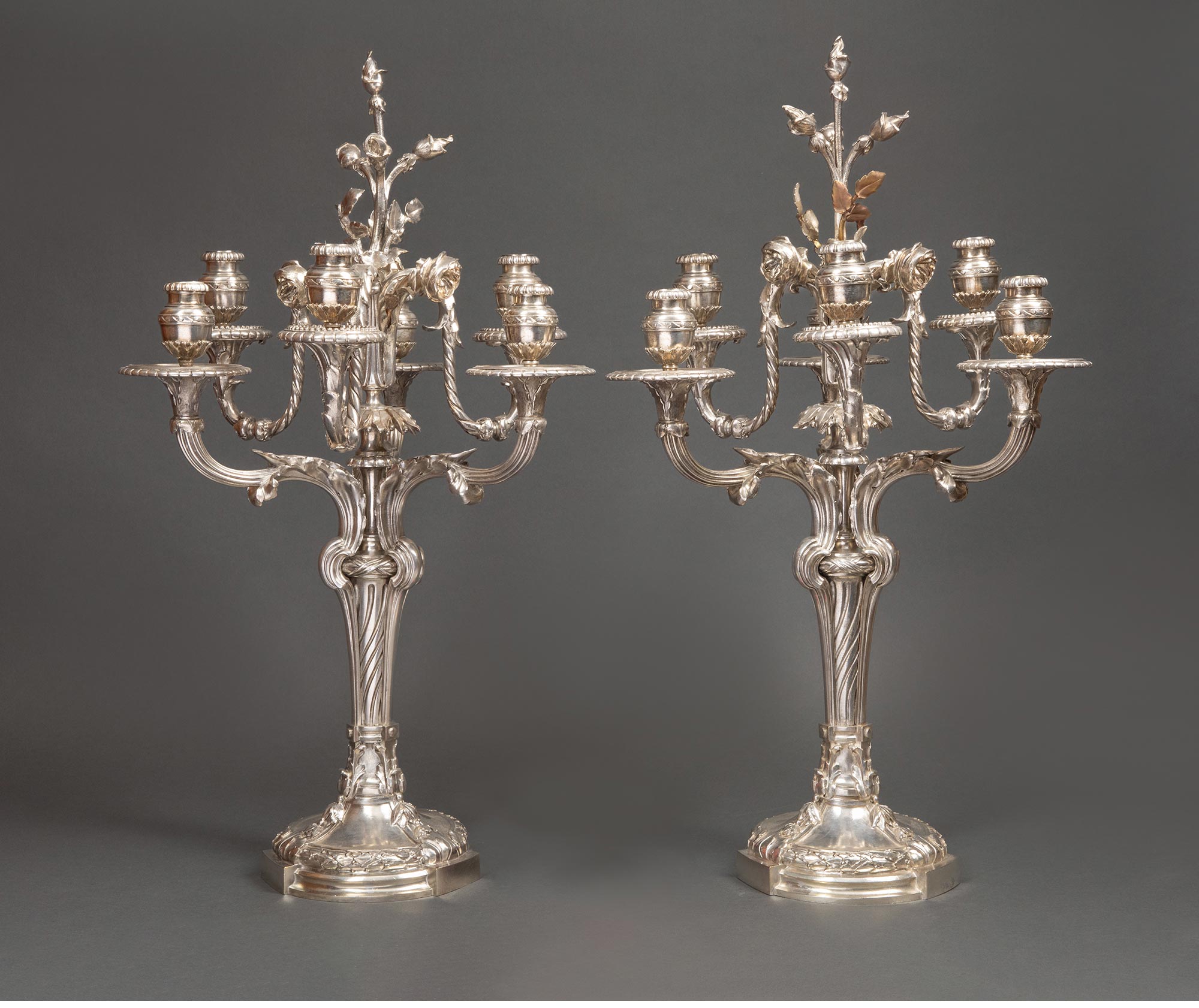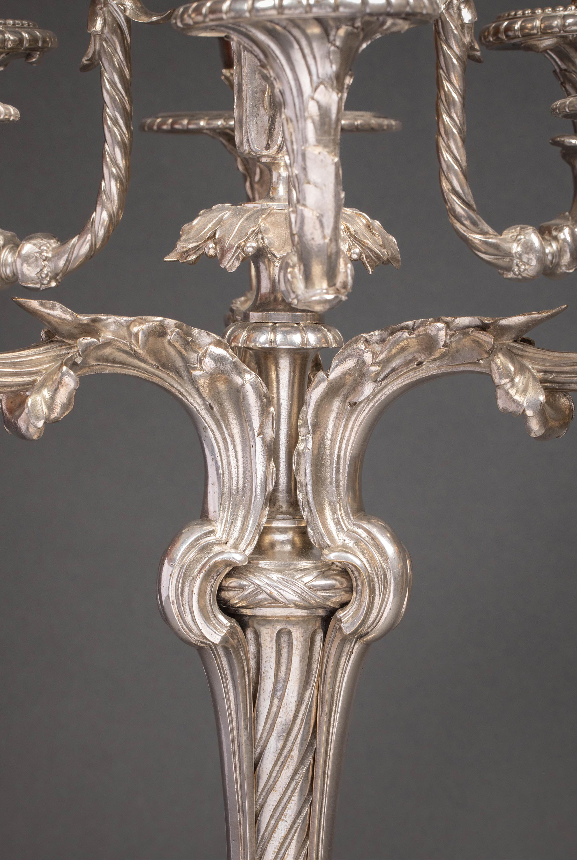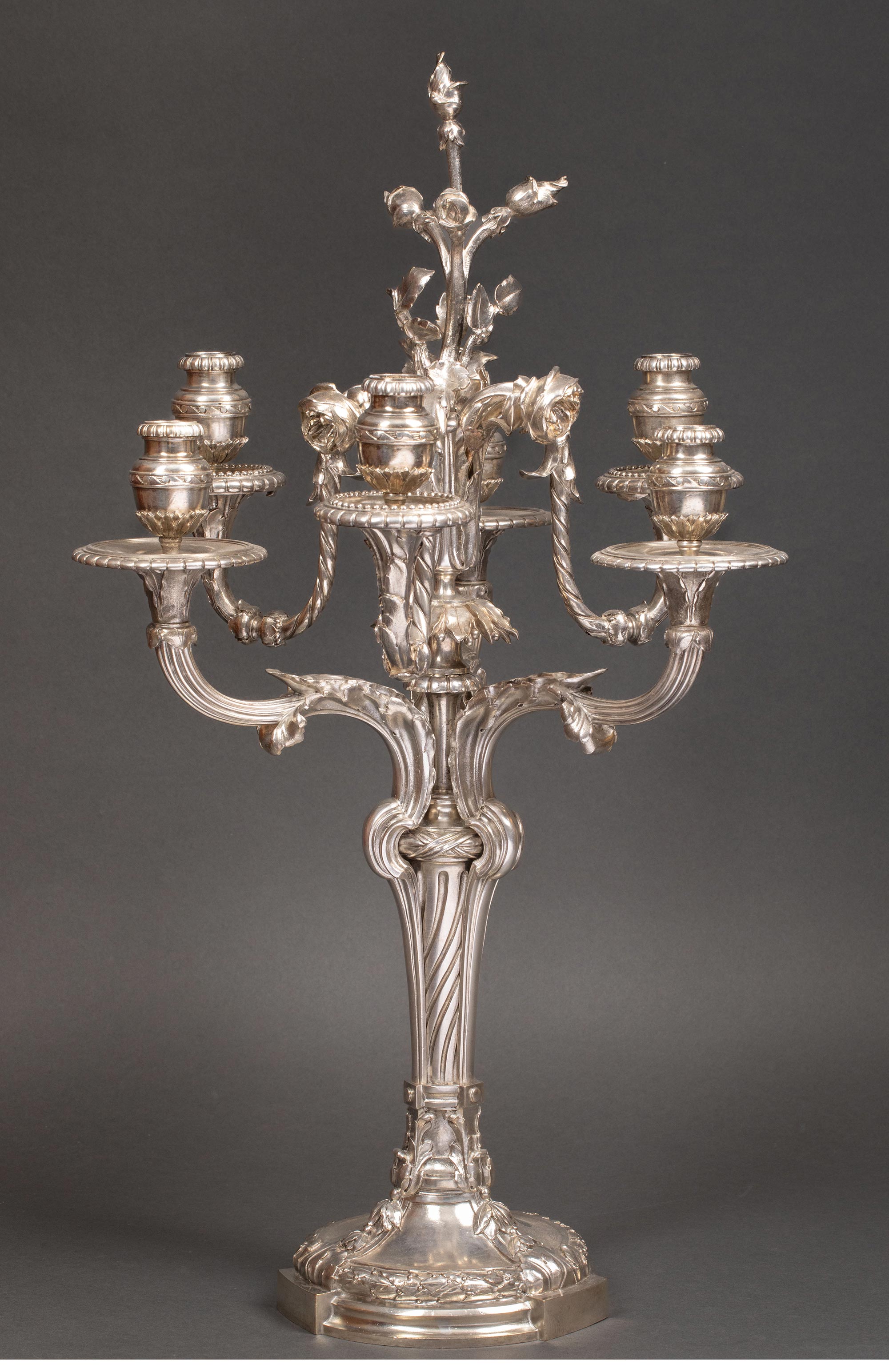 19世纪法国出品路易十五风格玫瑰花叶主题镀银精雕六枝头烛台一对