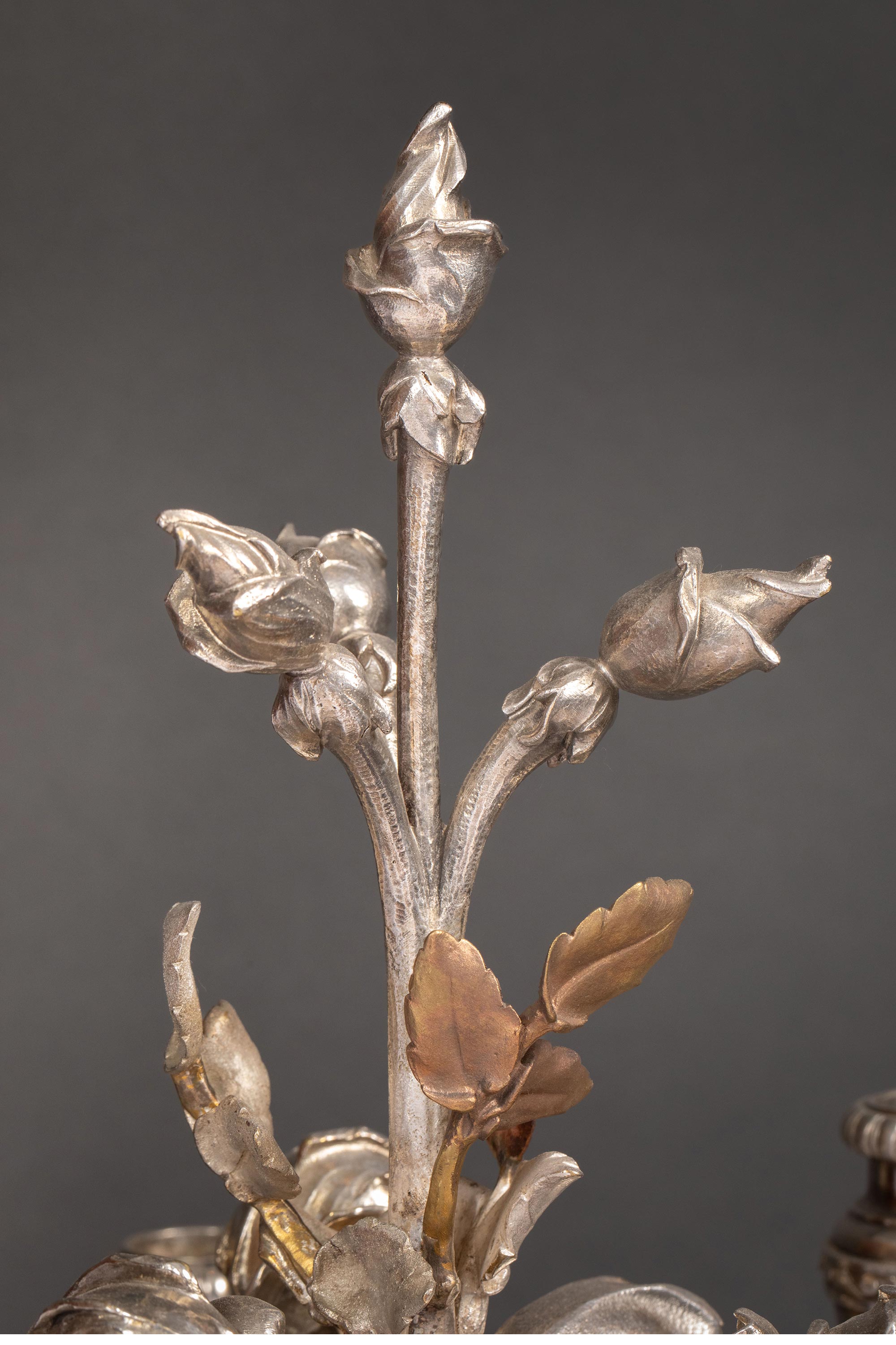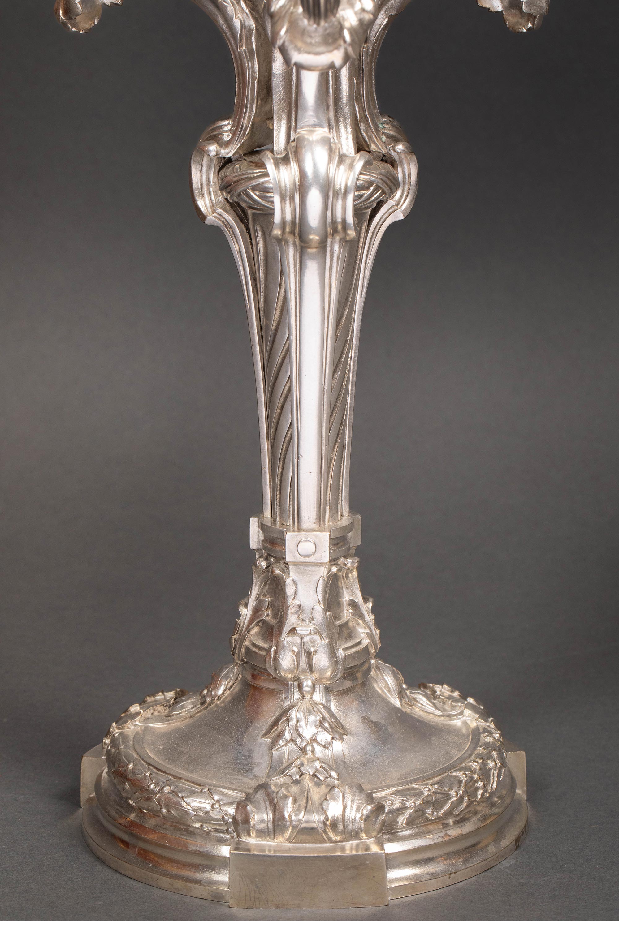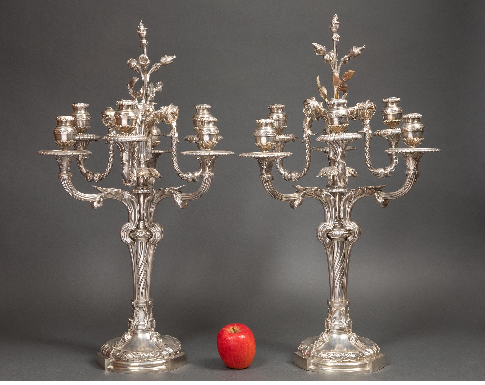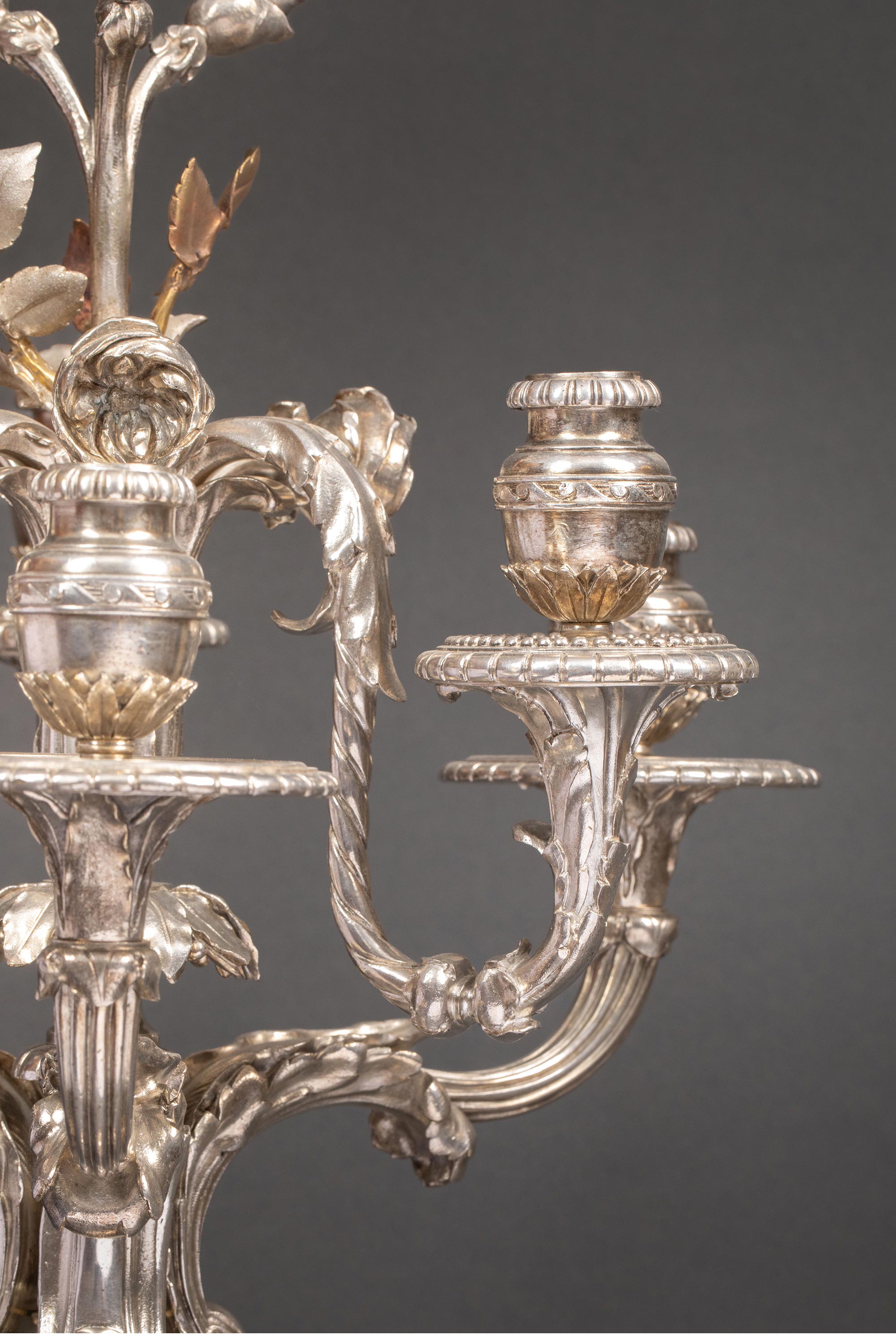 19世纪法国出品路易十五风格玫瑰花叶主题镀银精雕六枝头烛台一对