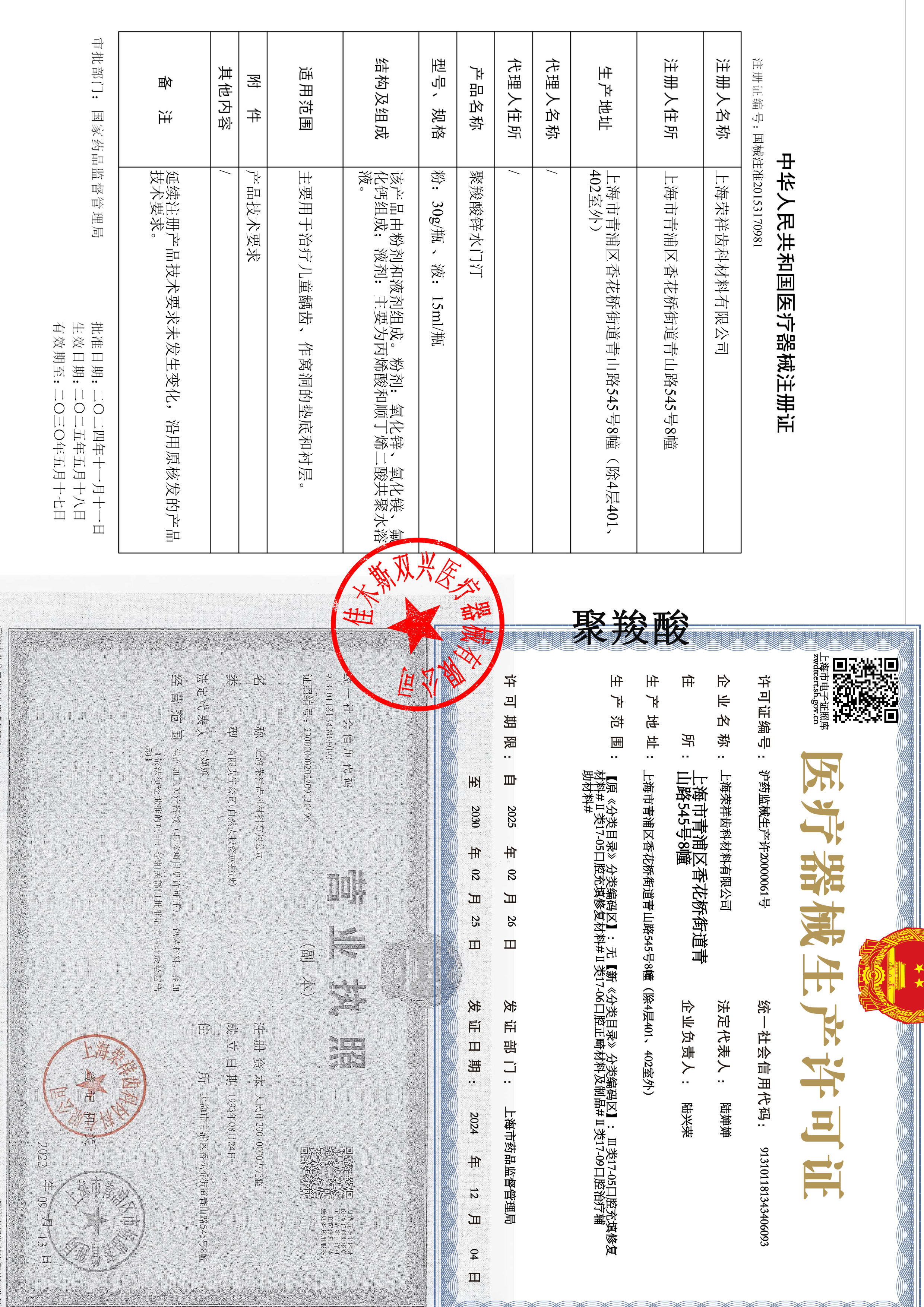 医疗器械产品名称: 上海荣祥聚羧酸锌水门汀