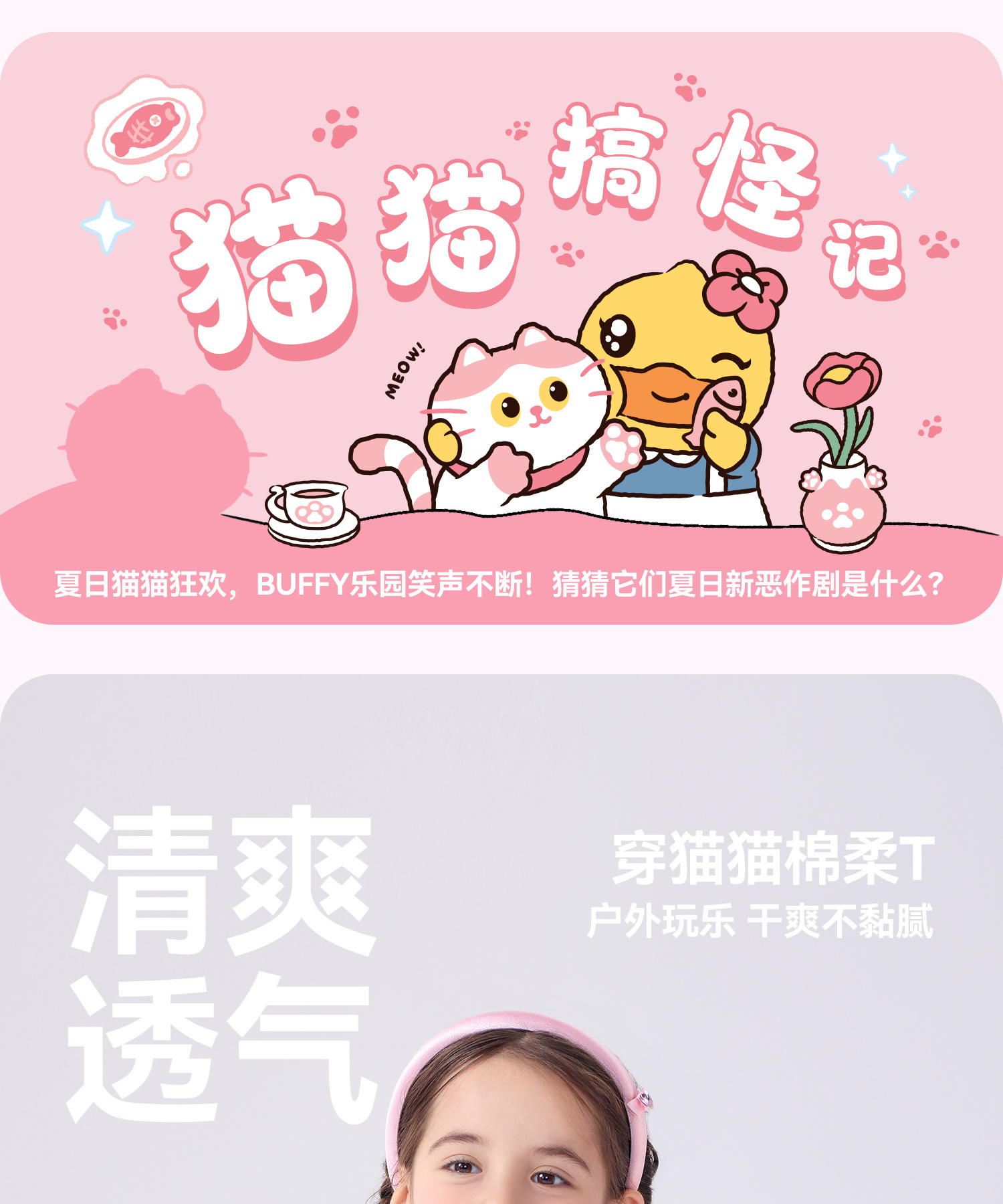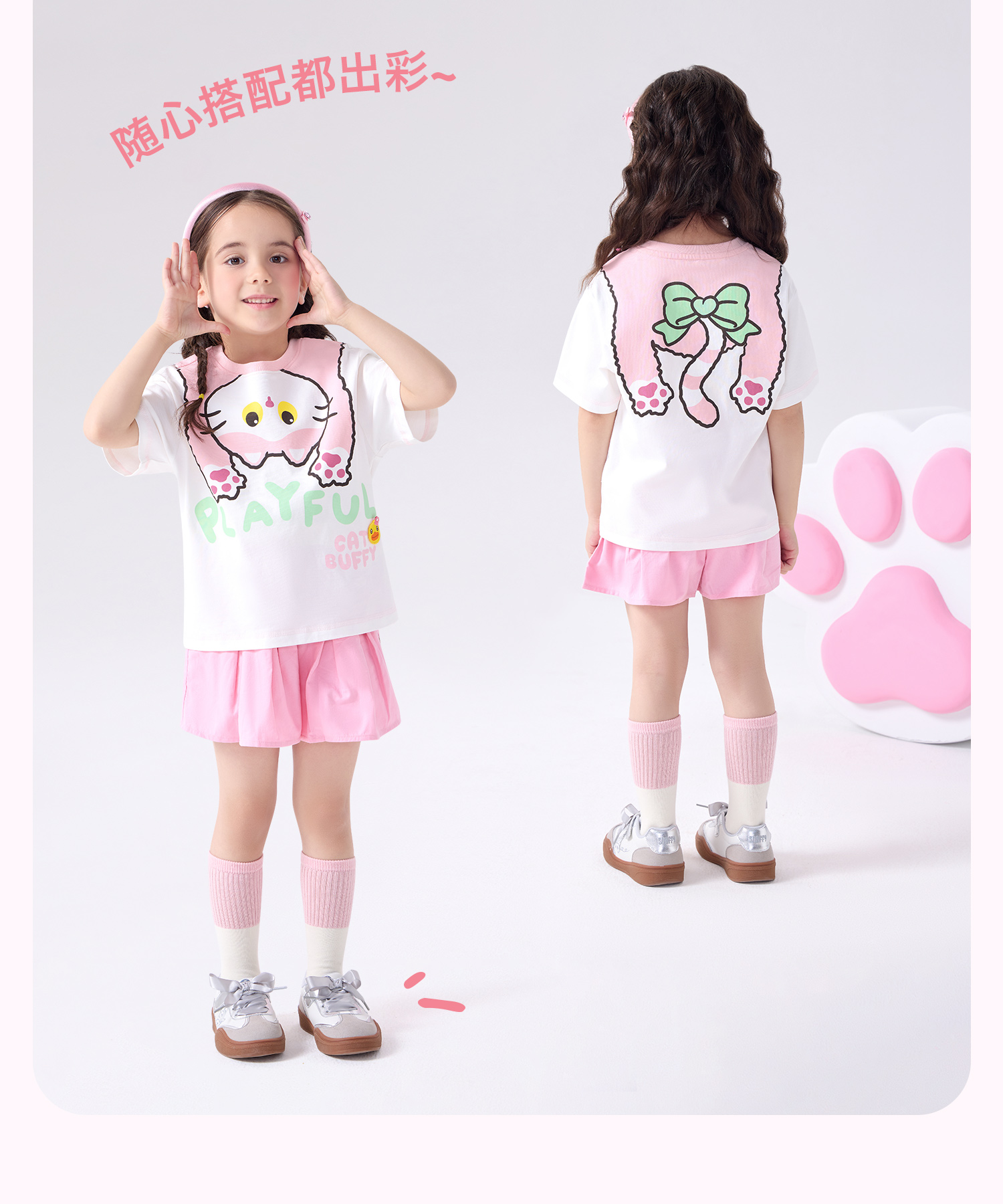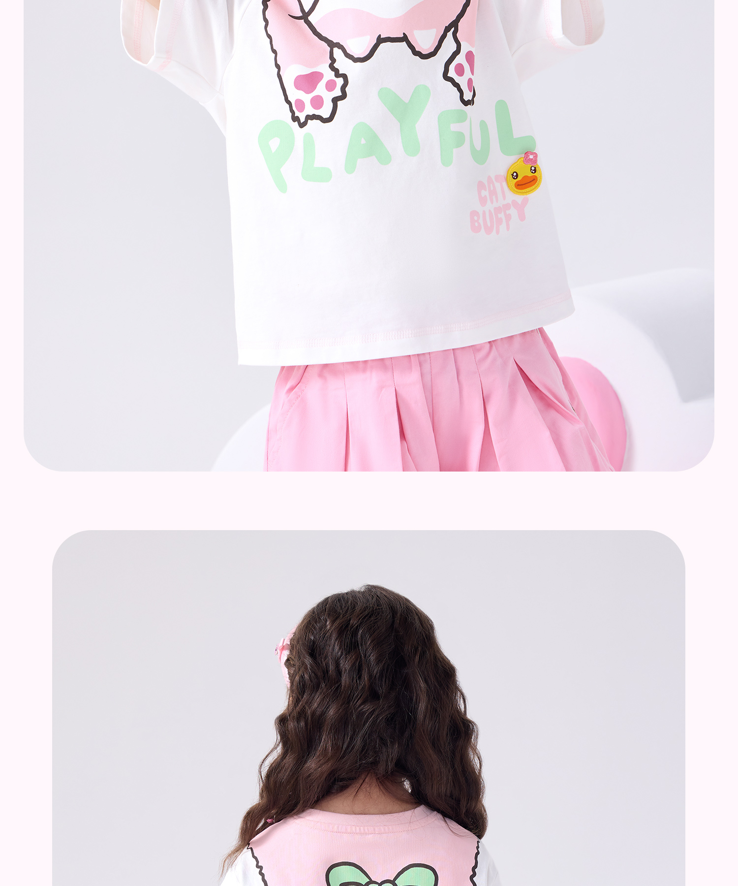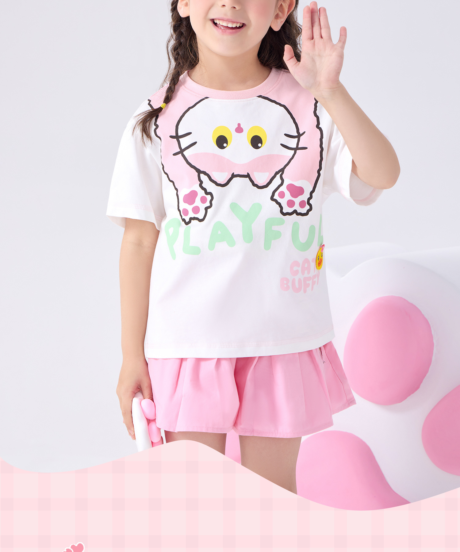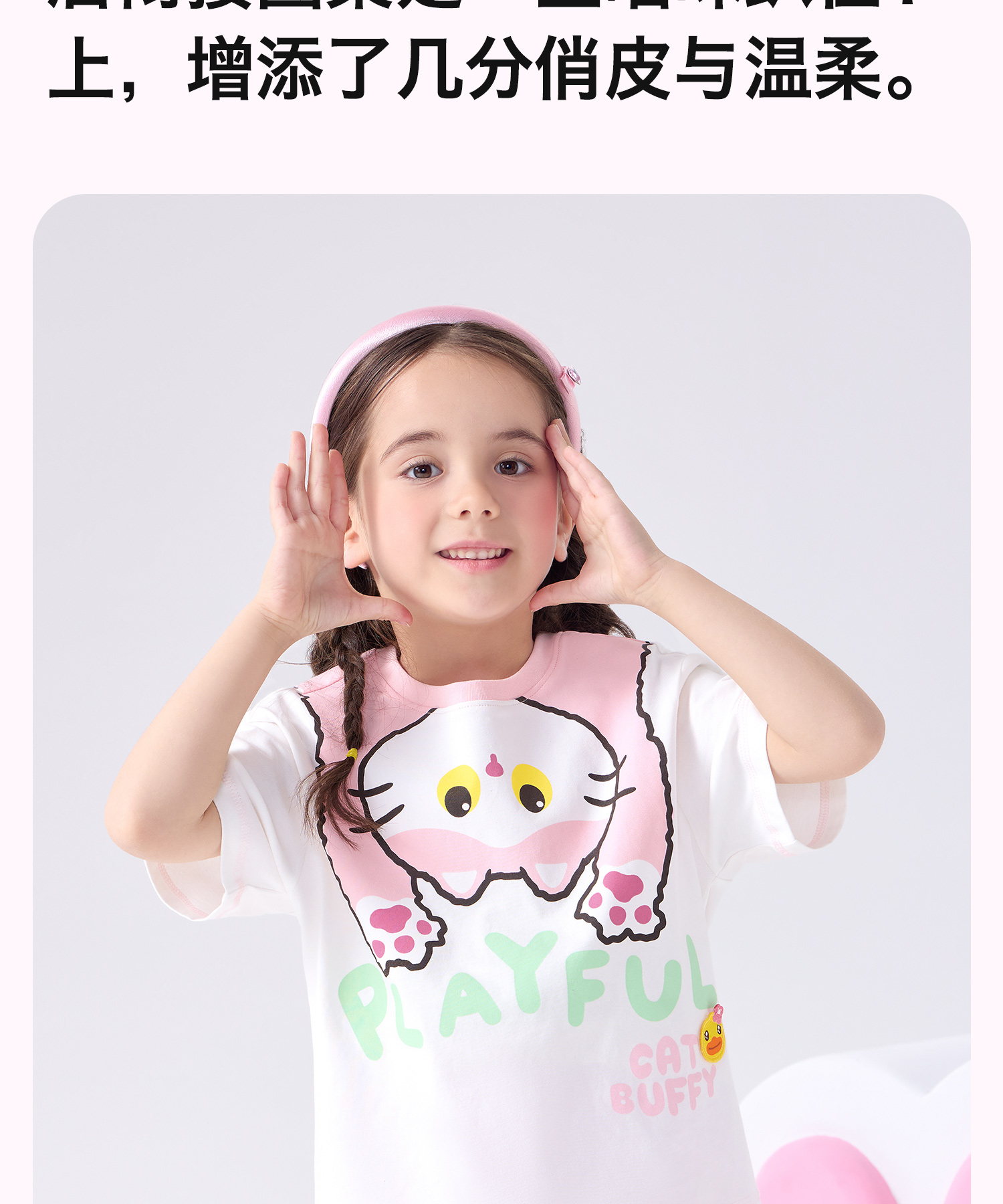bduck小黄鸭童装夏季童女童T恤短袖夏装纯棉猫咪印花儿童半袖上衣薄款105-150 FF2601013